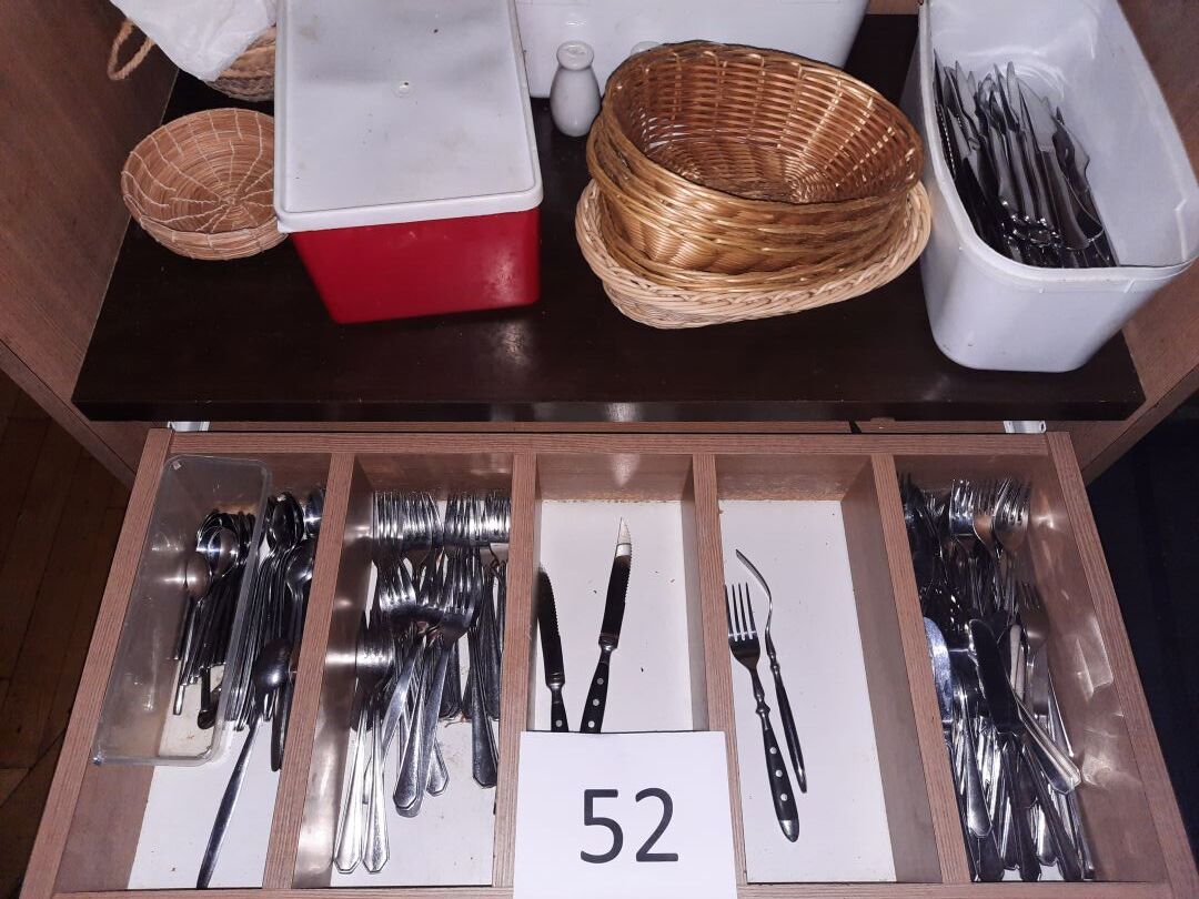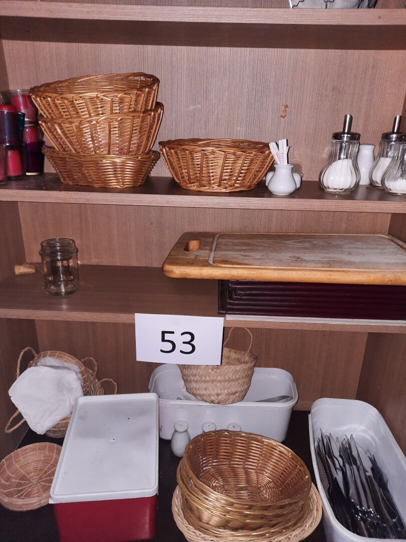 Environ 250 assiettes (rondes, creuses, carrées) en faïence (blanche, verte, bleue) Environ 80 couverts On joint : Diverses corbeilles à pain Salières, poivrières et sucriers