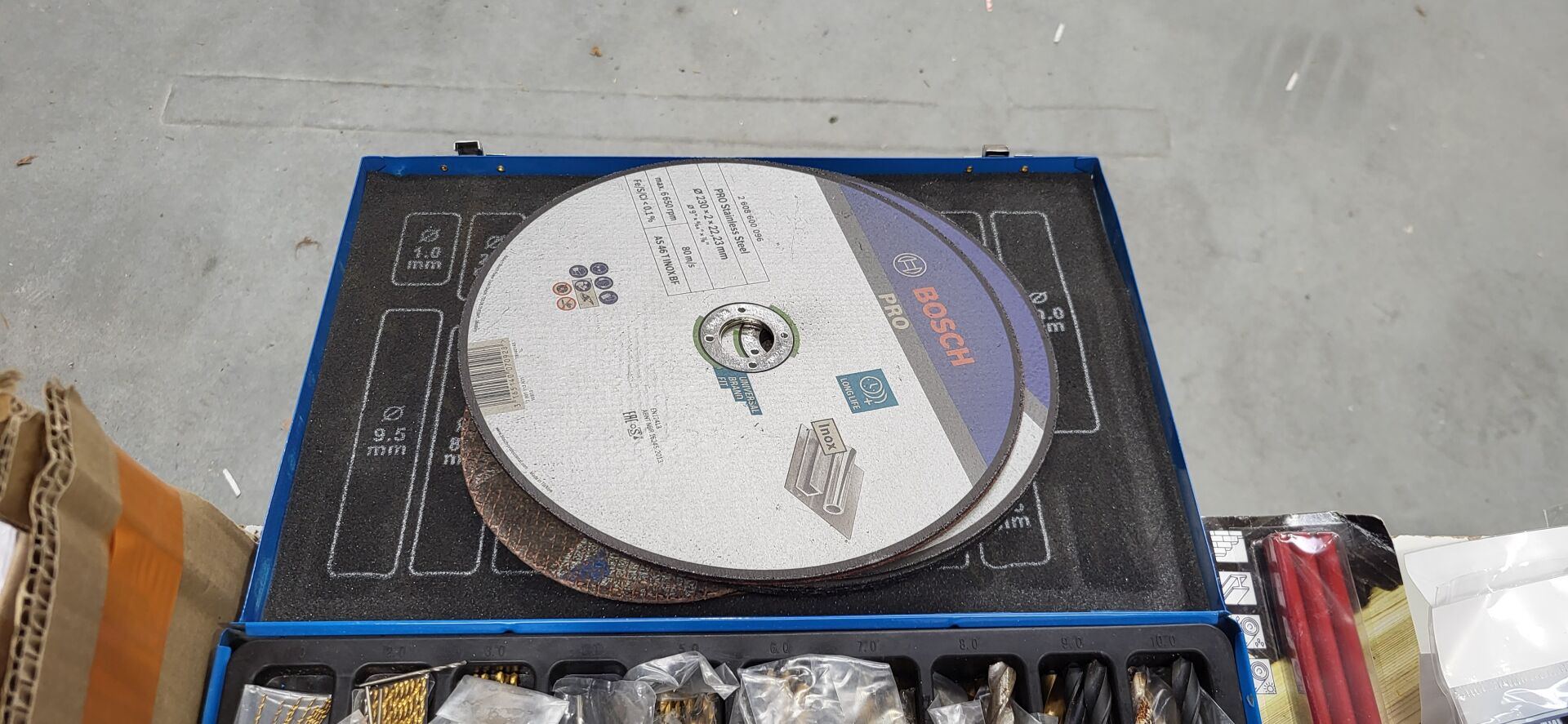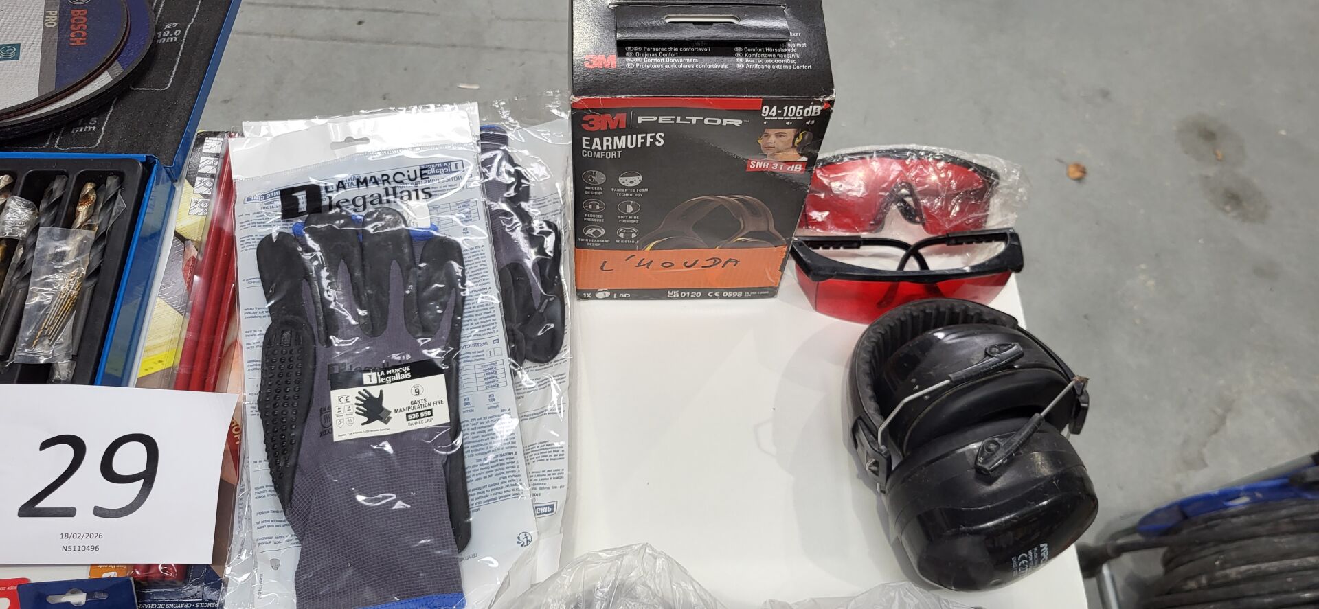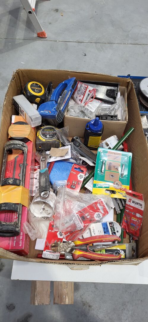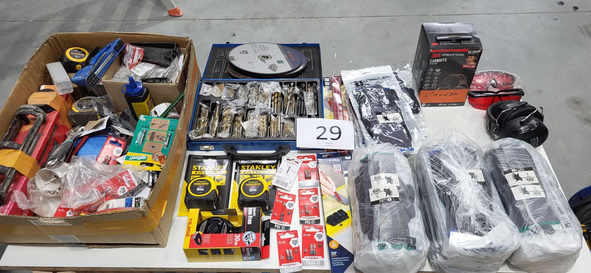 1 coffret à forets, 1 disque à meuler BOSCH , 2 mètres STANLEY , embouts MILWAUKEE, paire de gants LEGALLAIS dont tailles 8-9, casque anti bruit, lunettes etc
