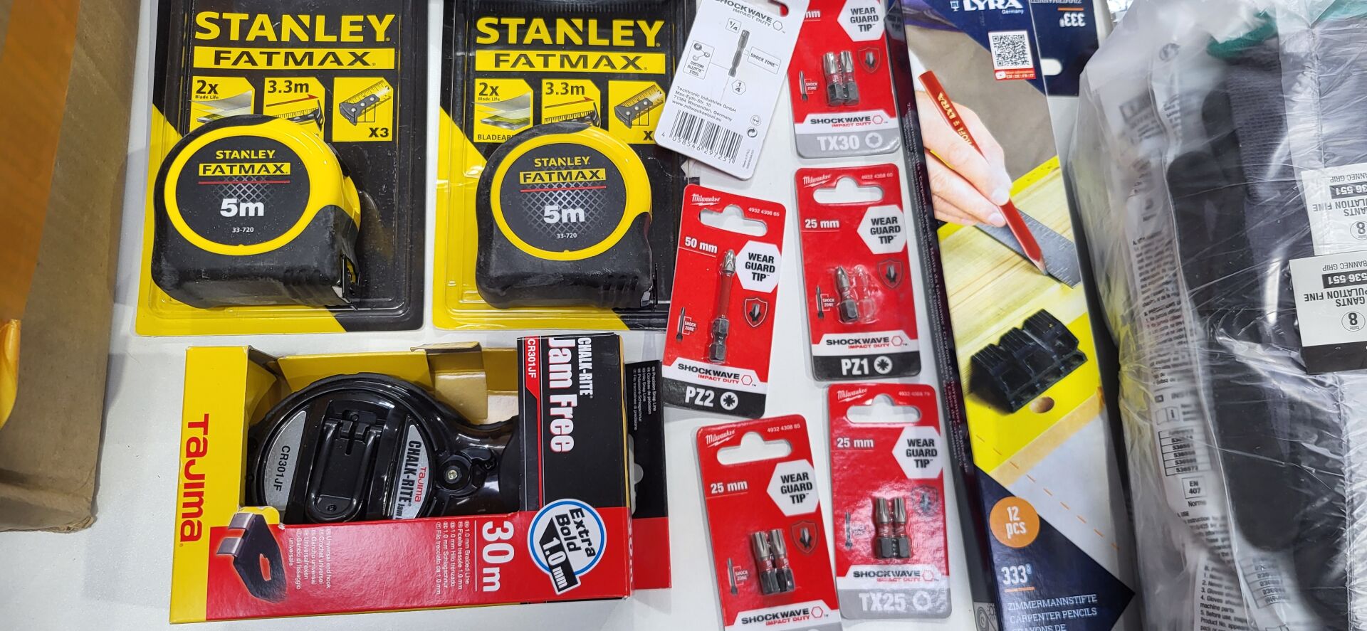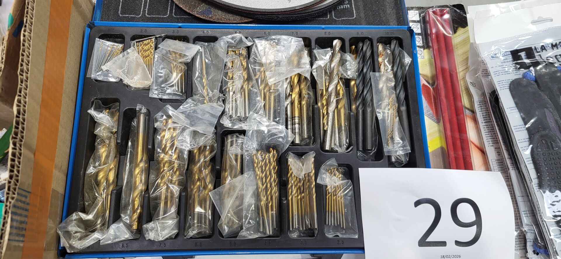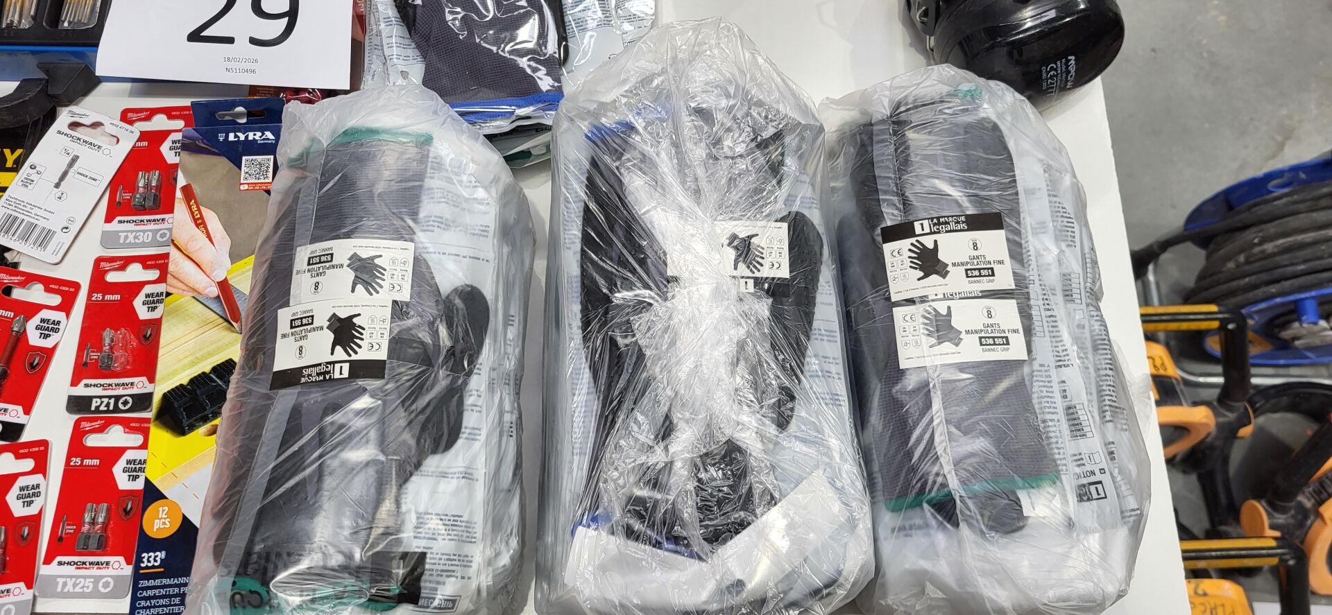 1 coffret à forets, 1 disque à meuler BOSCH , 2 mètres STANLEY , embouts MILWAUKEE, paire de gants LEGALLAIS dont tailles 8-9, casque anti bruit, lunettes etc