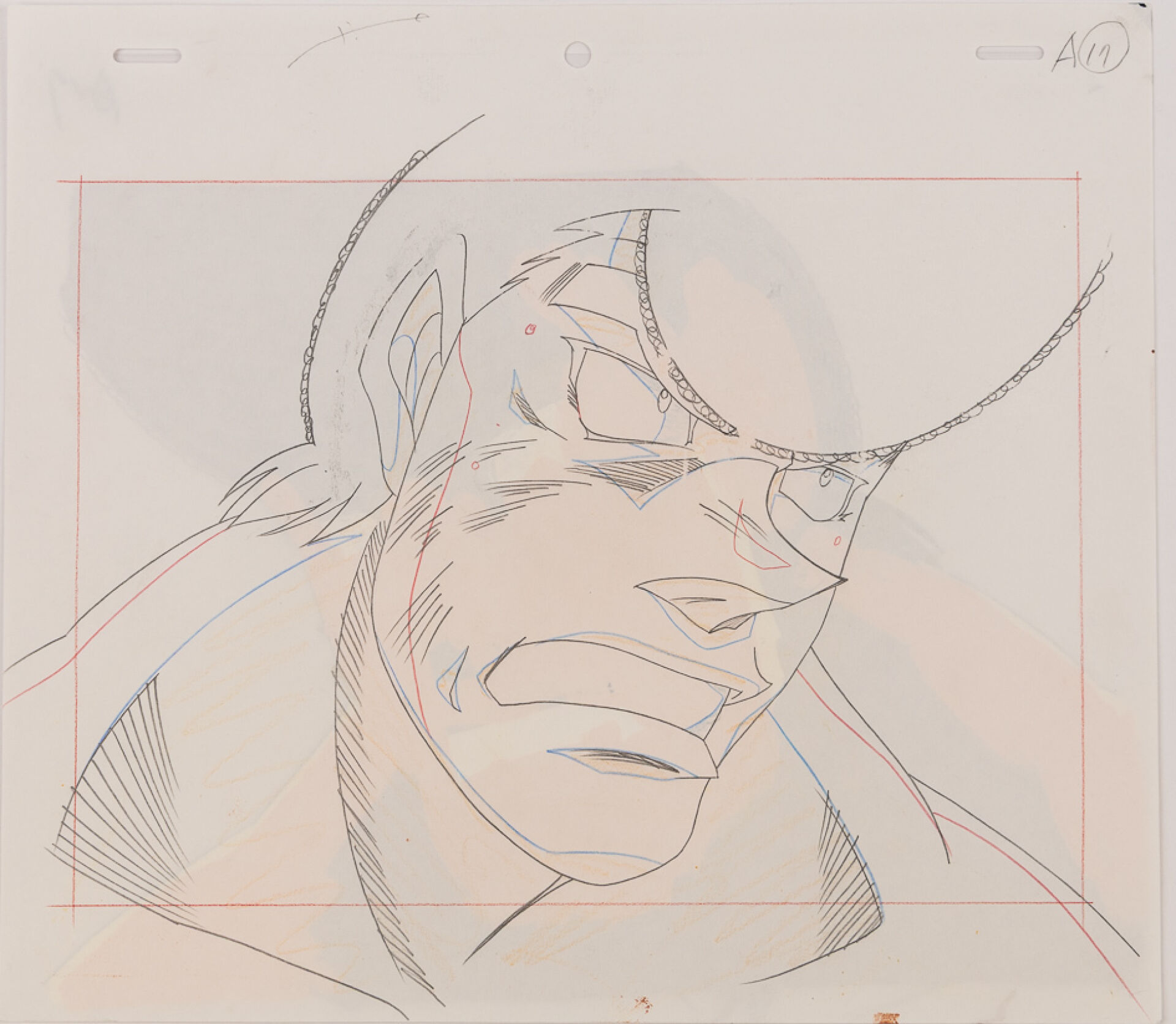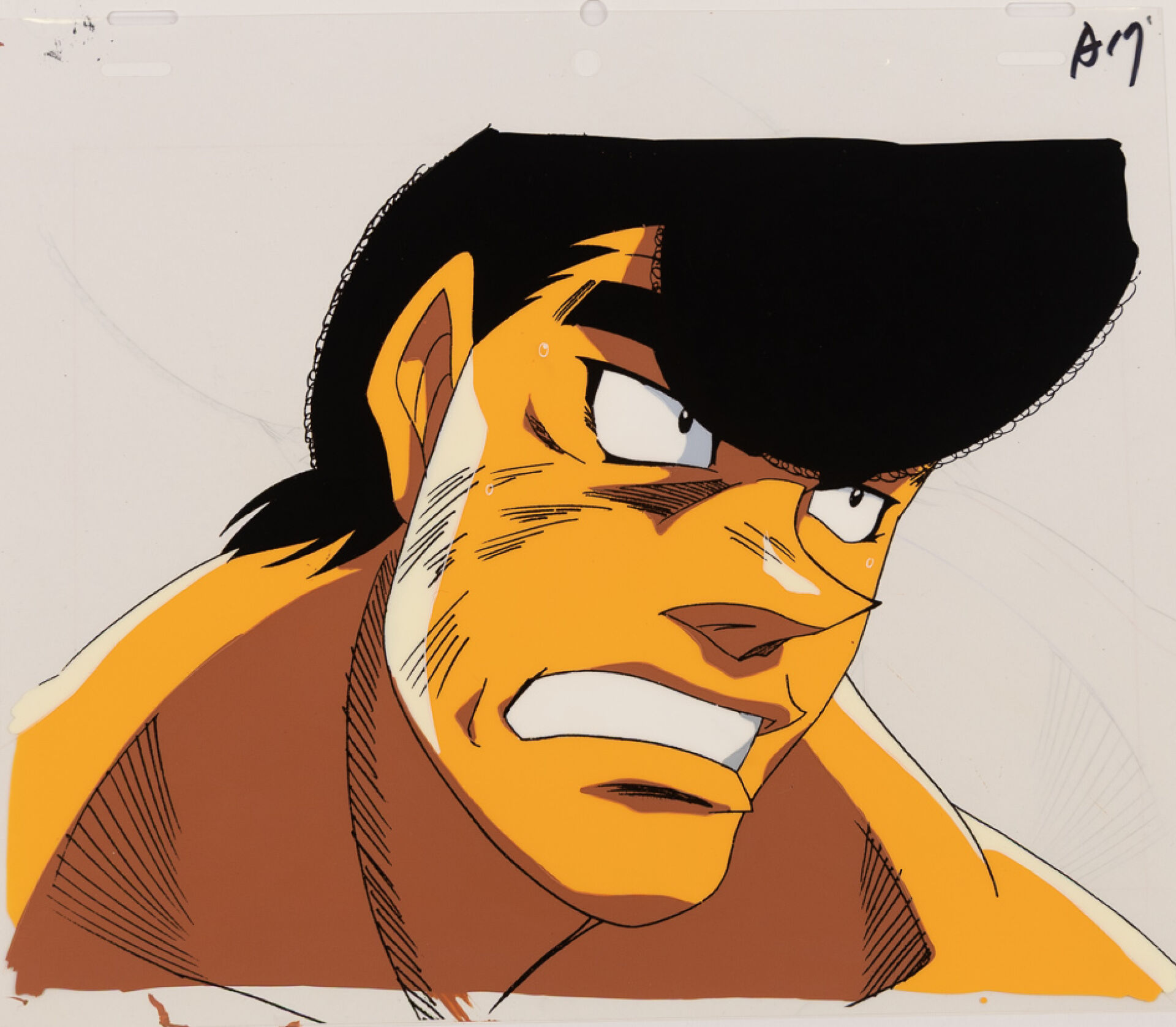d'après l'œuvre de George Morikawa (森川 ジョージ.Hajime no Ippo : New Challenger (はじめの一歩) - Ippo Makunouchi (幕之内一歩) Cellulo (cel / celluloïd) original à l'encre et à la gouache représentant Takamura en close-up numéroté A17 sur son dôga (Douga) collé, visible au dos. Haut. : 22,9 cm - Larg. : 26,6 cm pour le cellulo. Produit par studio Madhouse entre 2000 et 2002.