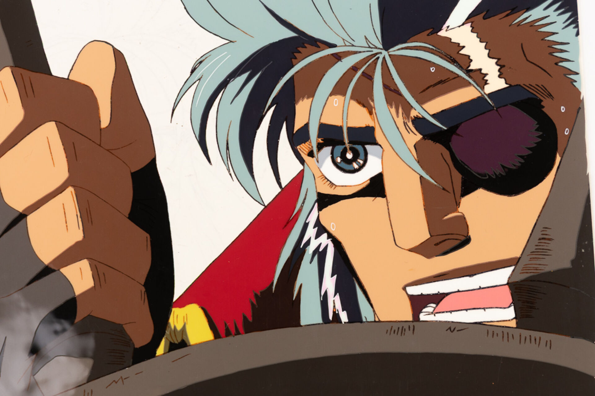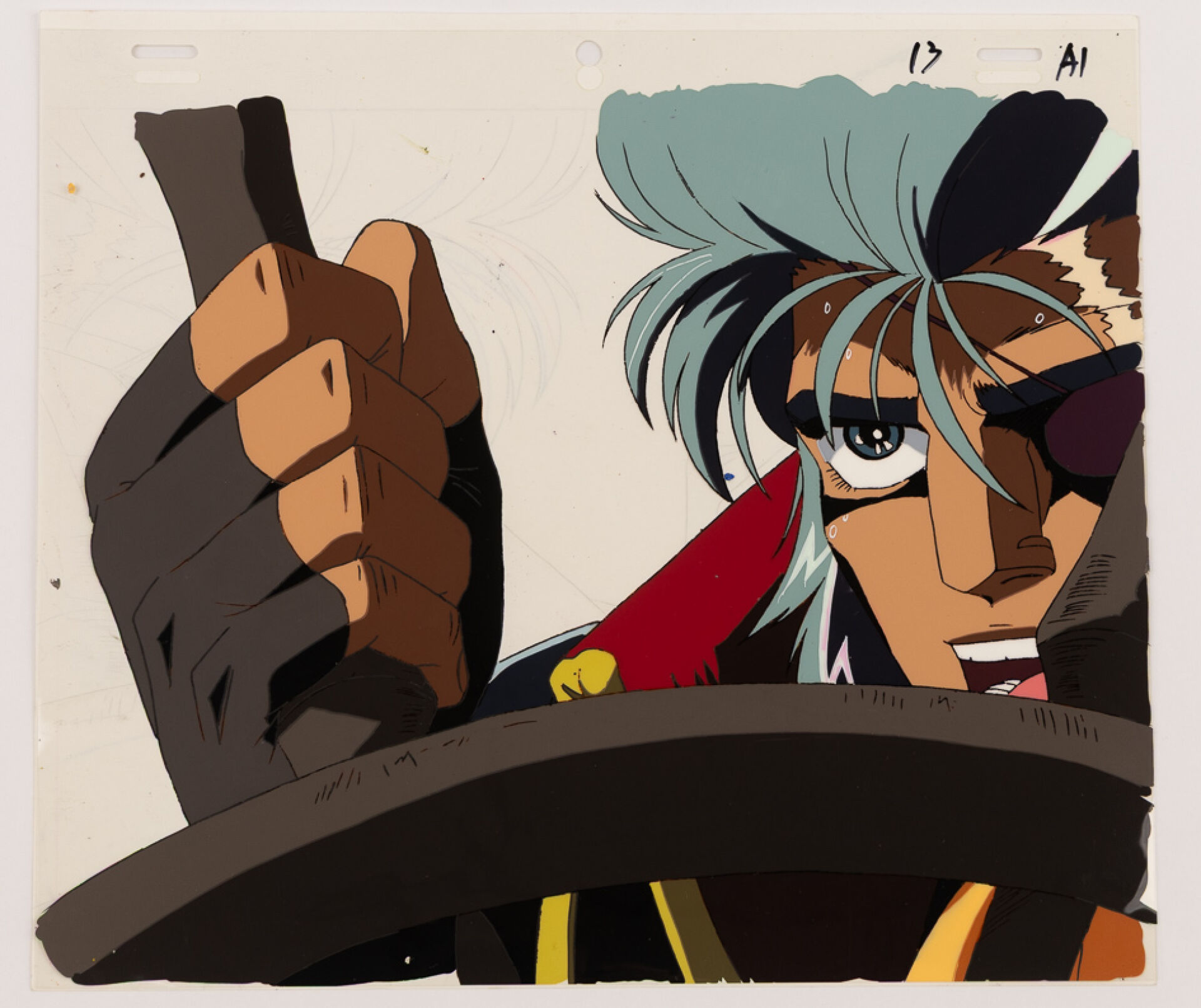 d'après l'œuvre de Osamu Dezaki (出﨑 統), d'après l'oeuvre de Herman Melville Hakugei: Legend of the Moby Dick (白鯨伝説) Deux cellulo (cel / celluloïd) originaux à l'encre et à la gouache numérotés 13 A1 et 13 A collés sur leur dôga (Douga) visible au dos représentant le capitaine Ahab à la barre, en close-up. Haut. : 23 cm - Larg. : 26,4 cm pour les cellulos.