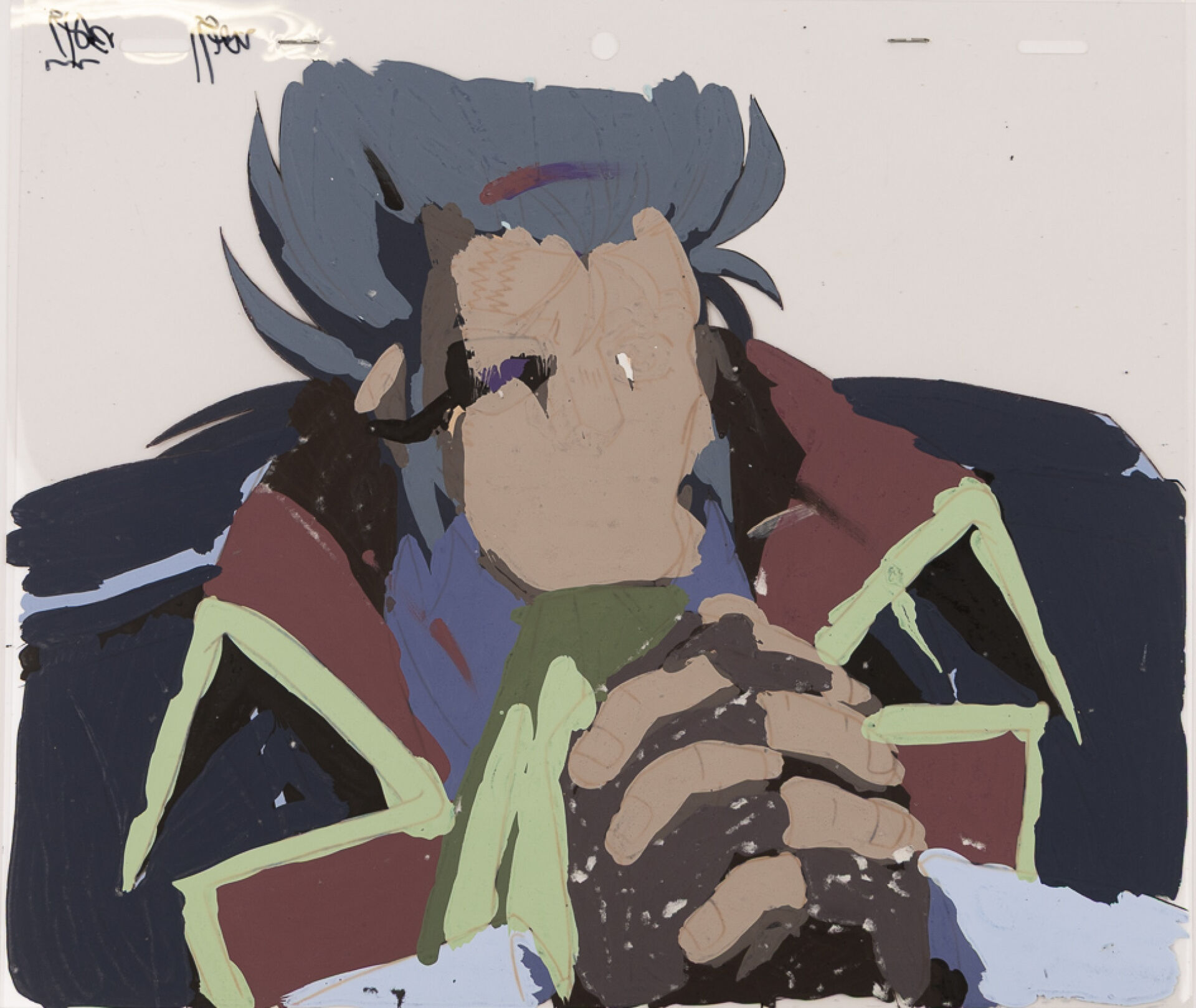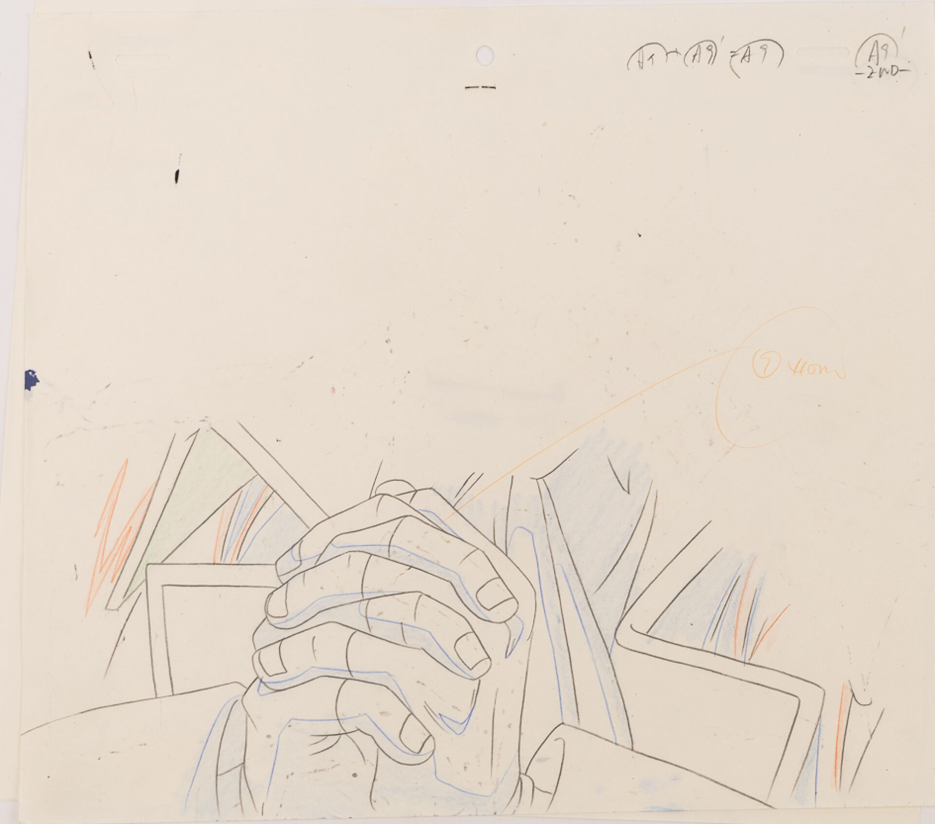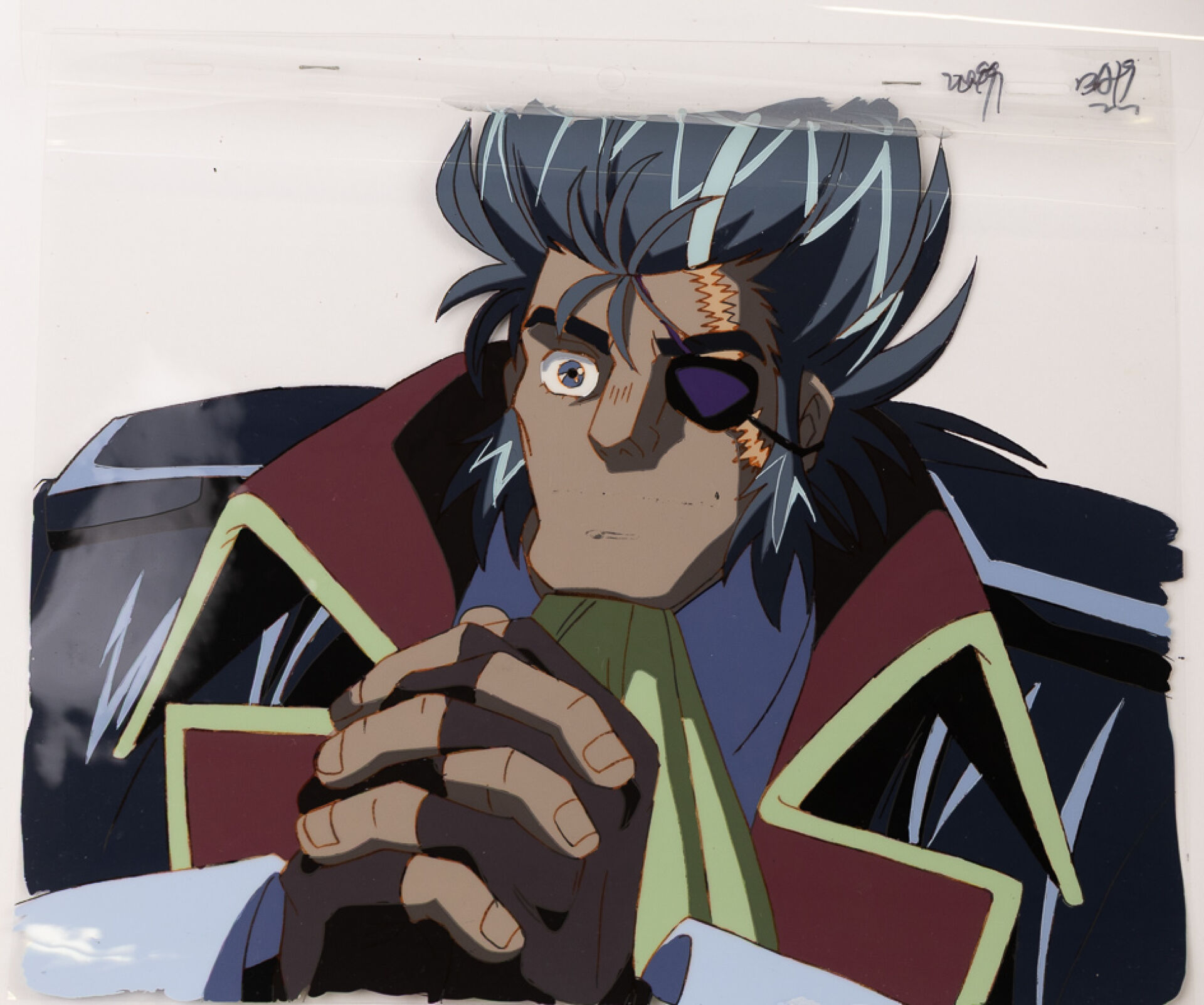 d'après l'œuvre de Herman Melville - Osamu Dezaki (出﨑 統) - Akio Sugino (杉野 昭夫) Hakugei: Legend of the Moby Dick (白鯨伝説) Cellulo (cel / celluloïd) deux couches original à l'encre et à la gouache numérotés B1 et A9 représentant le Capitaine Ahab en close-up les mains jointes, avec ses dôga (Douga) non collés. Haut. : 23 cm - Larg. : 26,4 cm pour le cellulo.