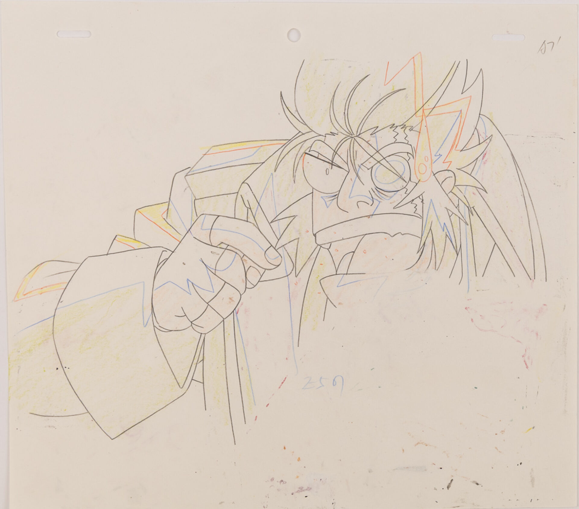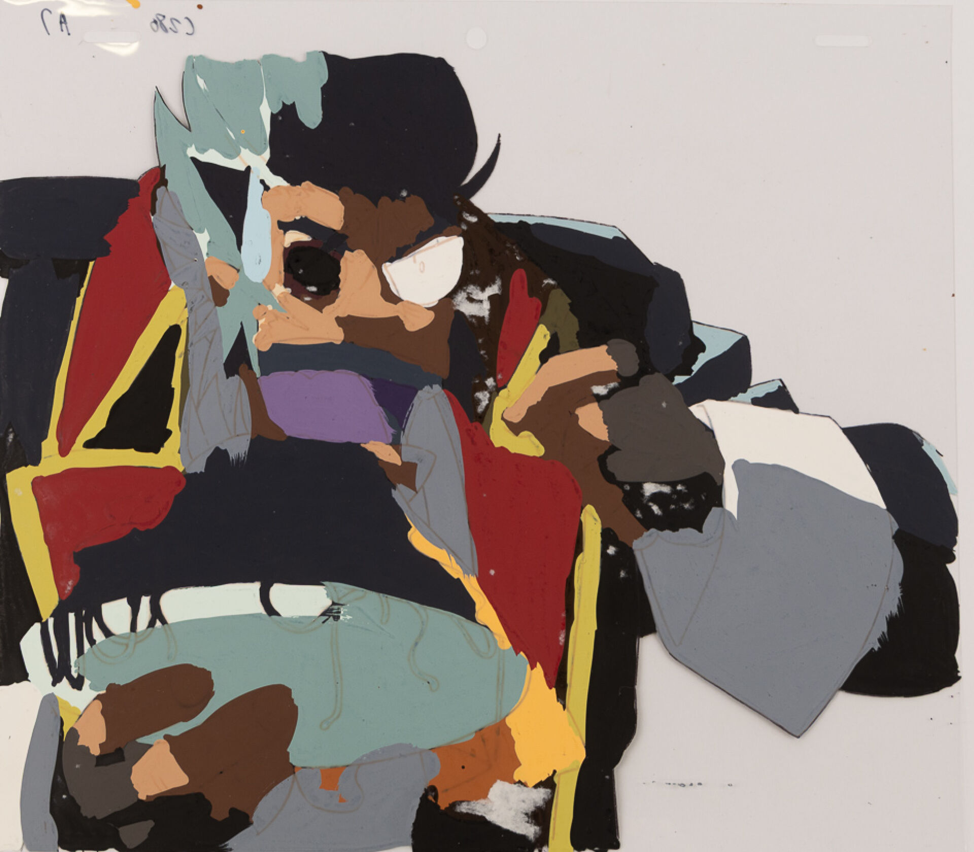 d'après l'œuvre de Herman Melville - Osamu Dezaki (出﨑 統) - Akio Sugino (杉野 昭夫) Hakugei: Legend of the Moby Dick (白鯨伝説) Cellulo (cel / celluloïd) original à l'encre et à la gouache représentant le Capitaine Ahab avalant un plat de soba à l'encre de seiche, numéroté A7, et son dôga (Douga) non collé. Haut : 23 cm - Larg. : 26,4 cm pour le cellulo.