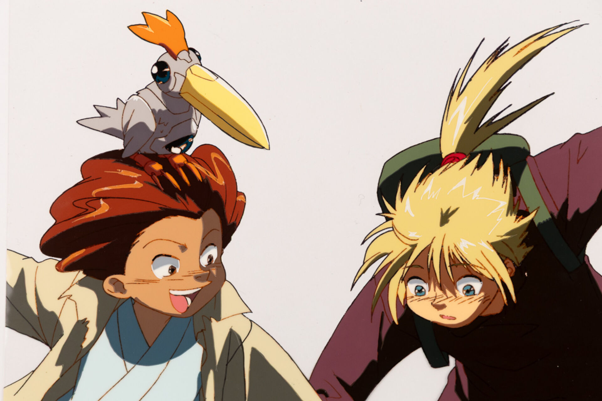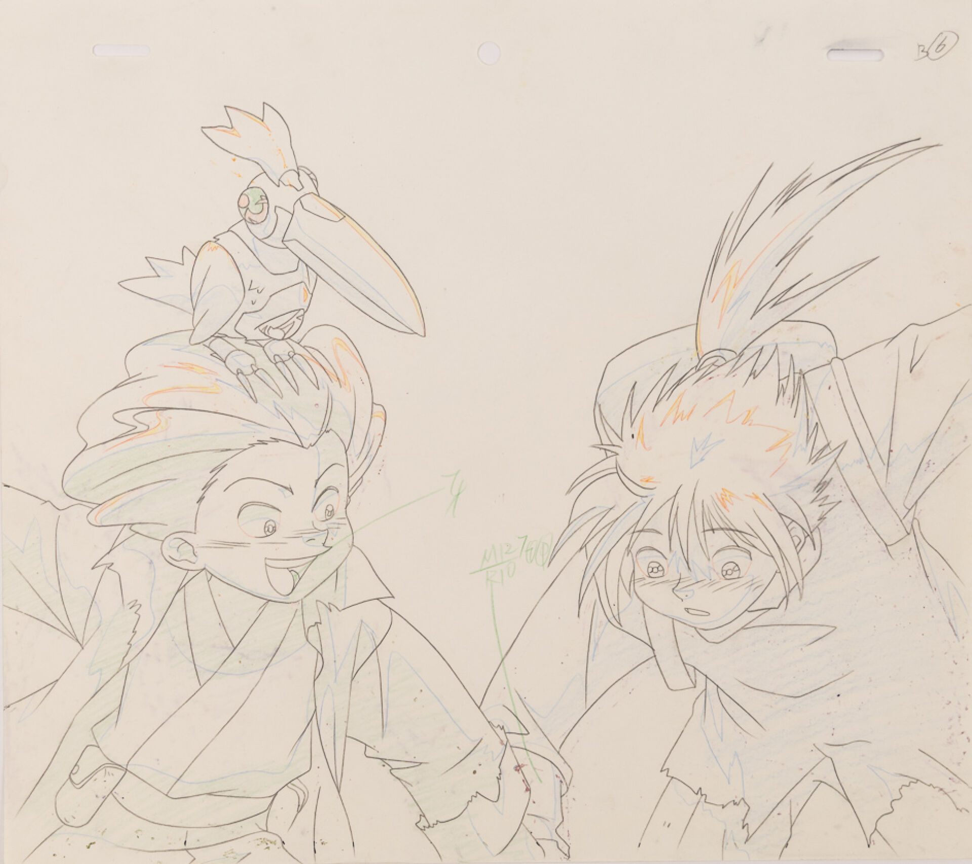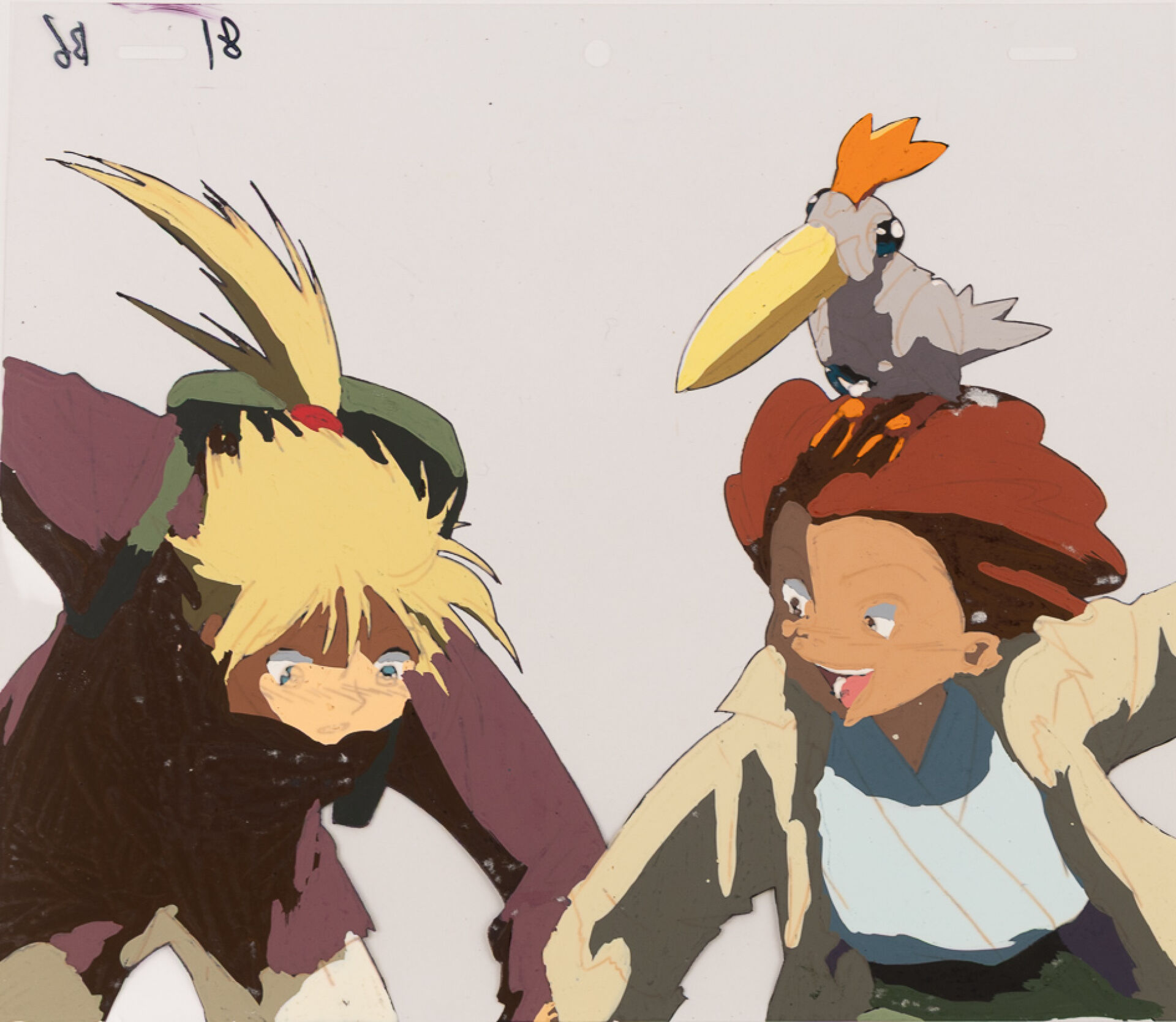 d'après l'œuvre de Herman Melville - Osamu Dezaki (出﨑 統) - Akio Sugino (杉野 昭夫) Hakugei: Legend of the Moby Dick (白鯨伝説) Cellulo (cel / celluloïd) original à l'encre et à la gouache représentant deux personnages l'un un oiseau sur la tête, numéroté B6,, et son dôga (Douga) non collé. Haut. : 23 cm - Larg. : 26,4 cm pour le cellulo.