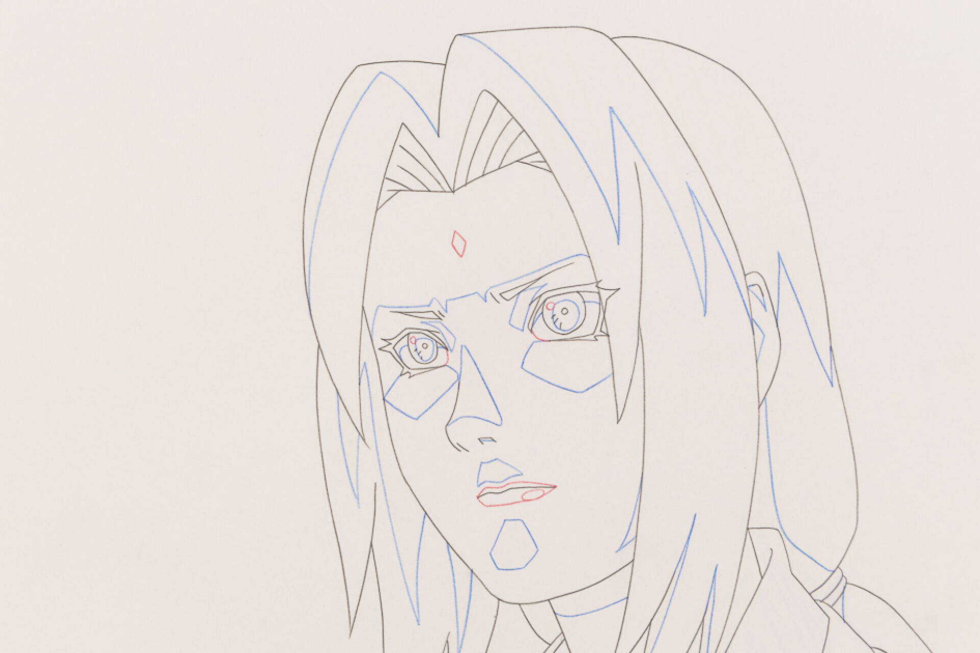 d'après l'œuvre de Masashi Kishimoto (岸本 斉史) et Hayato Date (伊達 勇登) - Naruto Shippûden (ナルト 疾風伝, signifiant littéralement : Naruto Chroniques de l'Ouragan) Huit dôga 5dOUGA° représentant Tsunade en close-up le visage pivotant, numérotés A1, A4 à A9. Haut. : 23 cm - Larg. : 29,9 cm pour le premier Haut. : 21 cm - Larg. : 29,7 cm pour les suivants. Produit par studio Pierrot.