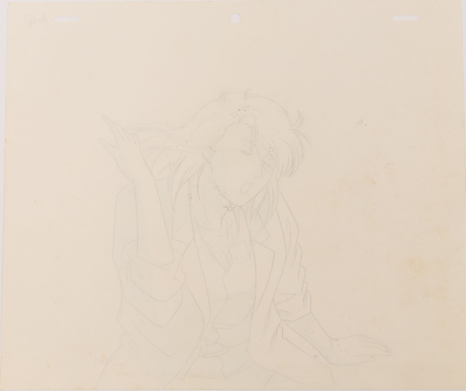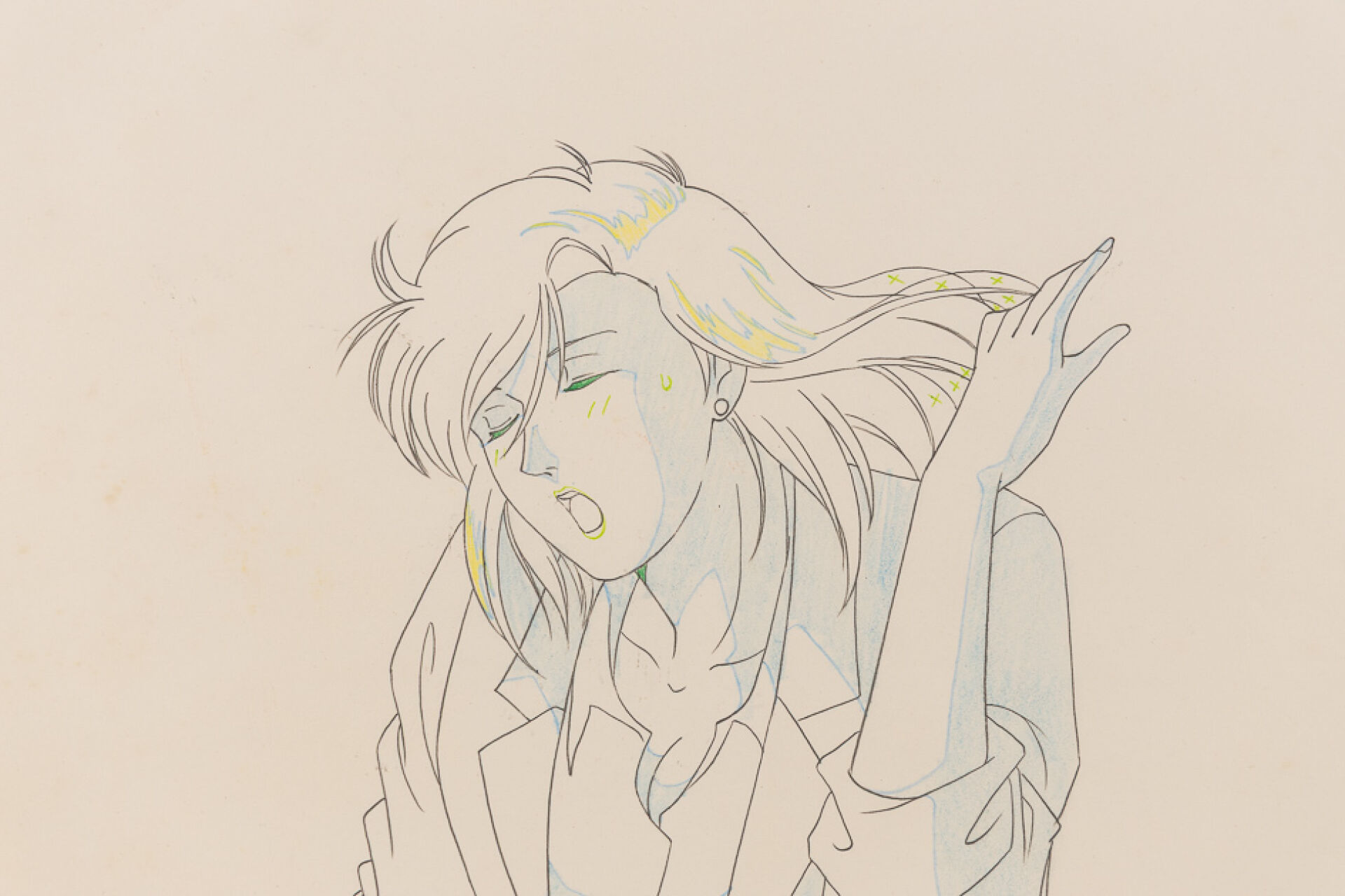 d'après l'œuvre de Tsukasa Hojo (北条 司) et Kenji Kodama (こだま 兼嗣) - Nicky Larson - City Hunter (シティーハンター) Dôga (Douga) à la mine de plomb et aux crayons de couleur, représentant le personnage d'Hélène Lamberti - Saeko Nogami dans une posture dynamique, numéroté A4. Haut. : 23,1 cm - Larg. : 27,2 cm. Produit par Sunrise en 1987-1991