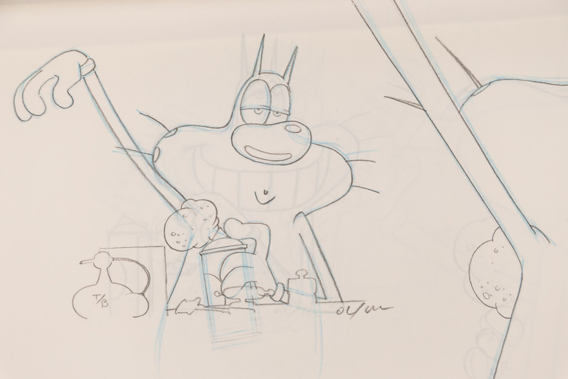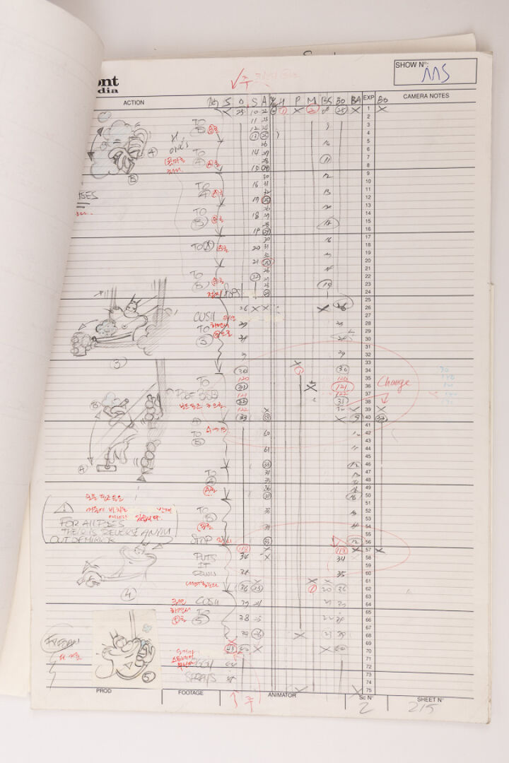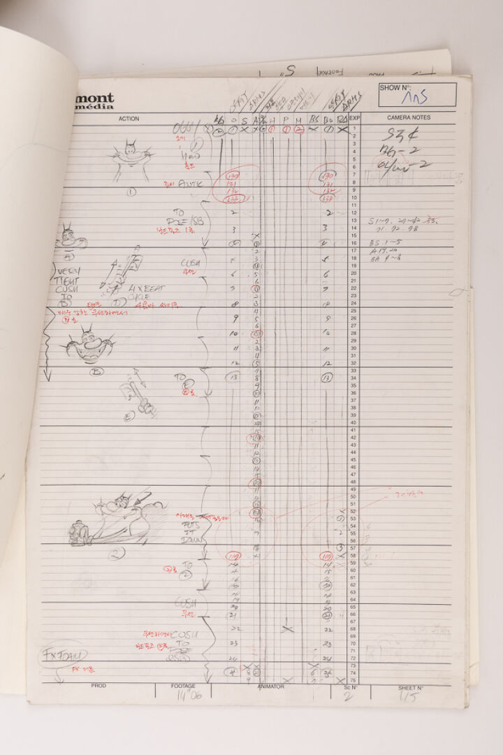 d'après l'œuvre de Jean-Yves Raimbaud et Olivier Jean-Marie - Oggy et les Cafards Ensemble de 8 dessins originaux à la mine de plomb et aux crayons de couleur mettant en scène Oggy à sa toilette. On y joint 5 time-sheets associées. Dim. (dessins) : Haut. : 26.6 cm x Larg. : 31,8 cm Dim. (time-sheet) : Haut. : 41,8 cm x Larg. : 29,6 cm Produit de 1998 à 2018