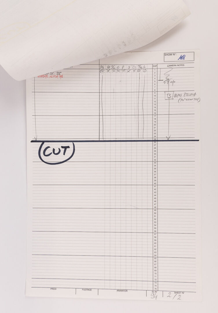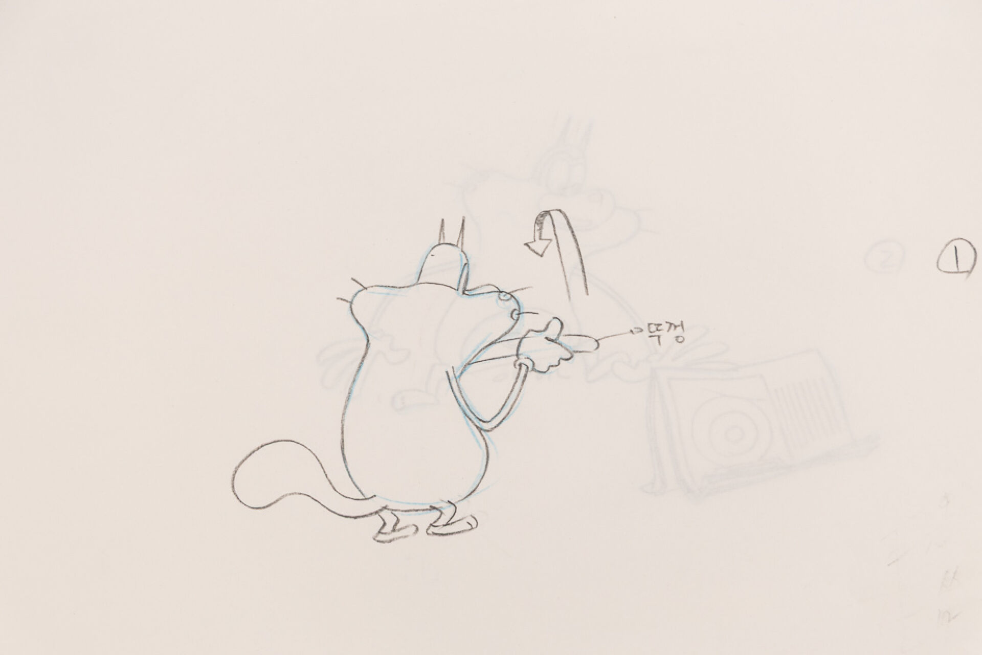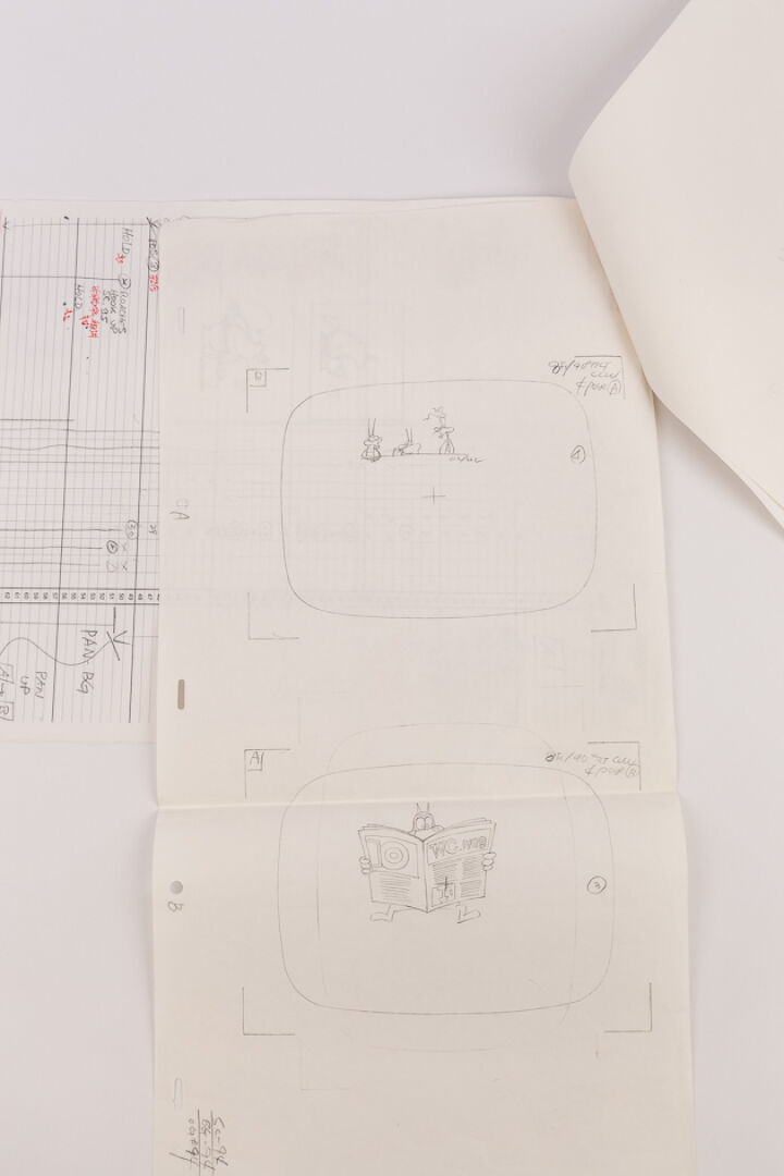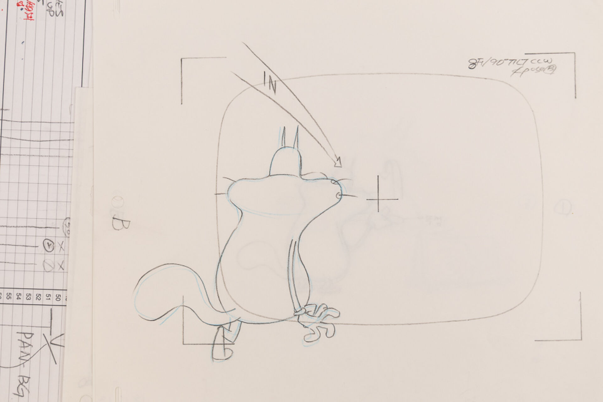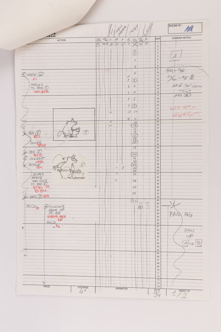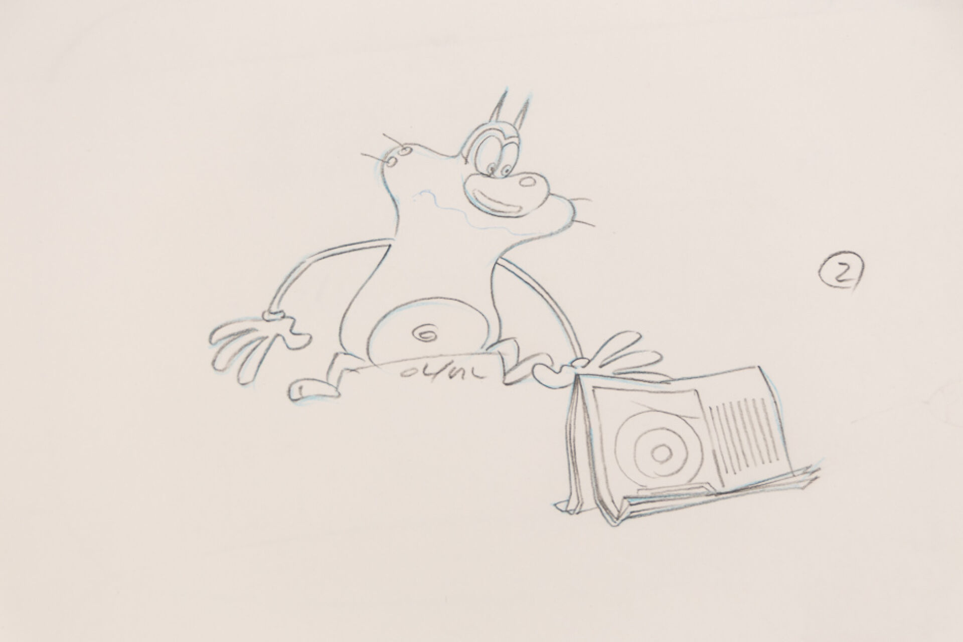 d'après l'œuvre de Jean-Yves Raimbaud et Olivier Jean-Marie - Oggy et les Cafards Ensemble de quatre dessins originaux à la mine de plomb et aux crayons de couleur mettant en scène Oggy lisant "WC Mag" et les trois cafards. On y joint deux time-sheets associées, l'ensemble extrait de l'épisode 108. Dim. (dessins) : Haut. : 26.6 cm x Larg. : 31,8 cm pour trois et Haut. : 26.6 cm x Larg. : 52,4 cm pour le quatrième. Dim. (time-sheet) : Haut. : 41,8 cm x Larg. : 29,6 cm. Produit de 1998 à 2018