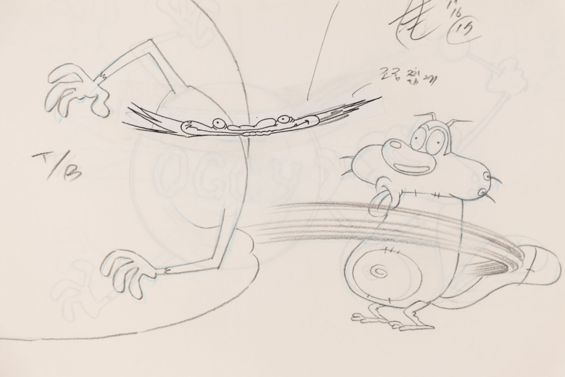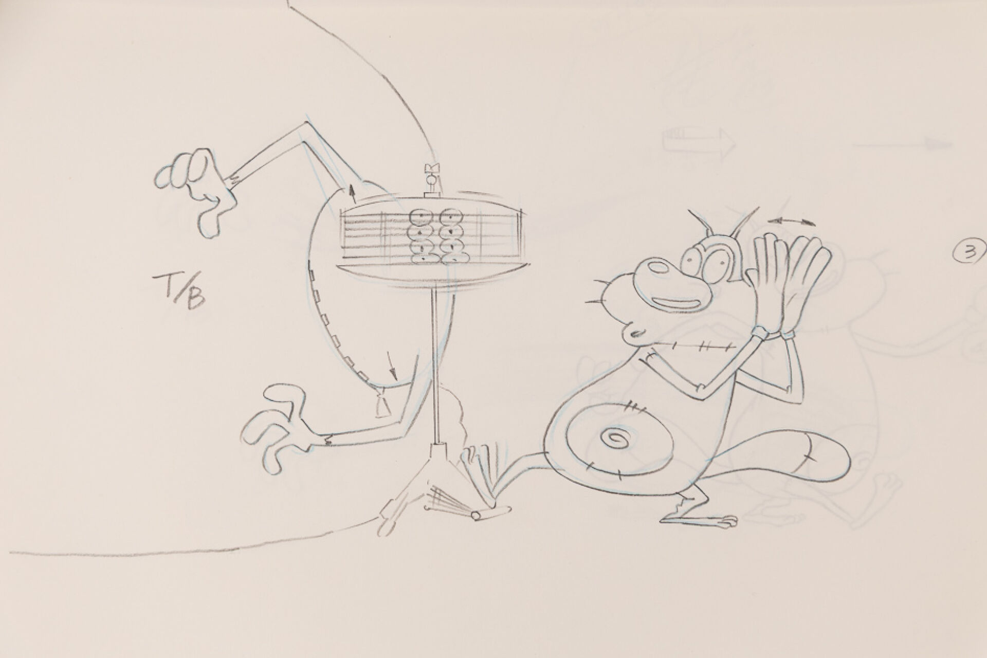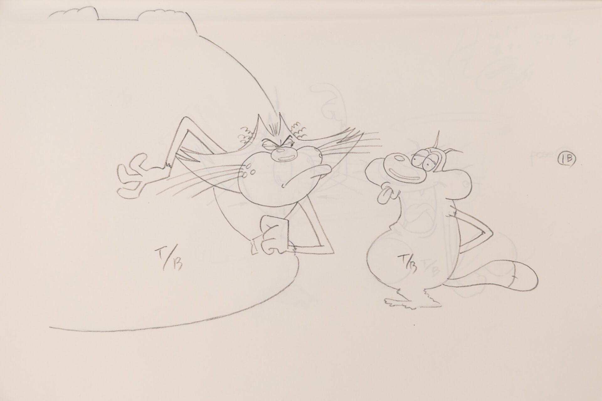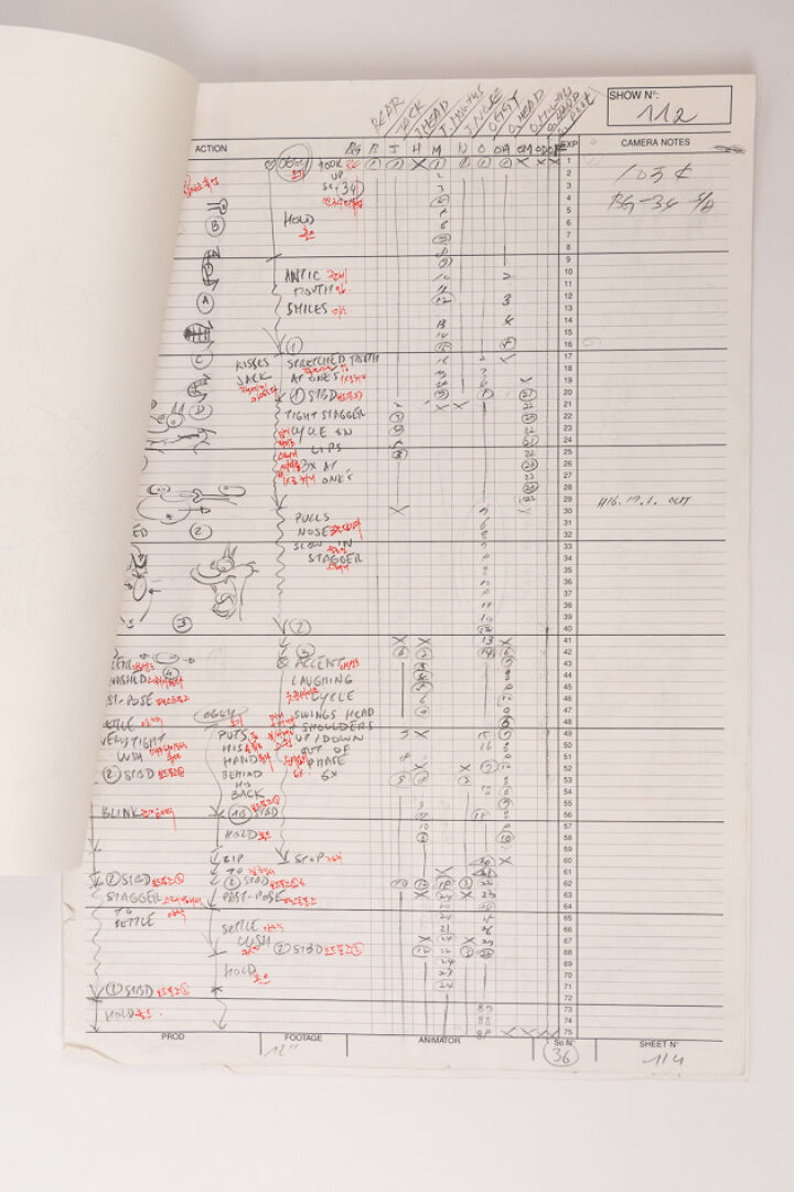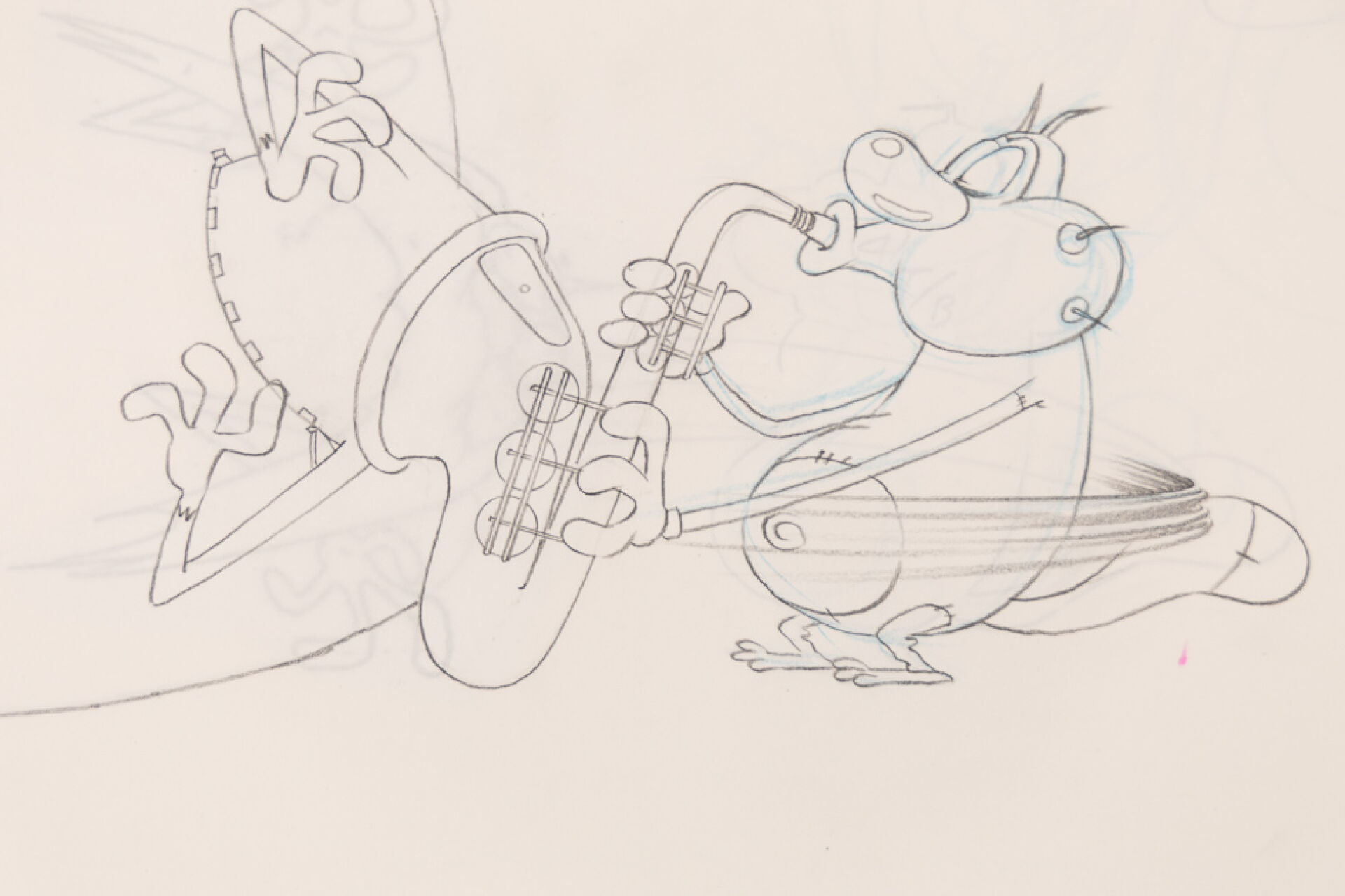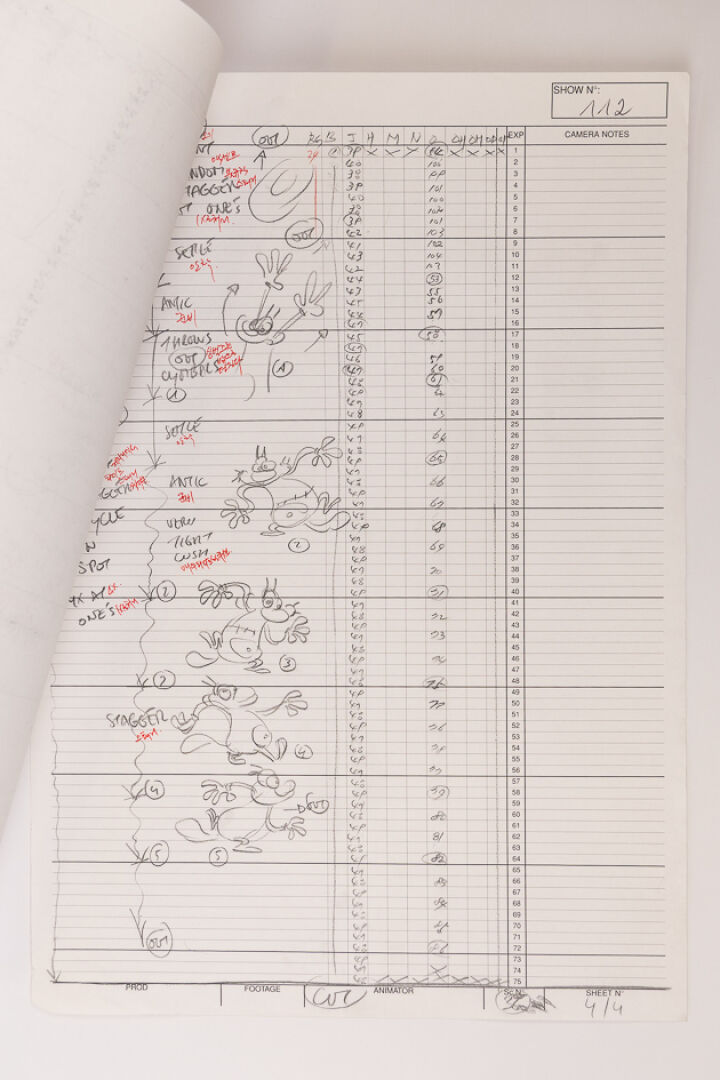 d'après l'œuvre de Jean-Yves Raimbaud et Olivier Jean-Marie - Oggy et les Cafards Ensemble de 15 dessins originaux à la mine de plomb et aux crayons de couleur mettant en scène Oggy martyrisant Jack avec des instruments de musique. On y joint 4 time-sheets associées. Dim. (dessins) : Haut. : 26.6 cm x Larg. : 31,8 cm Dim. (time-sheet) : Haut. : 41,8 cm x Larg. : 29,6 cm Produit de 1998 à 2018