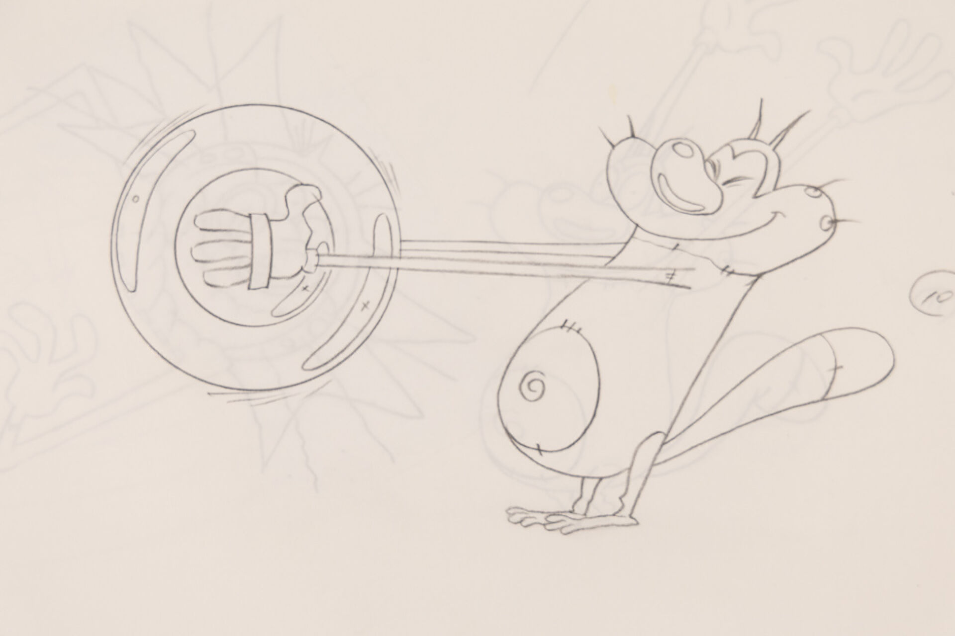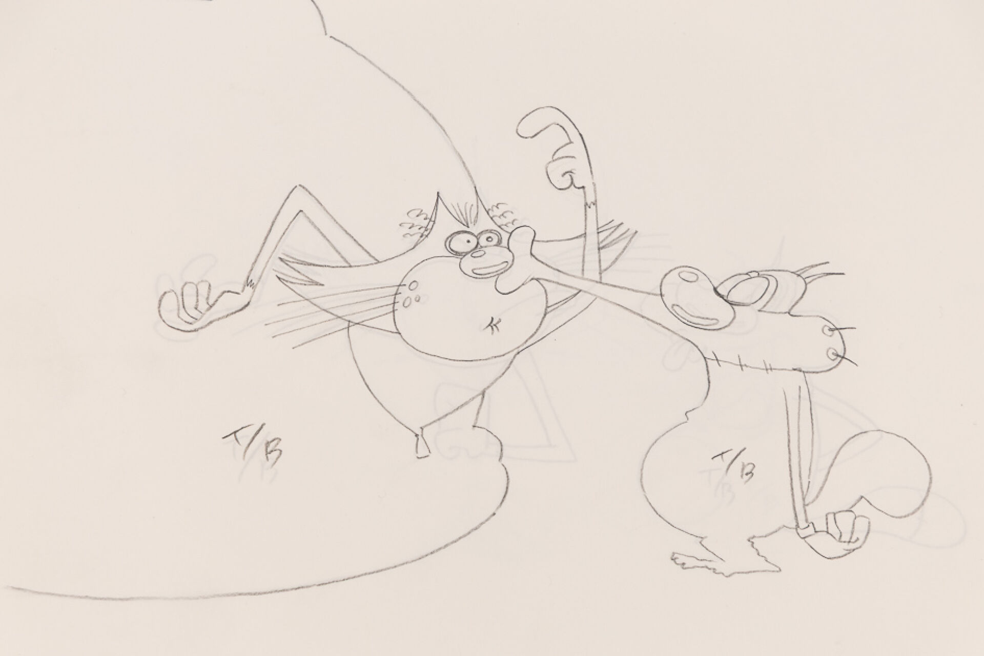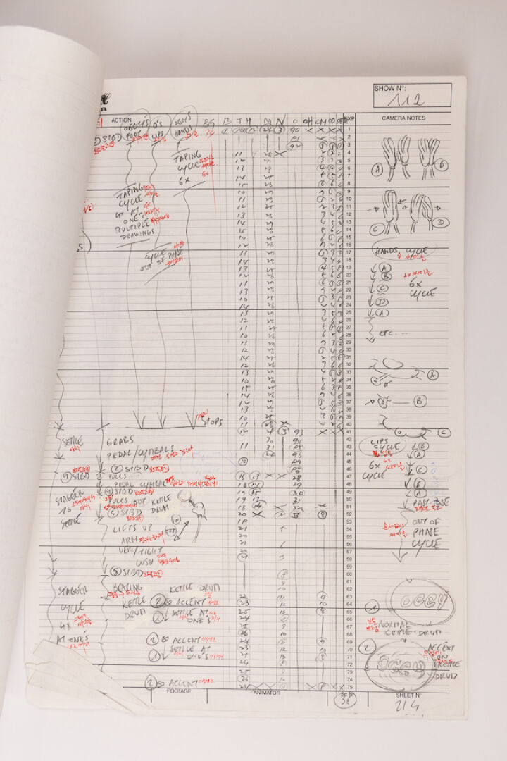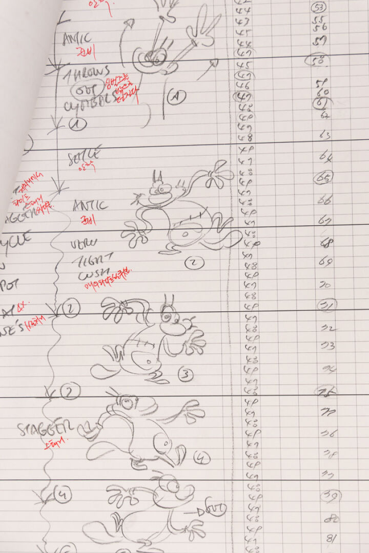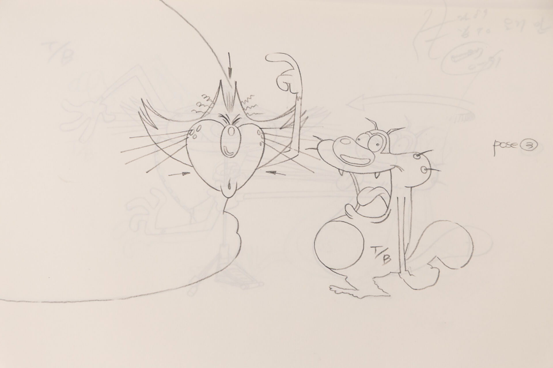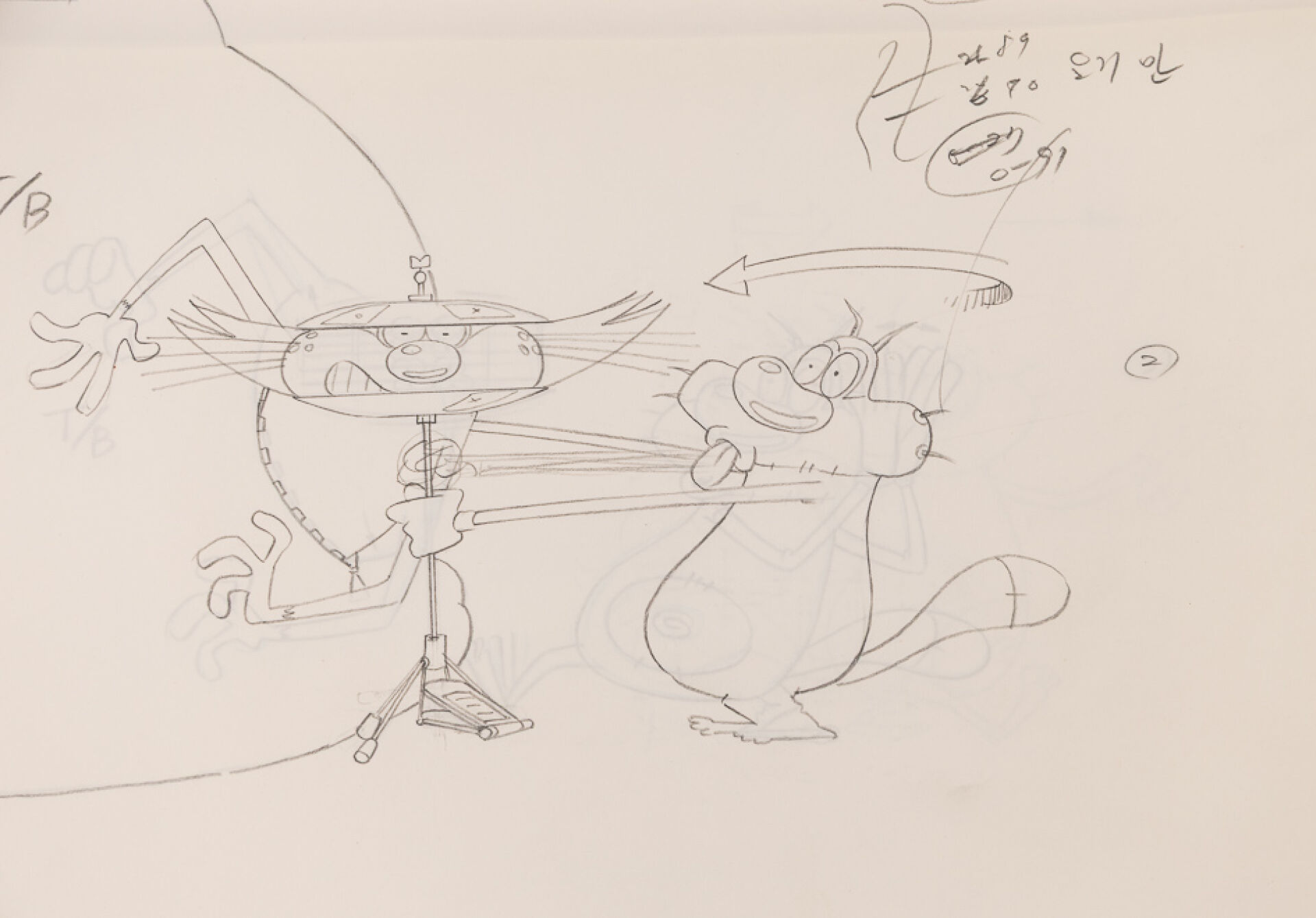 d'après l'œuvre de Jean-Yves Raimbaud et Olivier Jean-Marie - Oggy et les Cafards Ensemble de 15 dessins originaux à la mine de plomb et aux crayons de couleur mettant en scène Oggy martyrisant Jack avec des instruments de musique. On y joint 4 time-sheets associées. Dim. (dessins) : Haut. : 26.6 cm x Larg. : 31,8 cm Dim. (time-sheet) : Haut. : 41,8 cm x Larg. : 29,6 cm Produit de 1998 à 2018