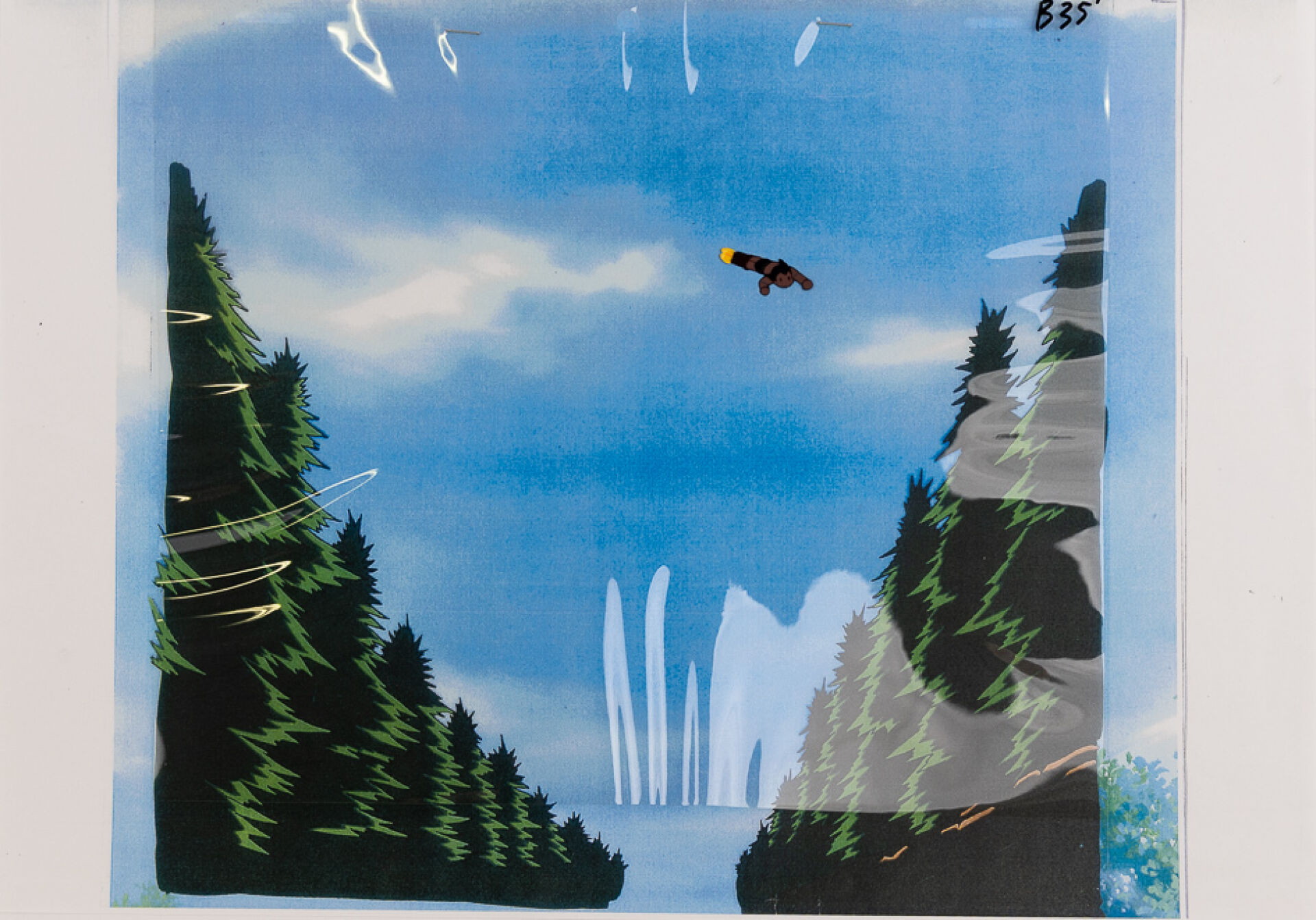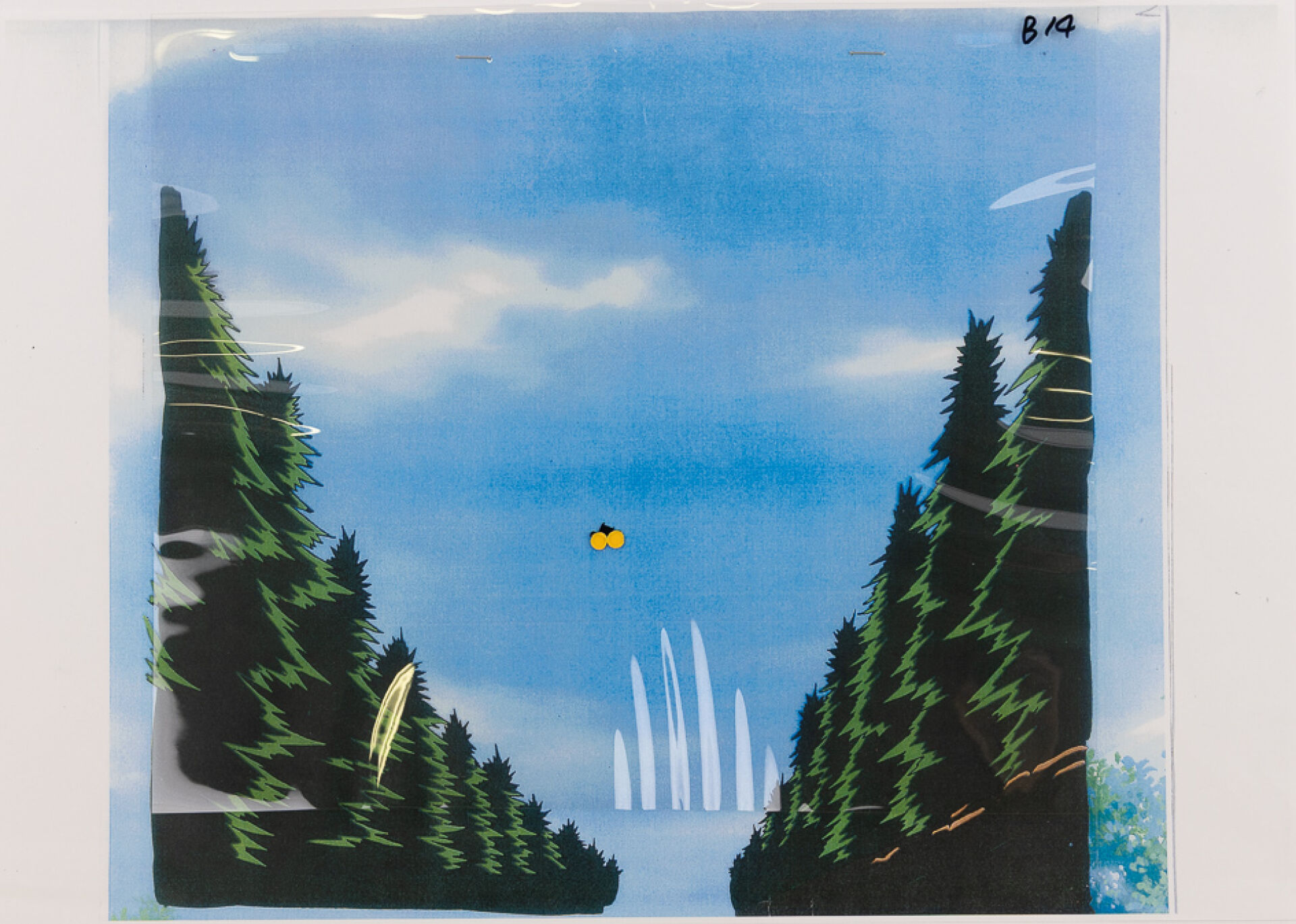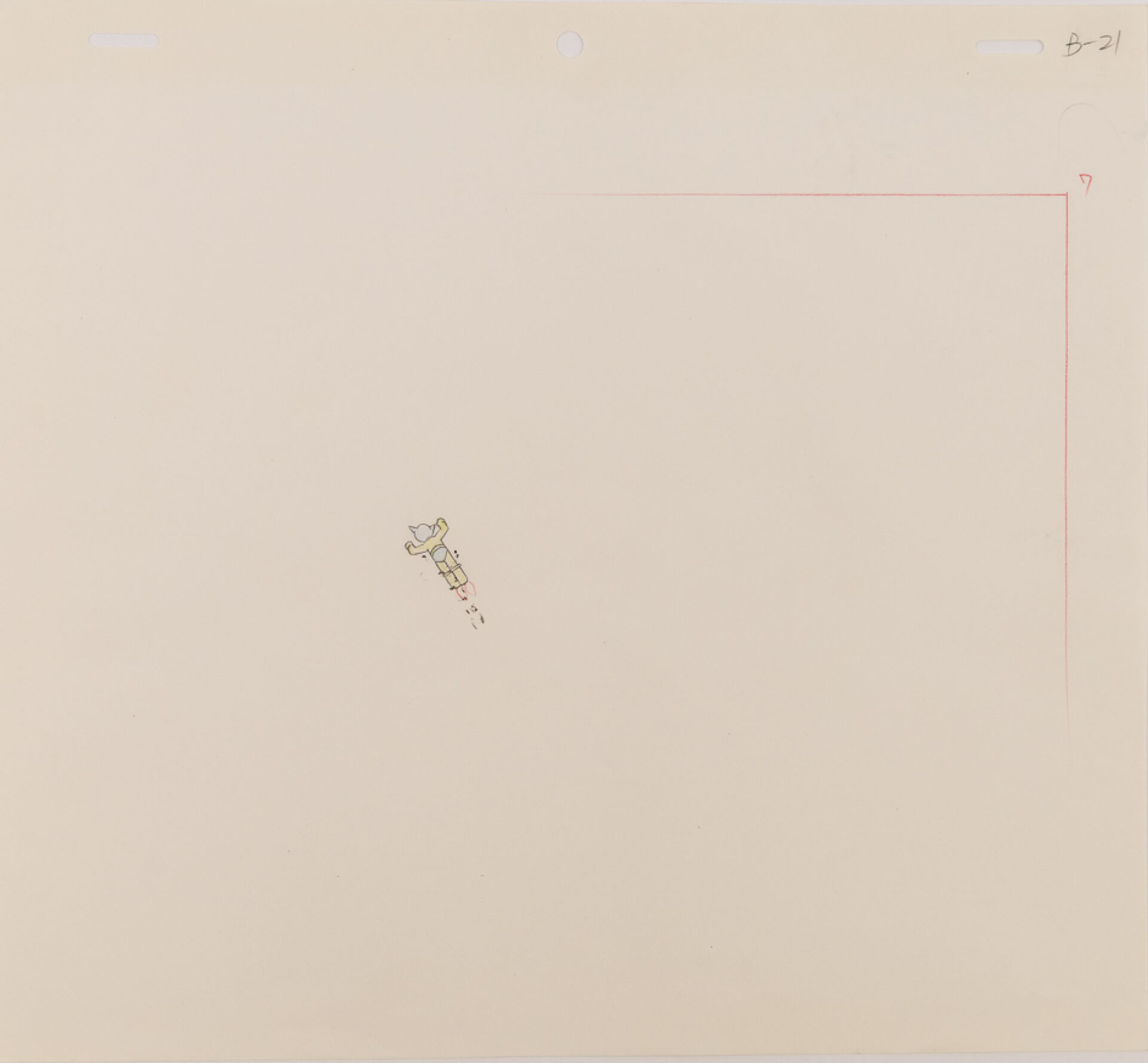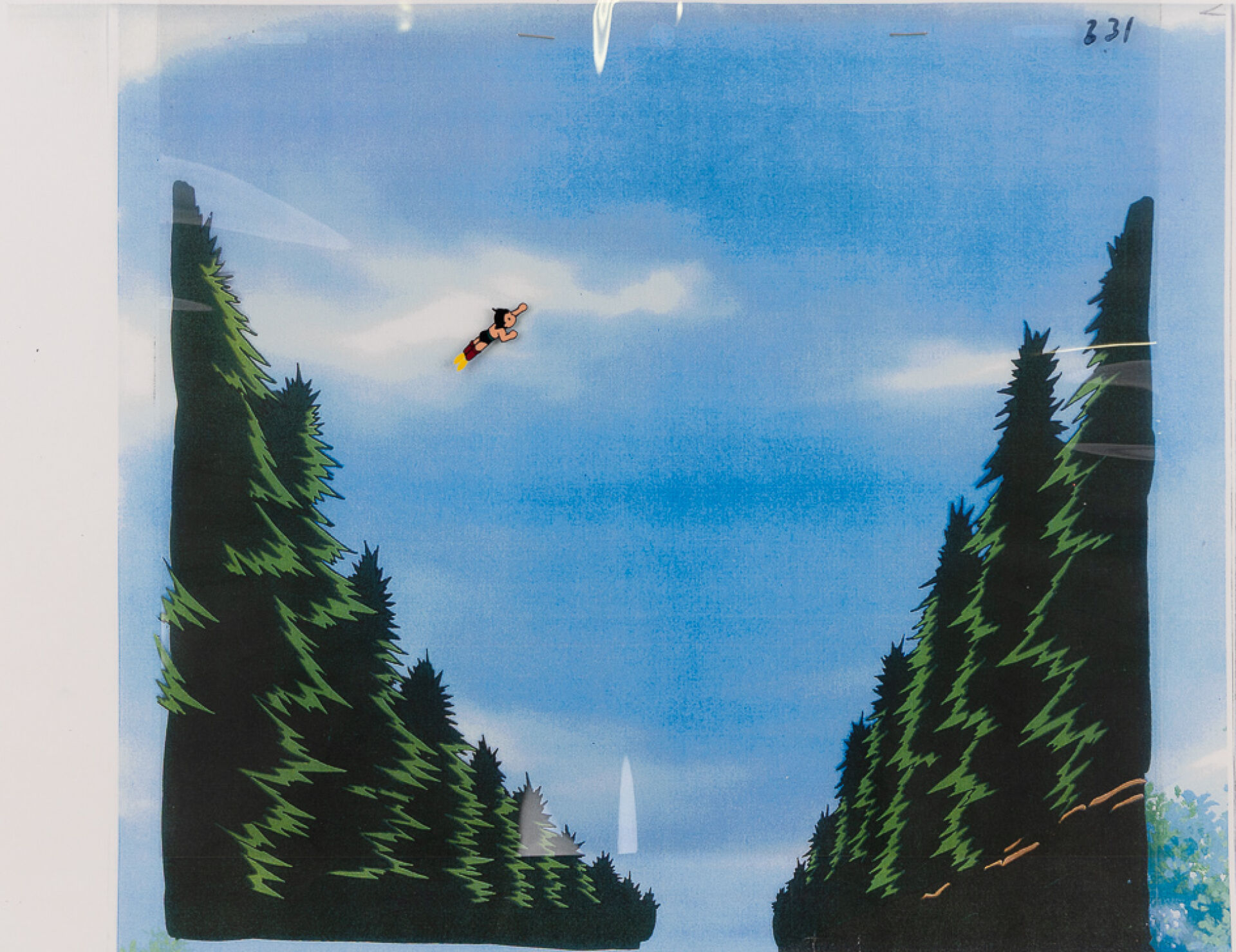 d'après l'œuvre de Osamu Tezuka (手塚 治虫) - Astro Boy (鉄腕アトム) - Astro, le petit robot (鉄腕アトム ou Tetsuwan Atomu) : Ensemble comprenant quatre cellulo (cel / celluloïd) originaux à l'encre et à la gouache sur fond print représentant Astro en vol entre des arbres, dont trois avec leur dôga (Douga) visible au dos, numérotés B14, B21, B31 et B34. Haut. : 23 cm - Larg. : 36,5 cm environ pour les cellulo, gondolés. Produit par Tezuka Productions.