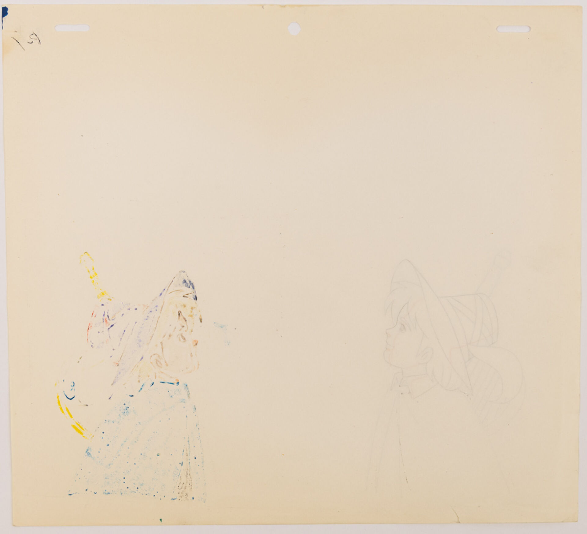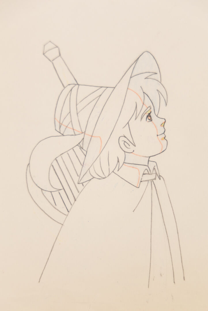 d'après l'œuvre d'Hector Malot, Osamu Dezaki (出﨑 統) . Rémi sans Famille (家なき) Douga ( dôga ) original à la mine de plomb et aux crayons de couleur représentant le personnage de Rémi, sa harpe à l'épaule, numéroté B-6. Haut.: 24,2 cm - Larg. : 26,8 cm. Produit par TMS entre 1977-1978