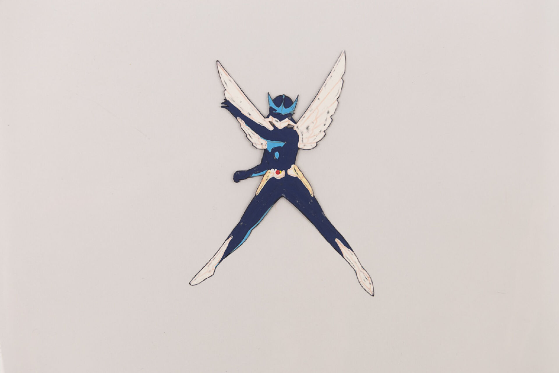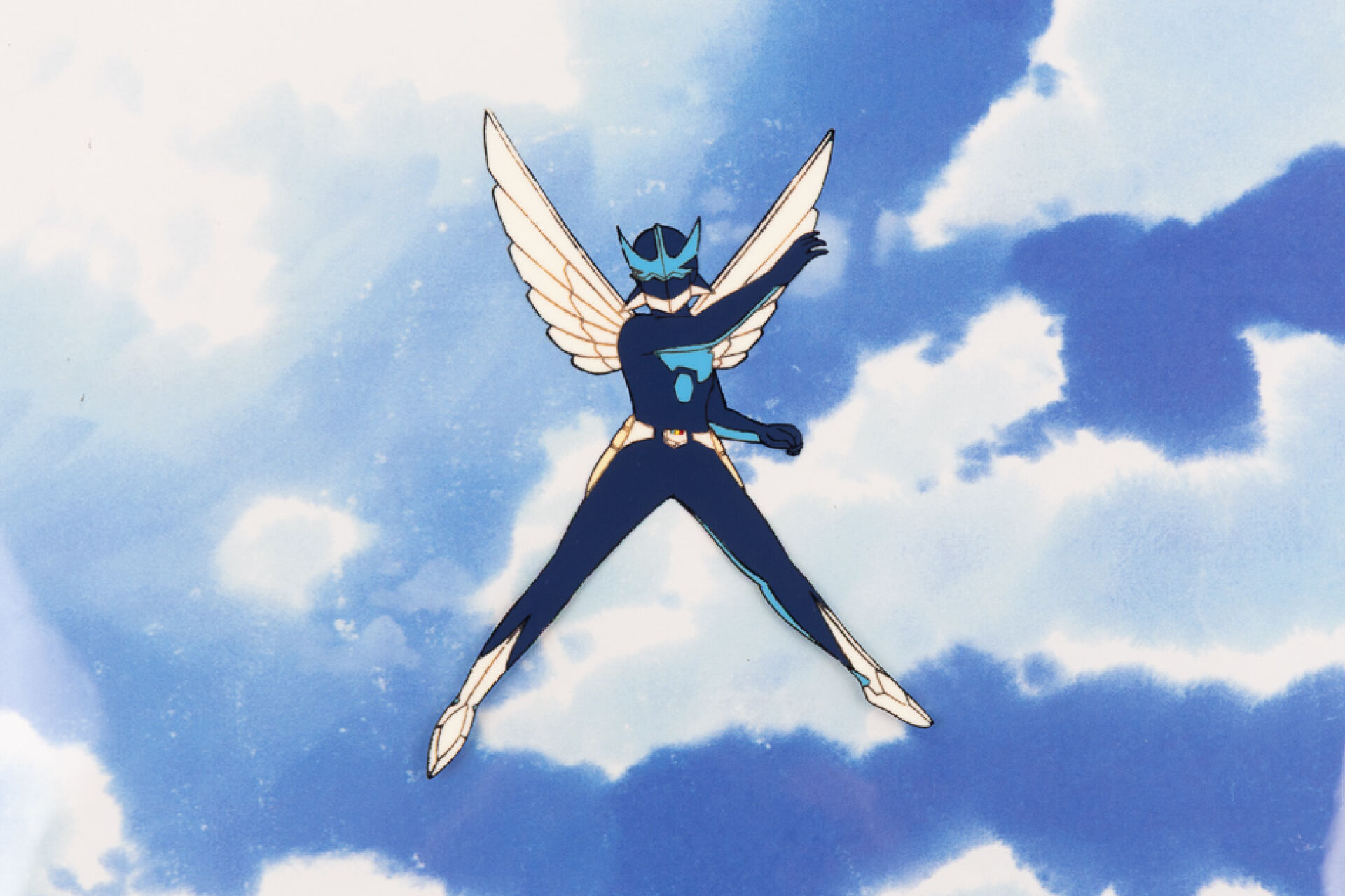 d'après l'œuvre de Masakazu Katsura (桂・正和) - Wingman (ウイングマン) Cellulo ( cel / celluloïd ) à l'encre et à la gouache numéroté B11 sur décor imprimé et son dôga (Douga) à la mine de plomb et aux crayons de couleur, représentant le personnage de Wingman dans les airs. Haut. : 23,1 cm - Larg. : 26,3 cm pour le cellulo. Produit par Toei animation en 1984-1985
