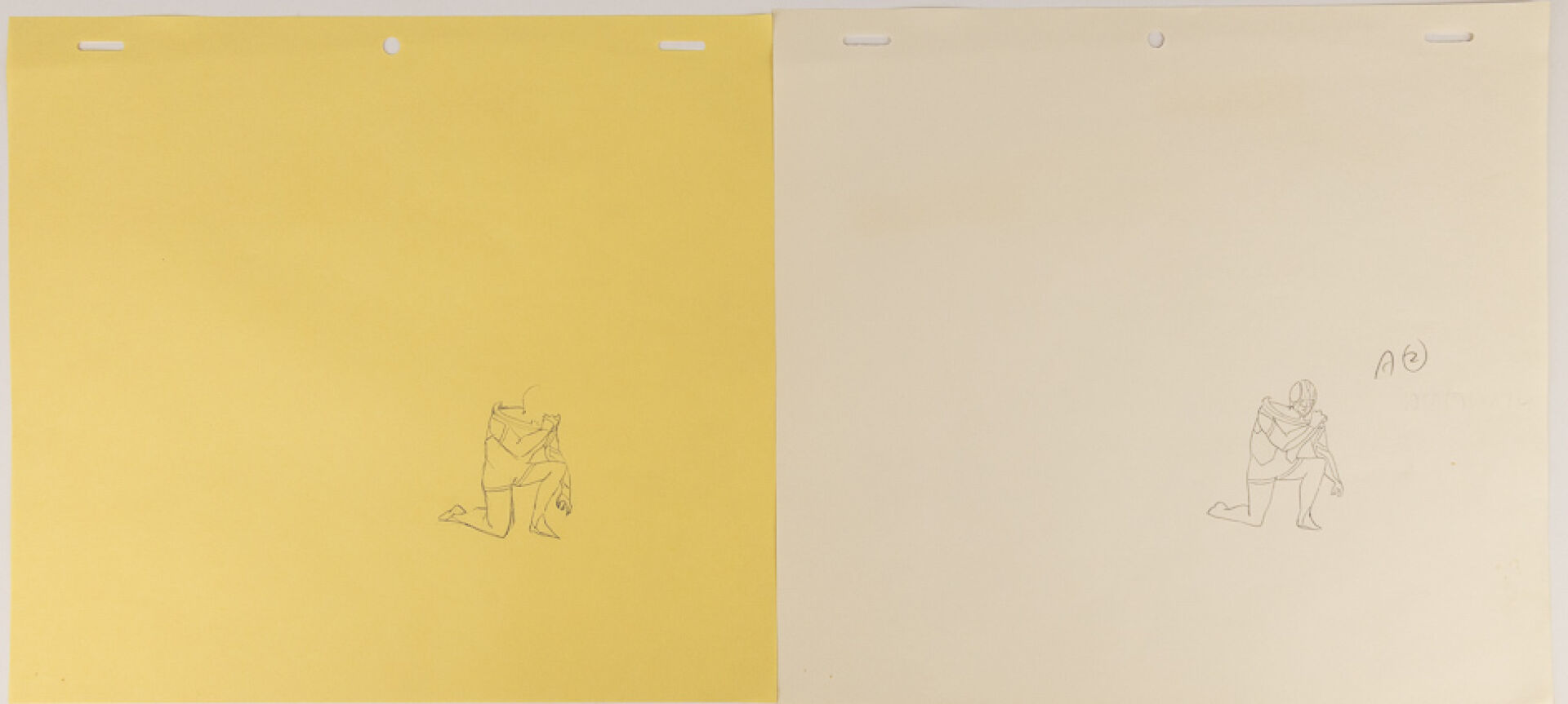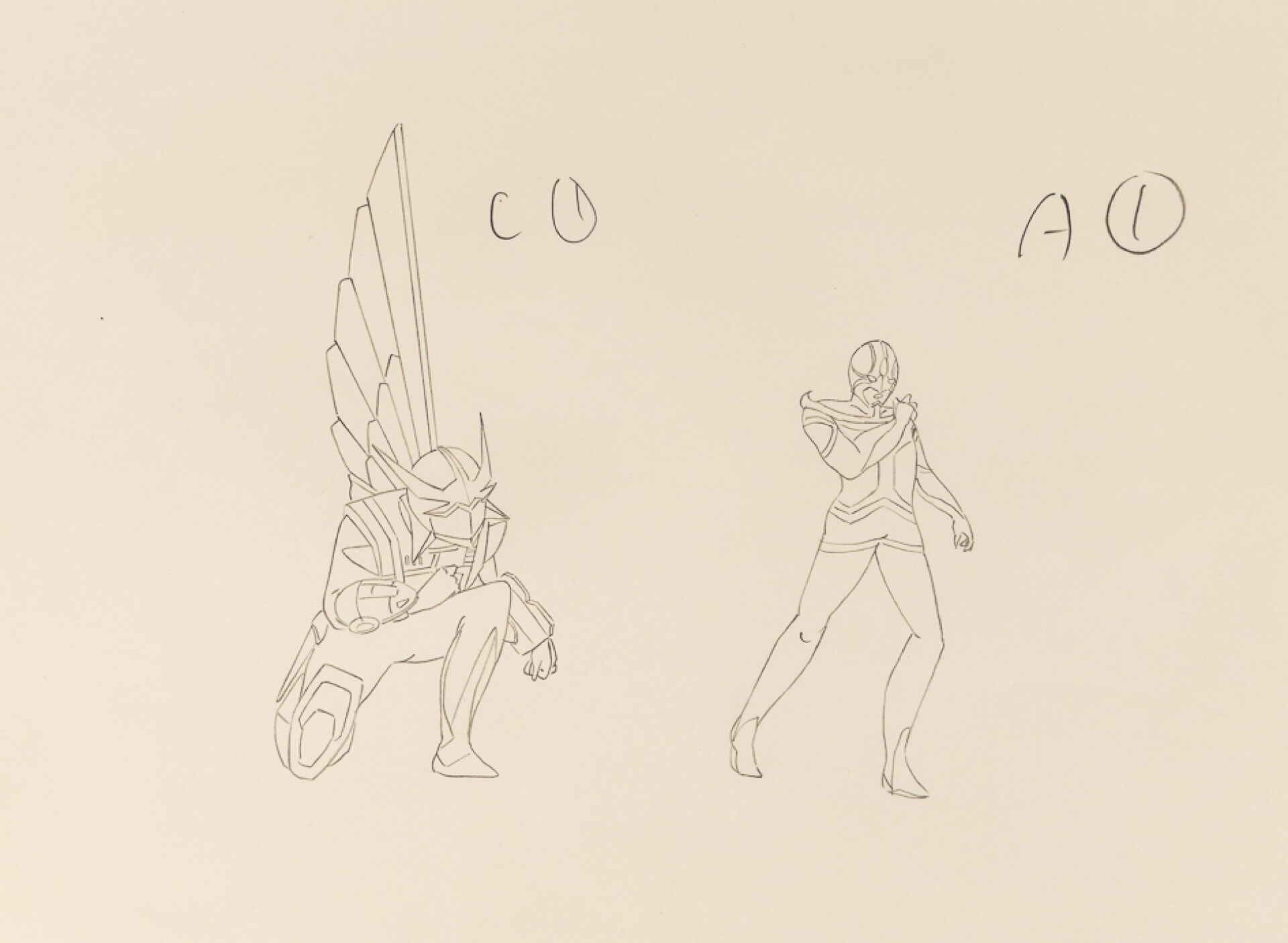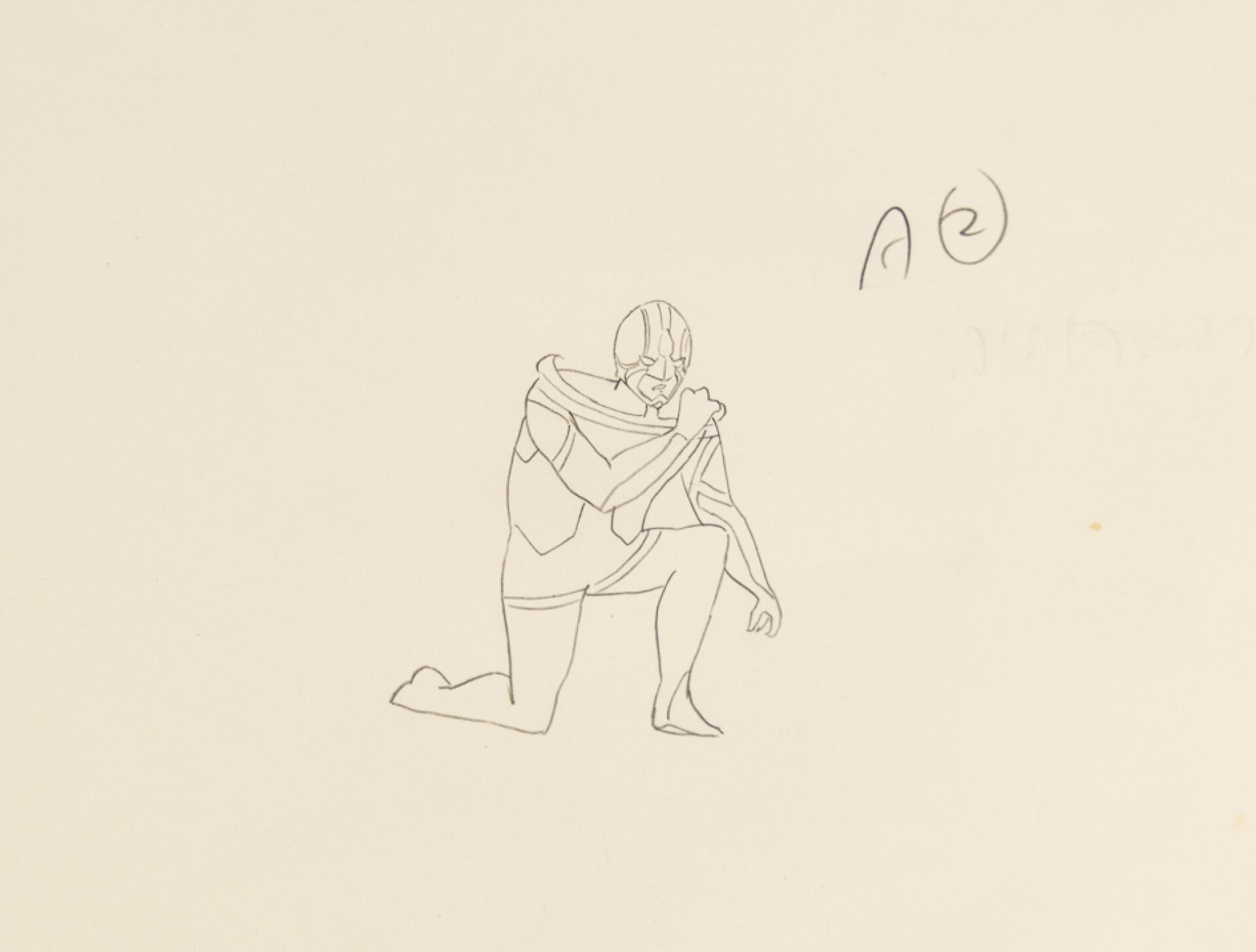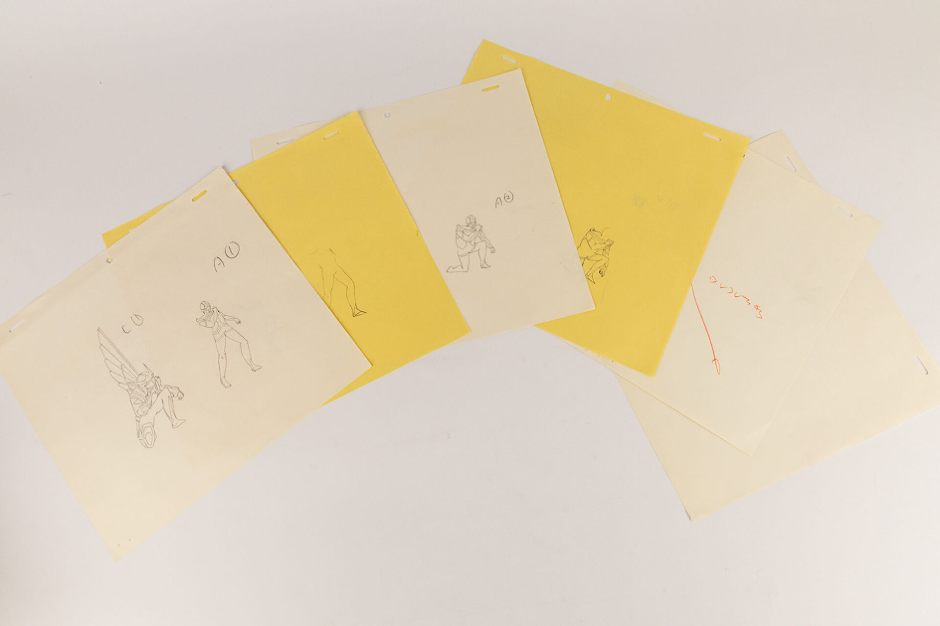 d'après l'œuvre de Masakazu Katsura (桂・正和) Wingman (ウイングマン) Ensemble de quatre Genga et deux corrections, originaux à la mine de plomb et aux crayons de couleur, représentant le personnage Kenta Hirono (David Duchemin en VF) contre un ennemi en plein combat. Haut. : 24,5 cm - Larg. : 27 cm. Produit par studio Toei Animation en 1984-1985.