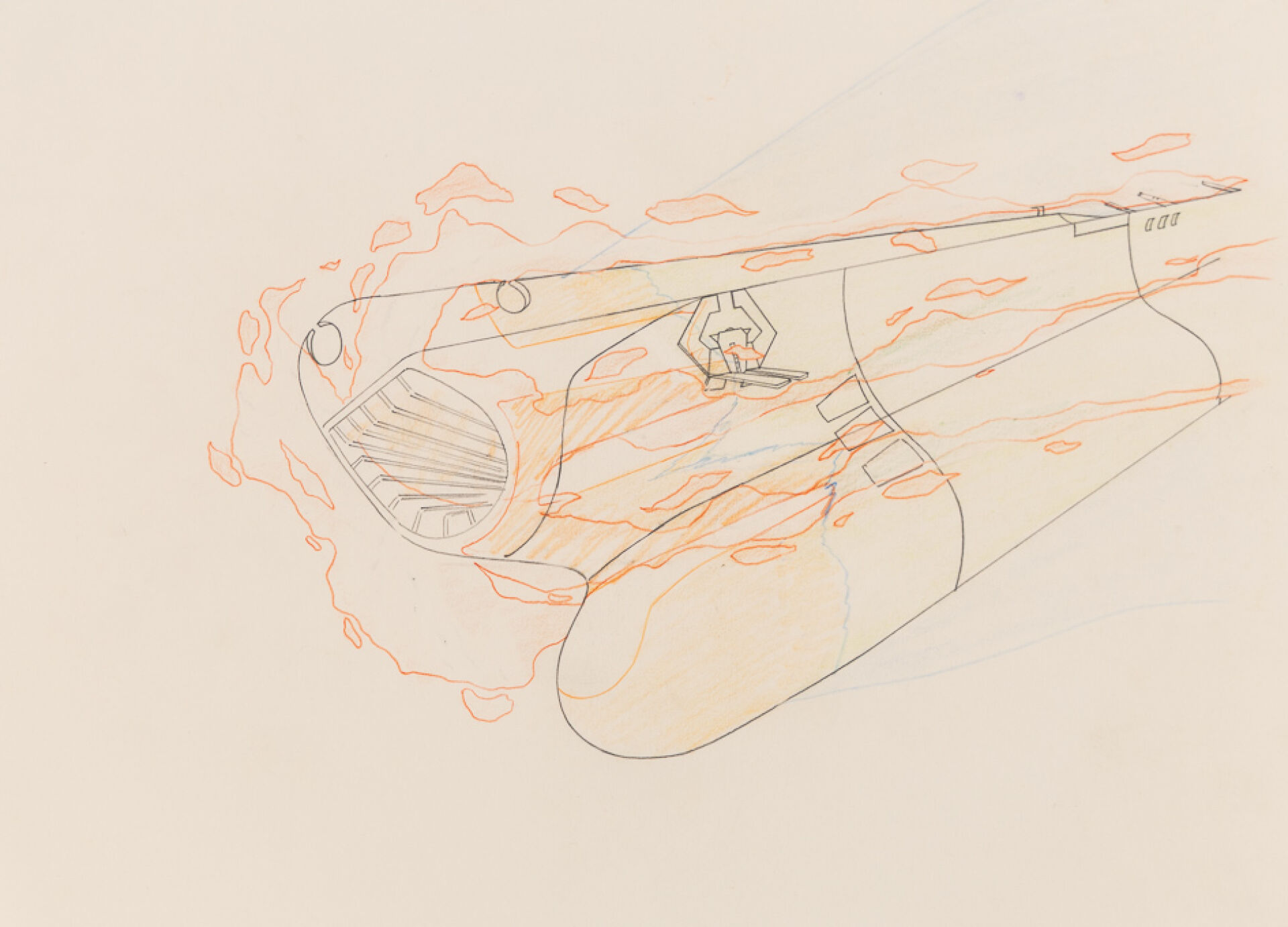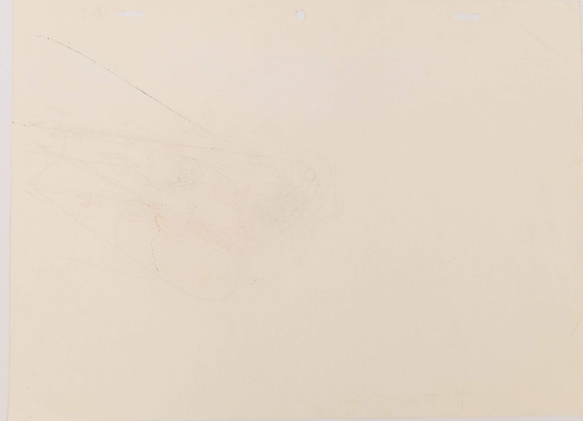 d'après l'œuvre de Leiji Matsumoto (松本零士) - Yamato, le cuirassé de l'espace (宇宙戦艦ヤマト) Genga à la mine de plomb et aux crayons de couleur, représentant le Star Blazers Le cuirassé Yamato en plein combat, numéroté A5. Haut. : 25,4 cm - Larg. : 34,5 cm. Produit par Toei Animation en 1974-1979