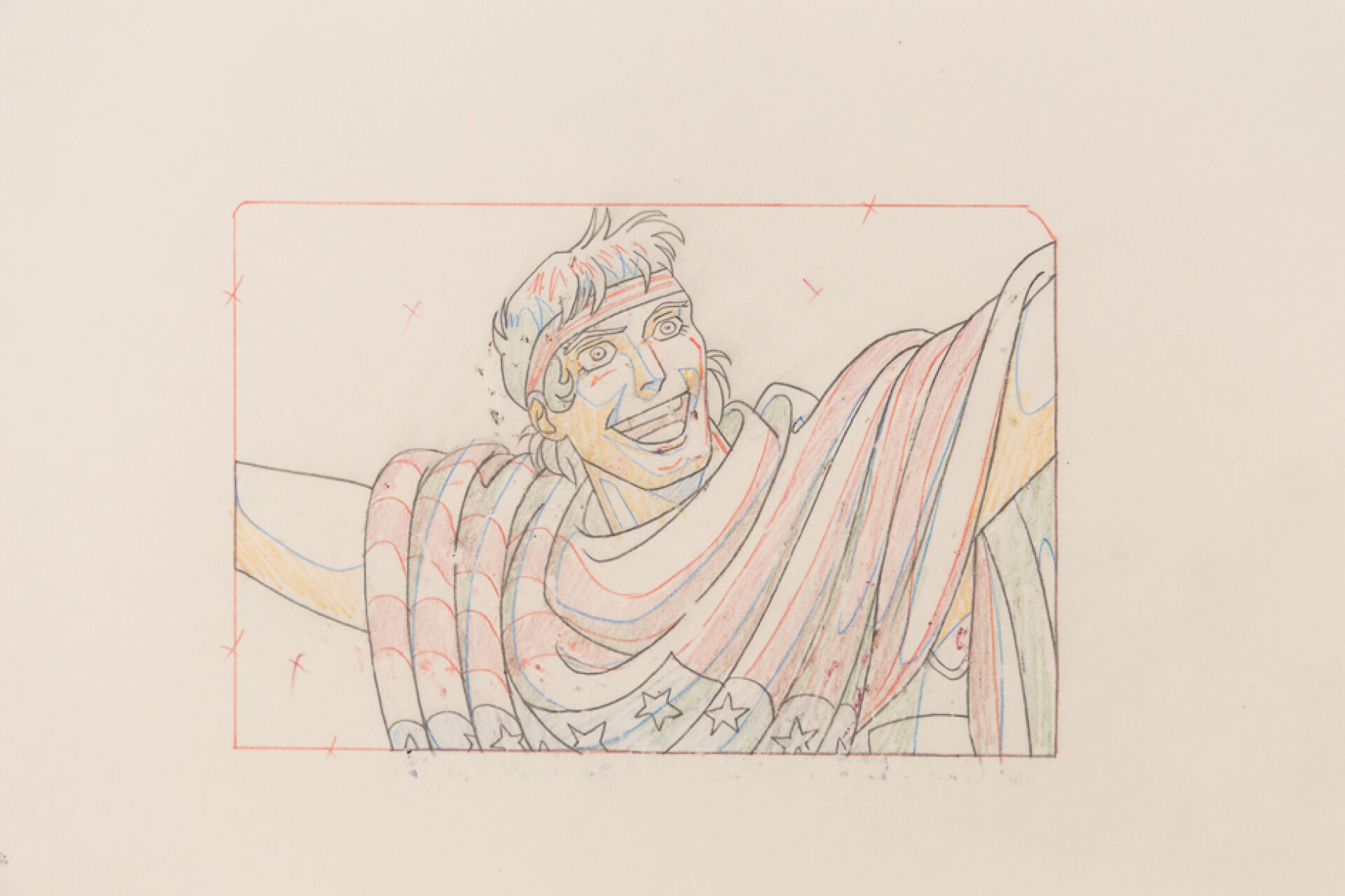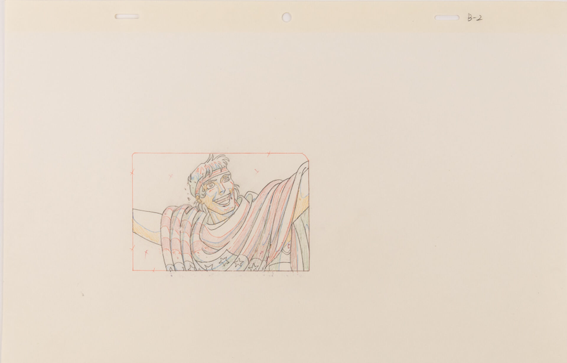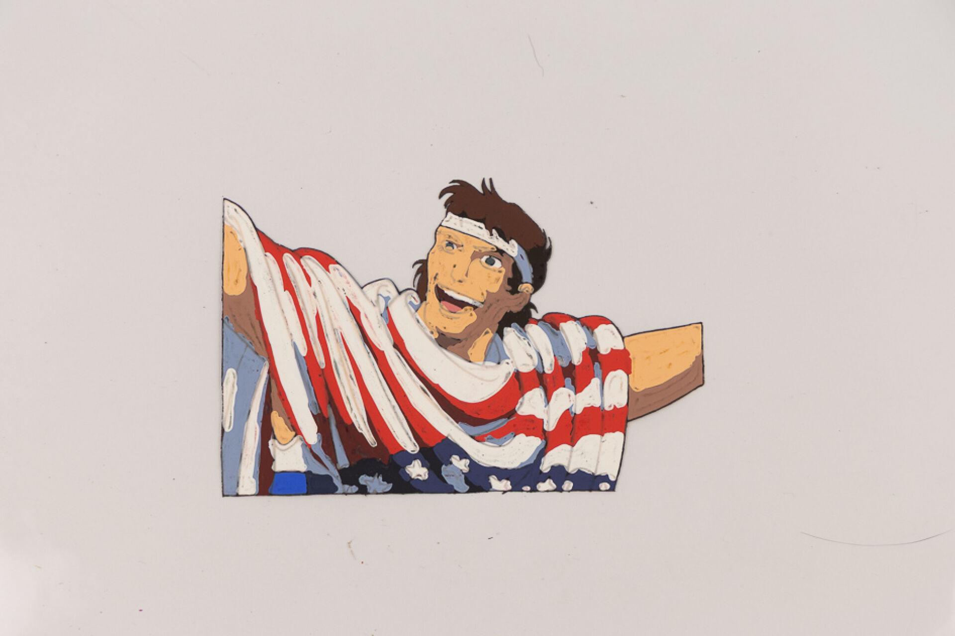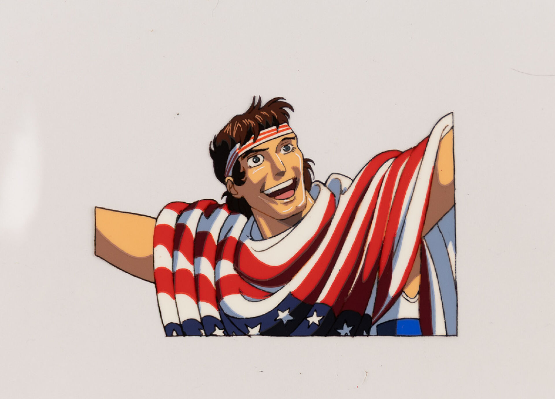 d'après l'œuvre de Osamu Tezuka (手塚 治虫) Black Jack (ブラック・ジャック) Cellulo (cel / celluloïd) original à l'encre et à la gouache représentant un personnage drapé dans le drapeau américain, numéroté B2 et son dôga (Douga) non collé. Haut. : 23 cm - Larg. : 36,5 cm.