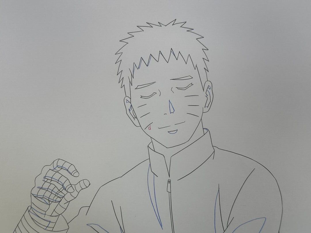 d'après l'oeuvre de Masashi Kishimoto (岸本 斉史) Boruto (ボルト) : Naruto Next Generation Pan dôga (Douga) à la mine de plombe et aux crayons de couleur représenant le personnage de Naruto Uzamaki en buste, les yeux fermés, numéroté B3. Haut. : 21 cm - Larg. : 29,7 cm. Produit par Studio Pierrot en 2017-2023.