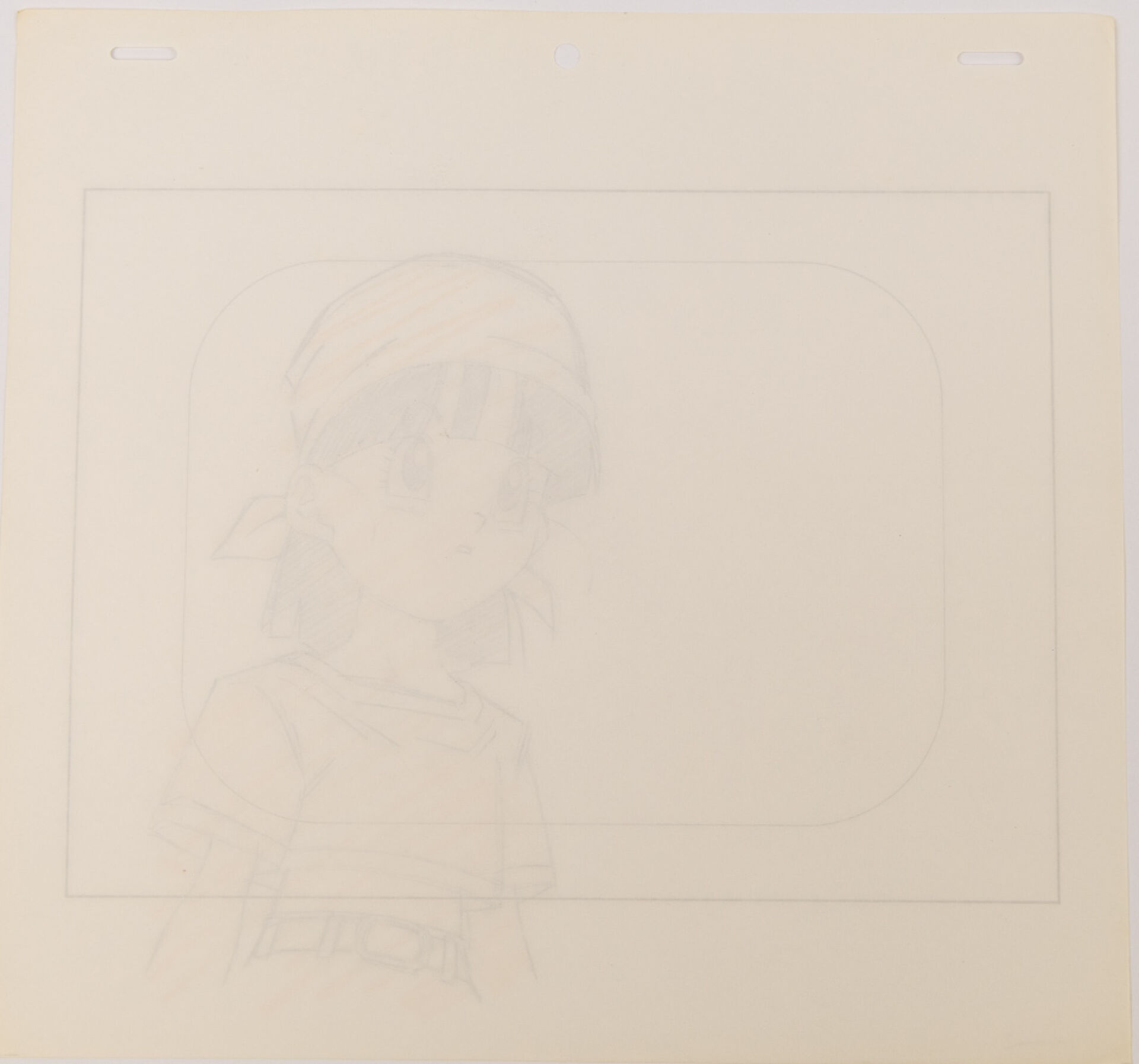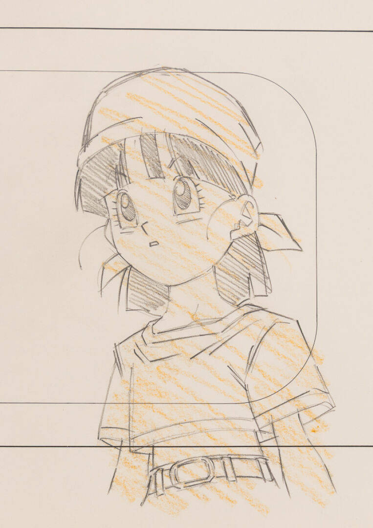 d'après l'œuvre de Akira Toriyama (鳥山 明) - Dragon Ball GT (ドラゴンボールGT) Ébauche de Layout à la mine de plomb et aux crayons de couleur, représentant le personnage de Videl. Haut. : 24,8 cm - Larg. : 26,4 cm. Produit par Studio Toei Animation en 1996-1997