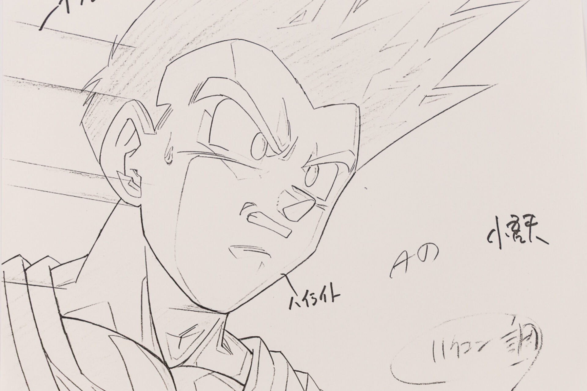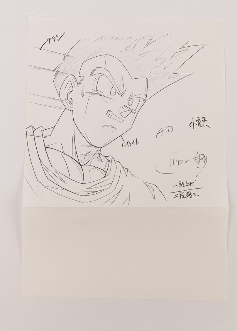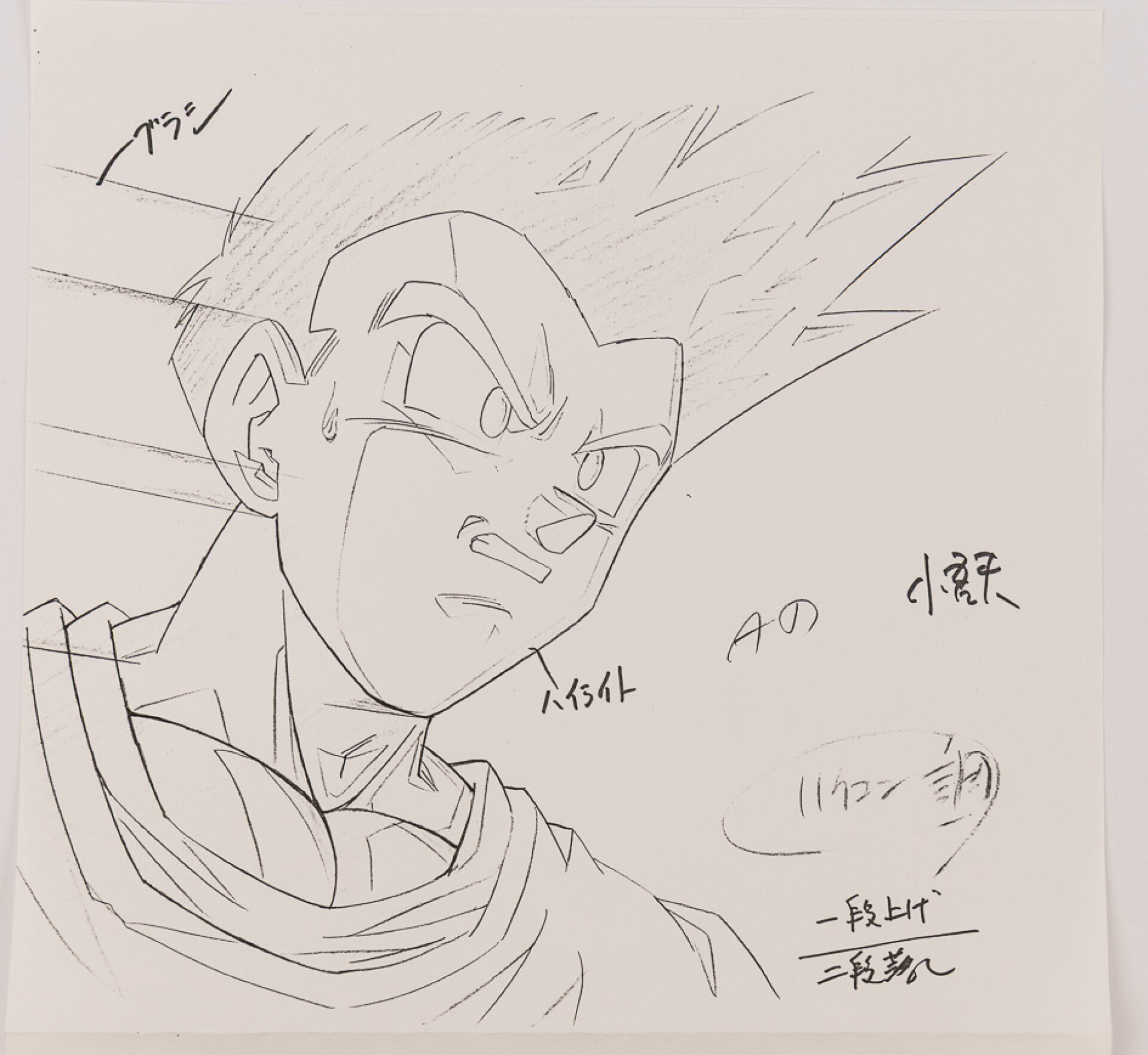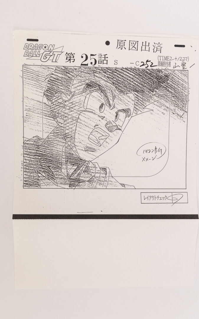 d'après l'œuvre de Akira Toriyama (鳥山 明) - Dragon Ball GT (ドラゴンボールGT) Copie de Layout et de Genga ayant été utilisés dans la production, représentant le personnage de Goten choqué, tiré de l'épisode 25 C'est terrible !! Baby fait son apparition sur Terre (大変だ!!地球にベビーが現れた). Haut. : 24,75 cm - Larg. : 25,2 cm pour le genga. Produit par Toei Animation en 1996-1997