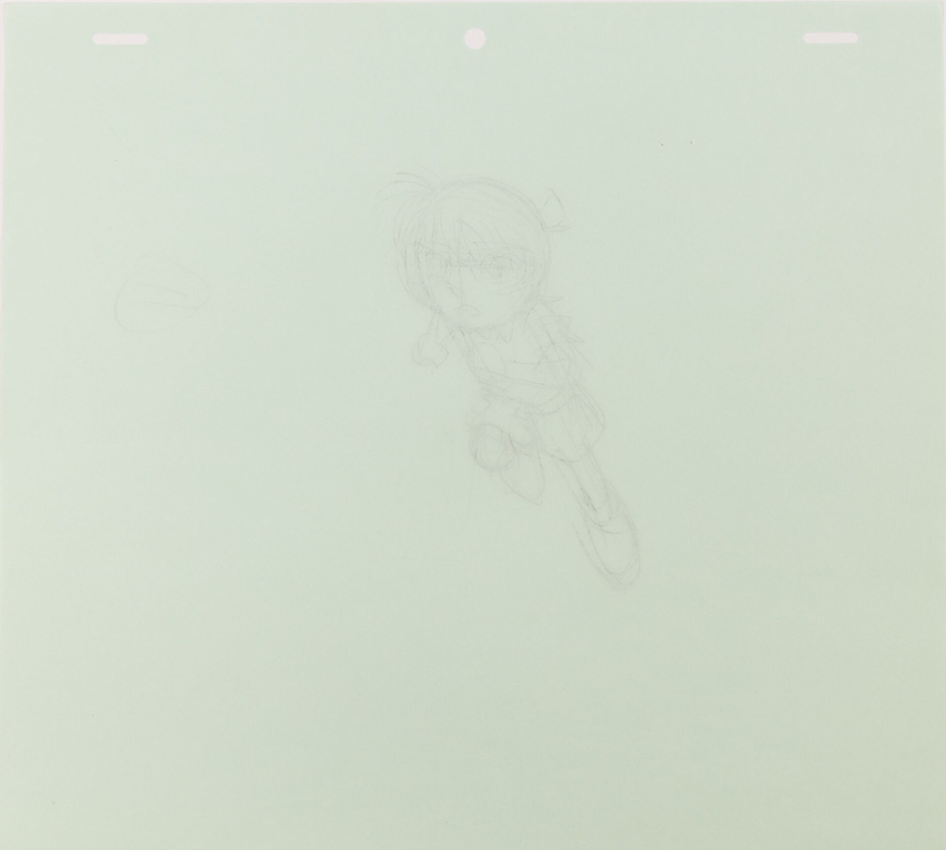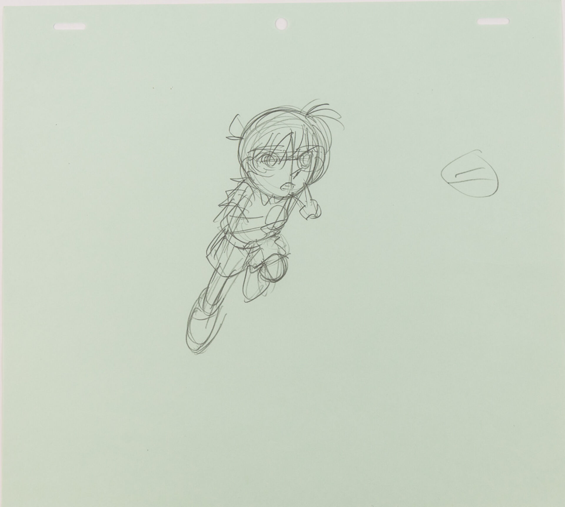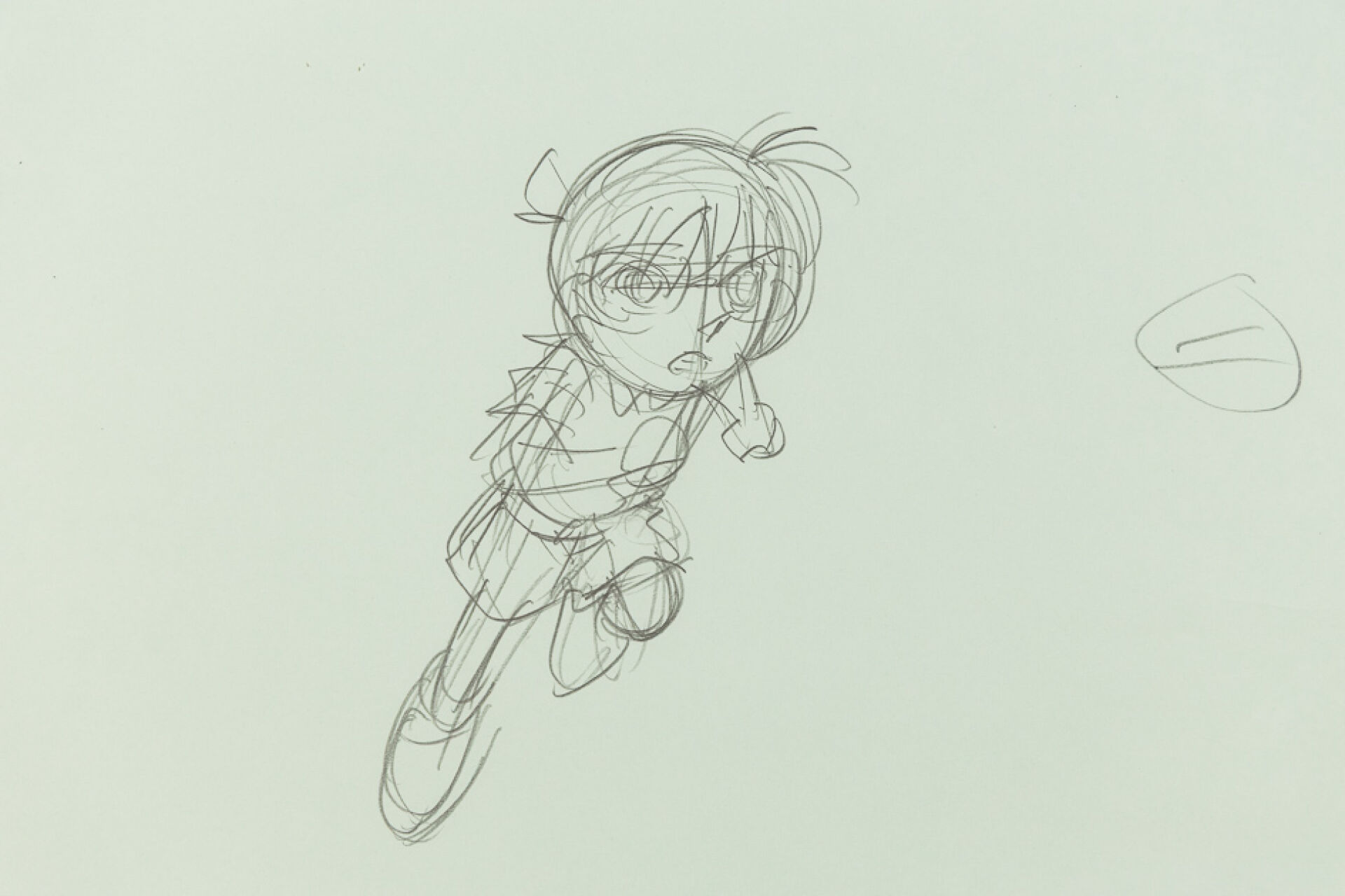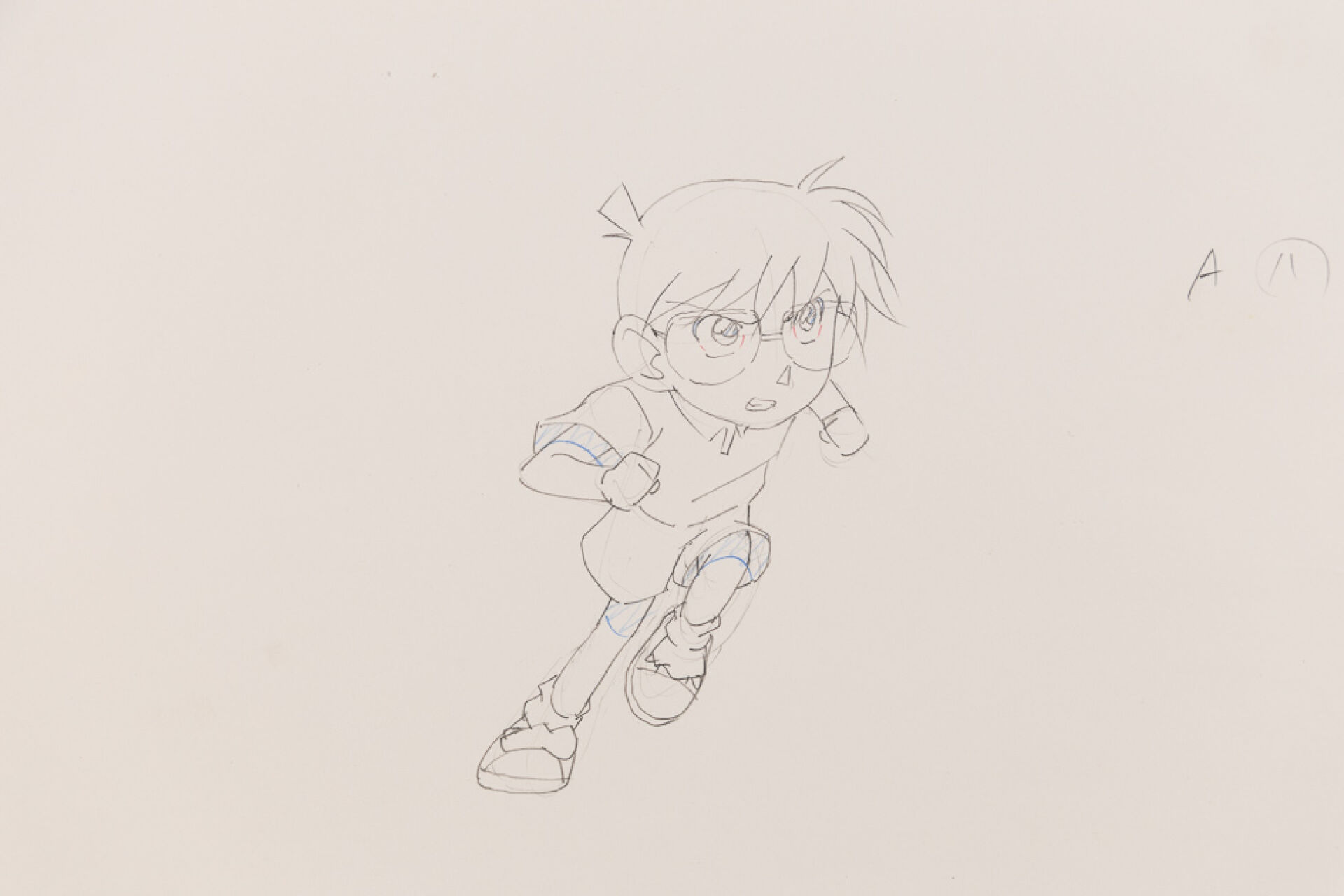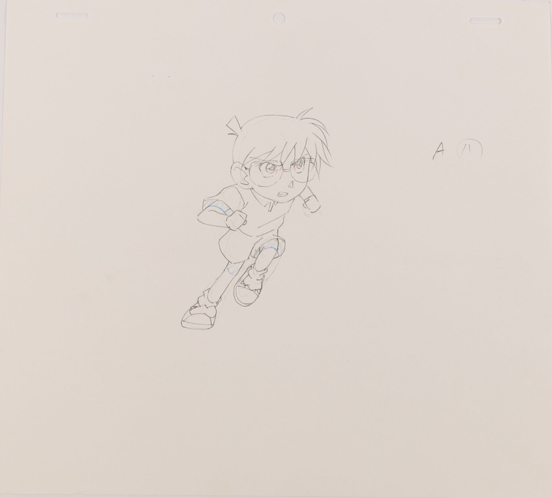 d'après l'œuvre de Gōshō Aoyama (青山 剛昌) - Kenji Kodama (こだま 兼嗣) - Yasuichiro Yamamoto (山本 泰一郎) Détective Conan (名探偵コナン) Genga et feuille de correction à la mine de plomb et aux crayons de couleur, représentant le personnage de Conan le célèbre détective, bondissant vers l'avant. Haut. : 24,2 cm - Larg. : 26,8 cm. Produit par TMS Entertainment depuis 1996