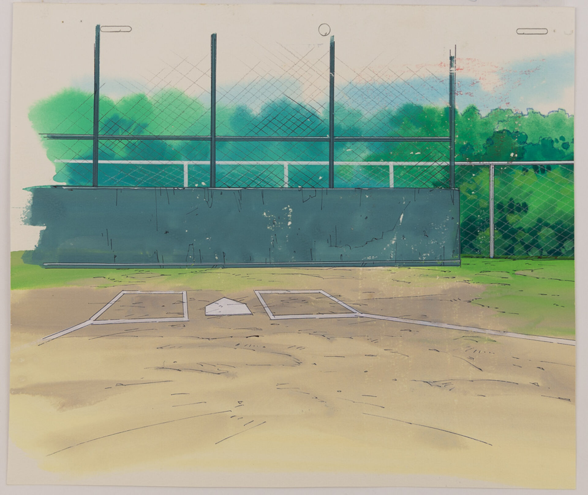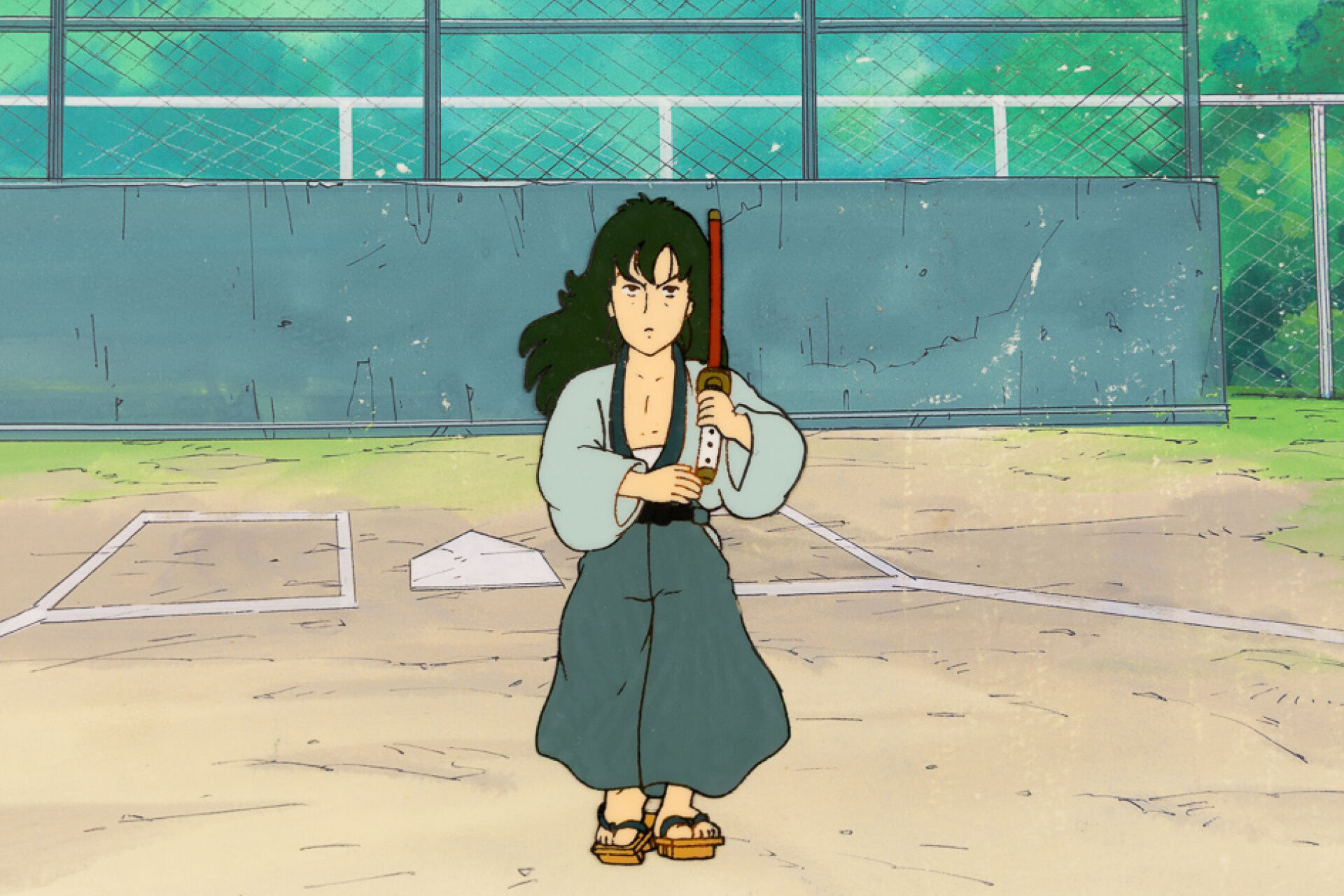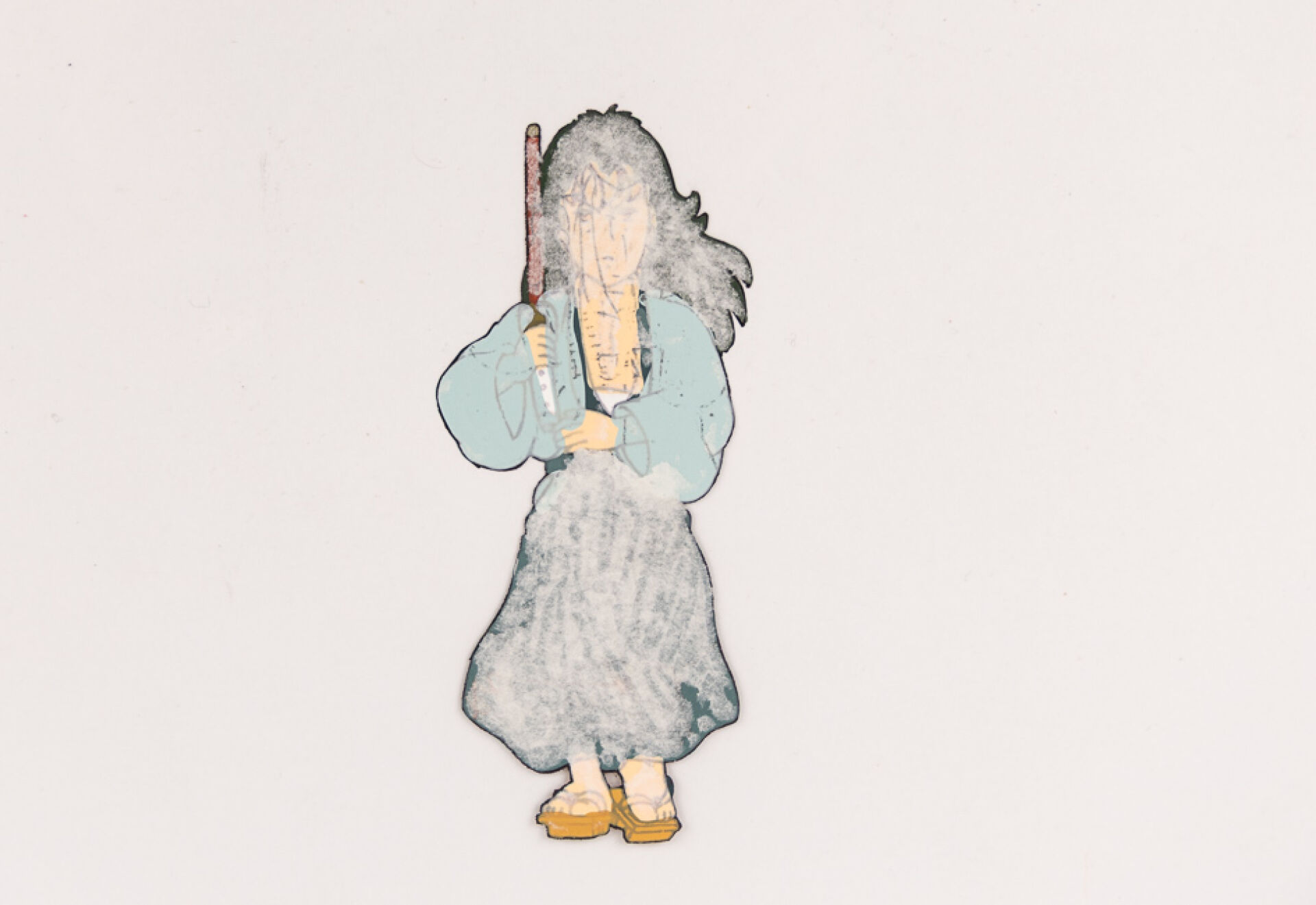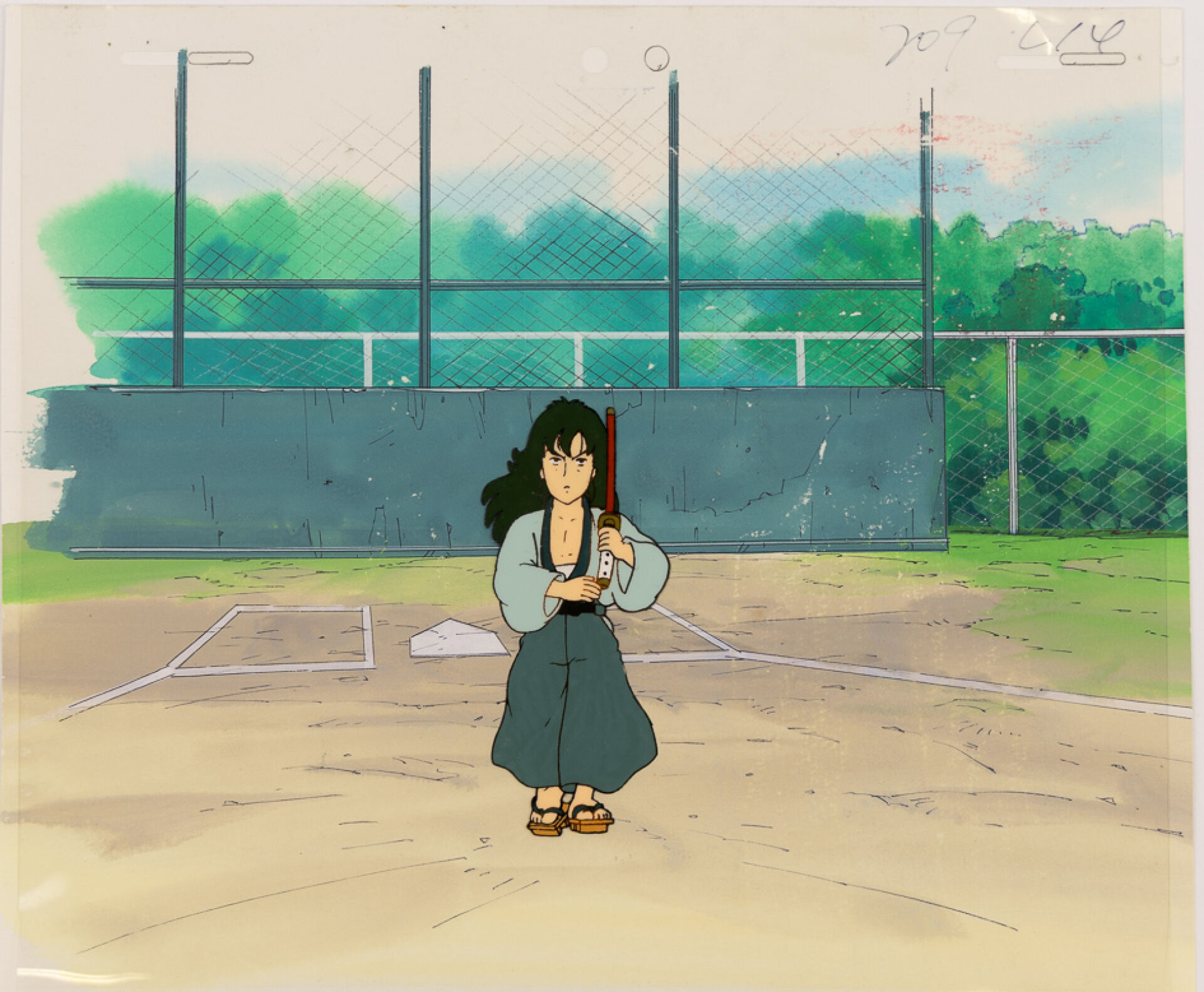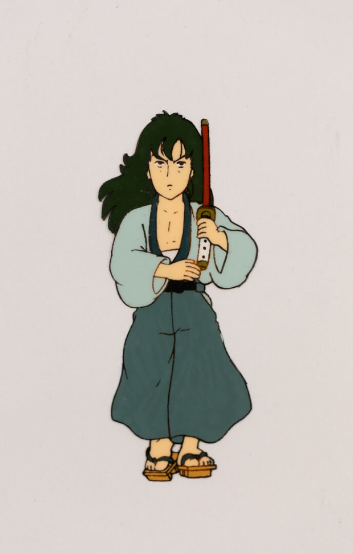 d'après l'œuvre de Akira Toriyama (鳥山 明) - Dr. Slump (ドクタースランプ) Cellulo (cel / celluloïd) à l'encre et à la gouache sur décor original gouaché accompagné d'une Timesheet, représentant le personnage de Sankaku Sugata. Haut. : 23 cm - Larg. : 26,4 cm. Produit par Toei Animation en 1981-1986