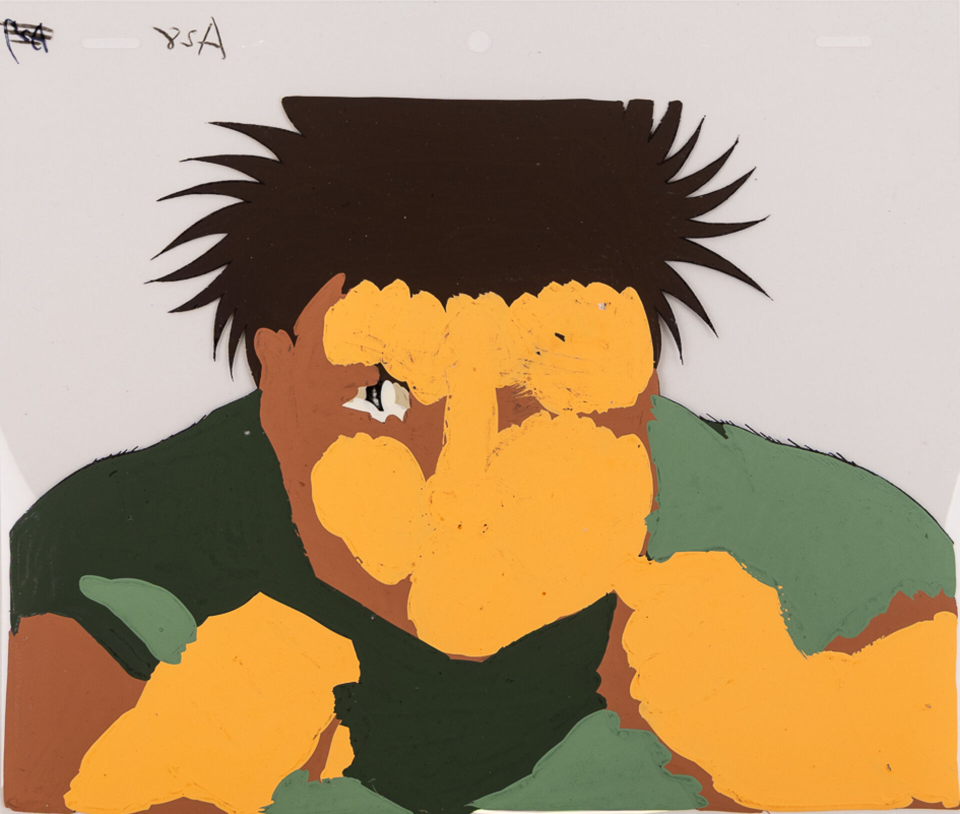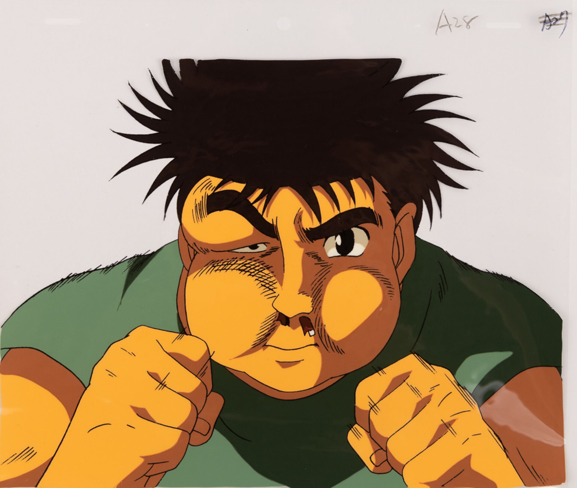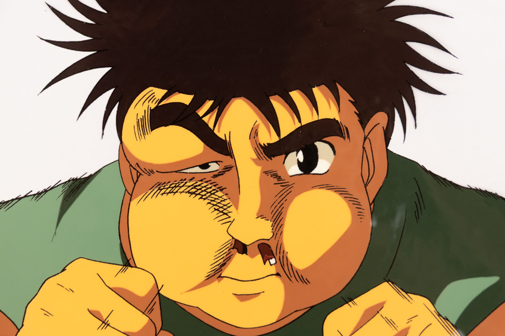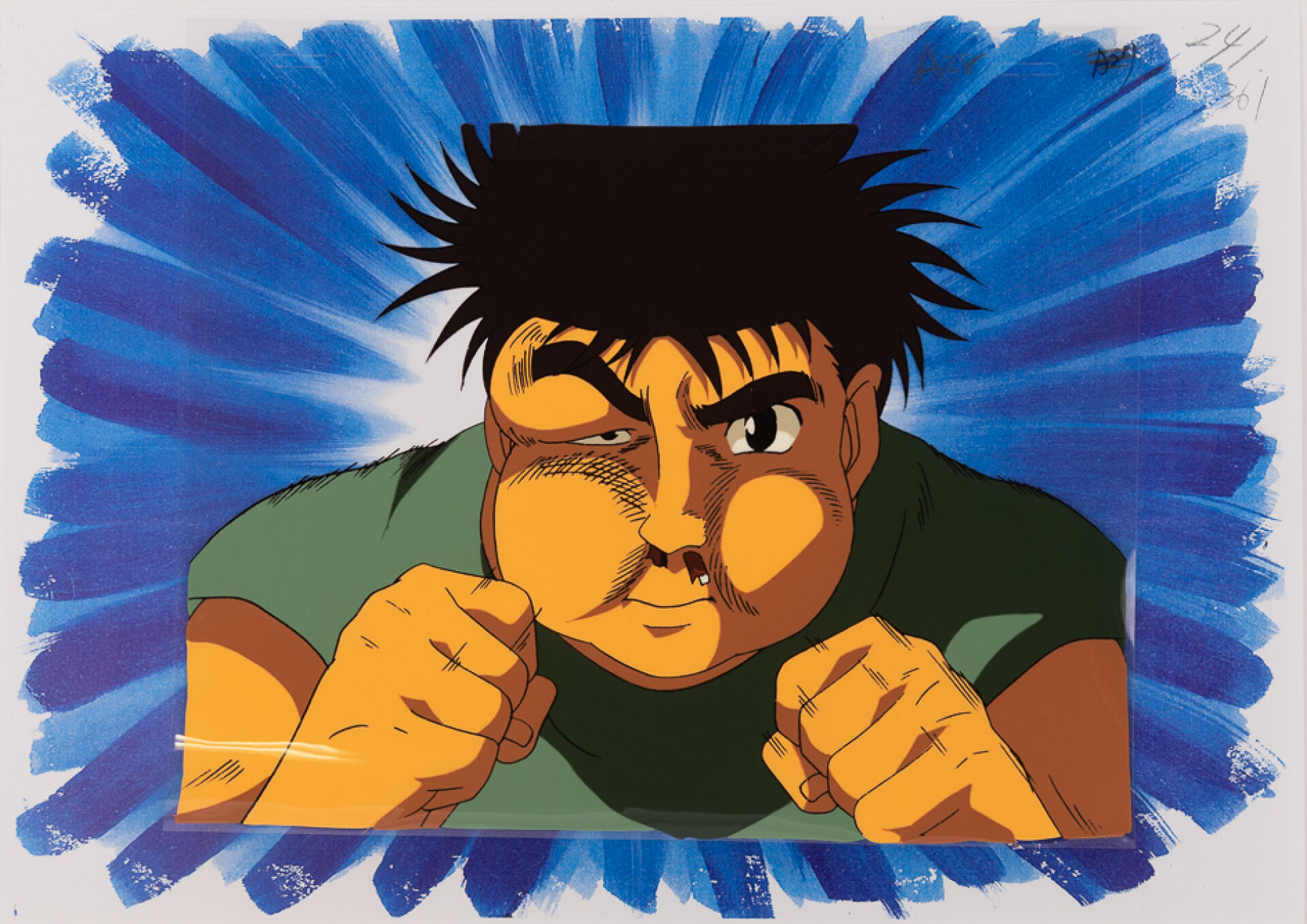 d'après l'œuvre de George Morikawa (森川 ジョージ) - Hajime no Ippo : New Challenger (はじめの一歩) Cellulo (cel / celluloïd) original à l'encre et à la gouache sur décor imprimé (non collé) représentant Ippo Makunouchi (幕之内一歩) lors d'un entraînement intensif. Haut. : 23,1 cm - Larg. : 26,2 cm pour le cellulo. Produit par studio Madhouse entre 2000 et 2002