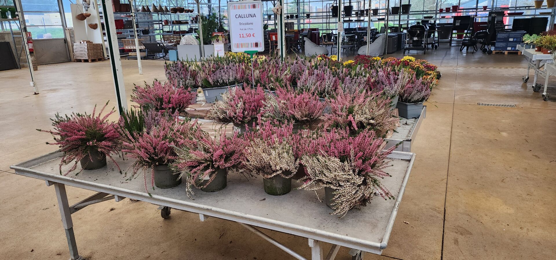 Sur 2 tables mobiles, un lot de 12 jardinières de 40cm de Calluna Carnaval et un lot de 10 pots de 17cm de Calluna Tricolore sans les tables