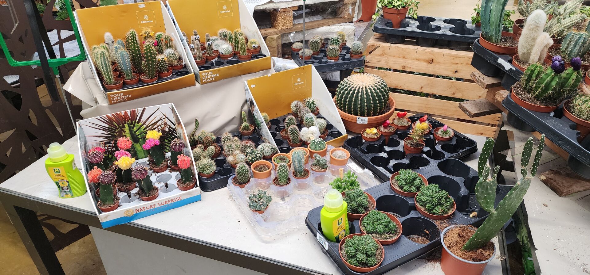 Sur 2 tables, un lot d'environ 120 pots de Cactus de différentes variétés (petit ou grand pots) sans les tables