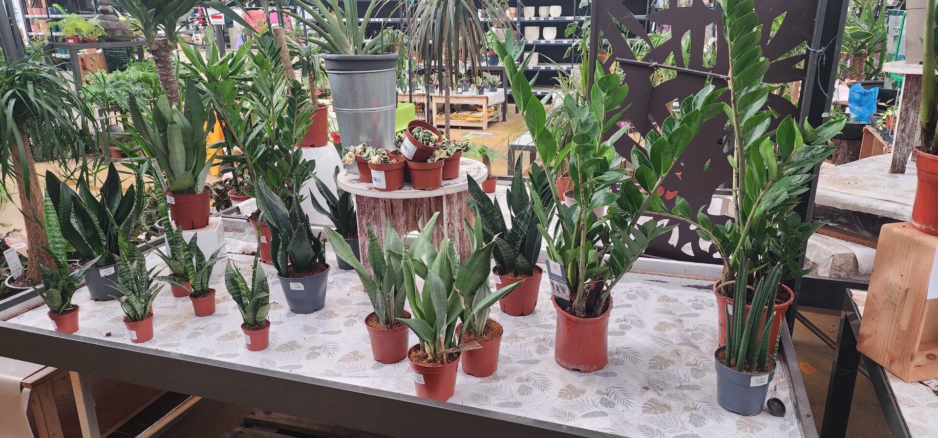 Sur 2 tables, un lot d'environ 34 pots de différentes variétés dont: 4 pots de Zamioculcas, 3 pots de Sanseveria varie, 4 pots de Sanseveria Special, 6 pots de Sanseveria Black, 6 pots de Hoya Variegata etc… sans les tables