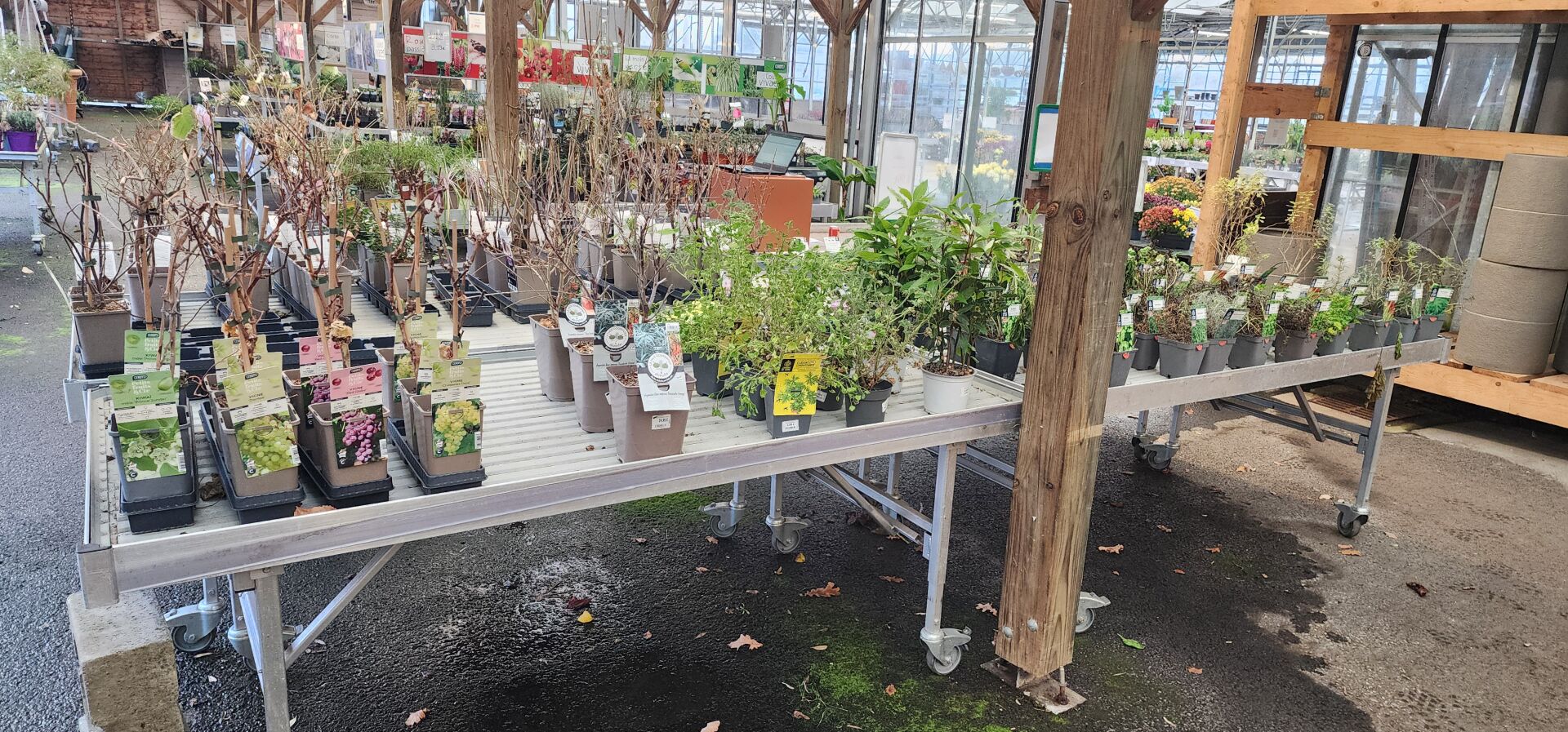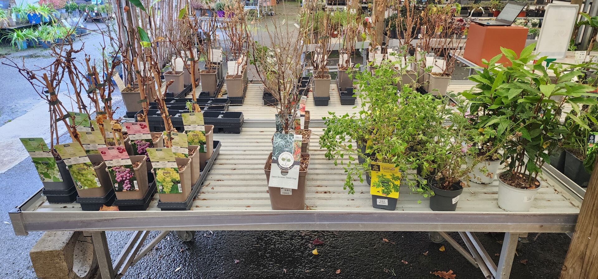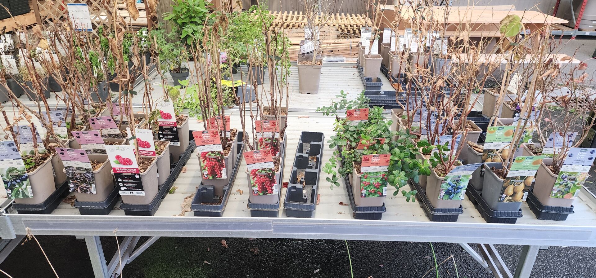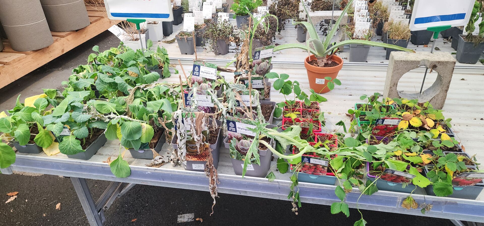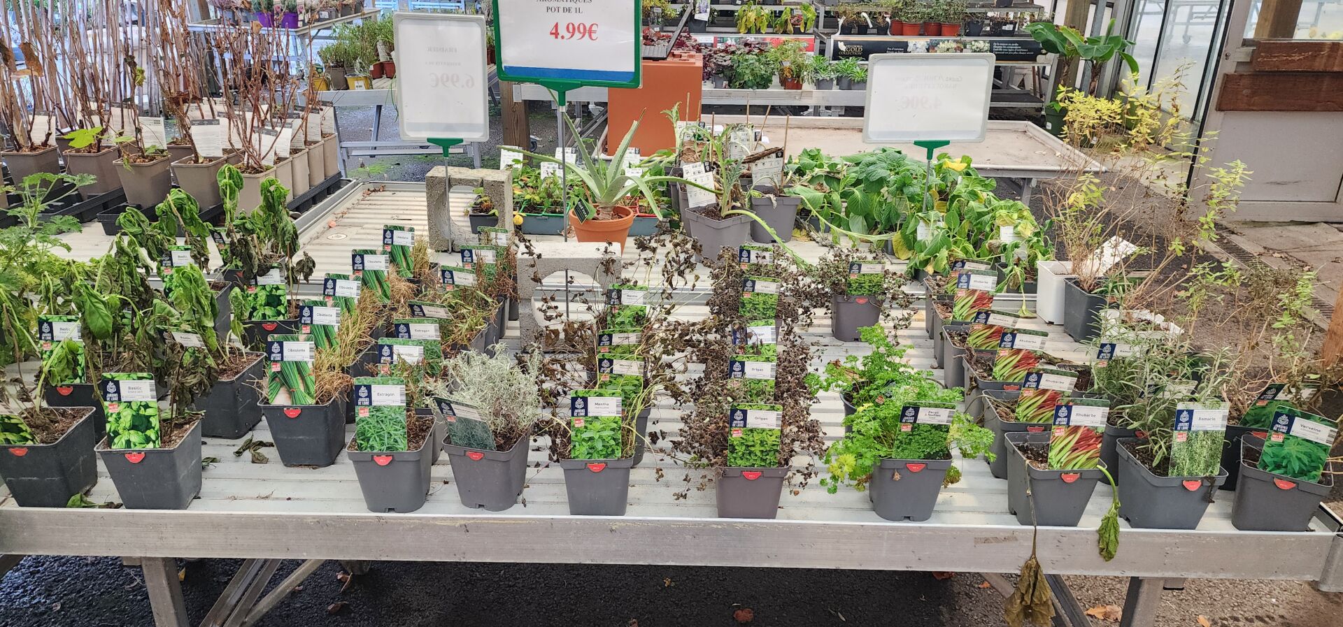 Sur 4 tables mobiles un lot d'environ 110 pots d'aromatiques, fruits, choux, betteraves, celeris dont : Figuier, Myrtille,Baie,Kiwi,Airelle,Groseille,Framboisier,Cassis,Olympus,Verveine,Romarin,Rhubarbe,Persil,Origan,Menthe,Ciboulette,Basilic etc… sans les tables