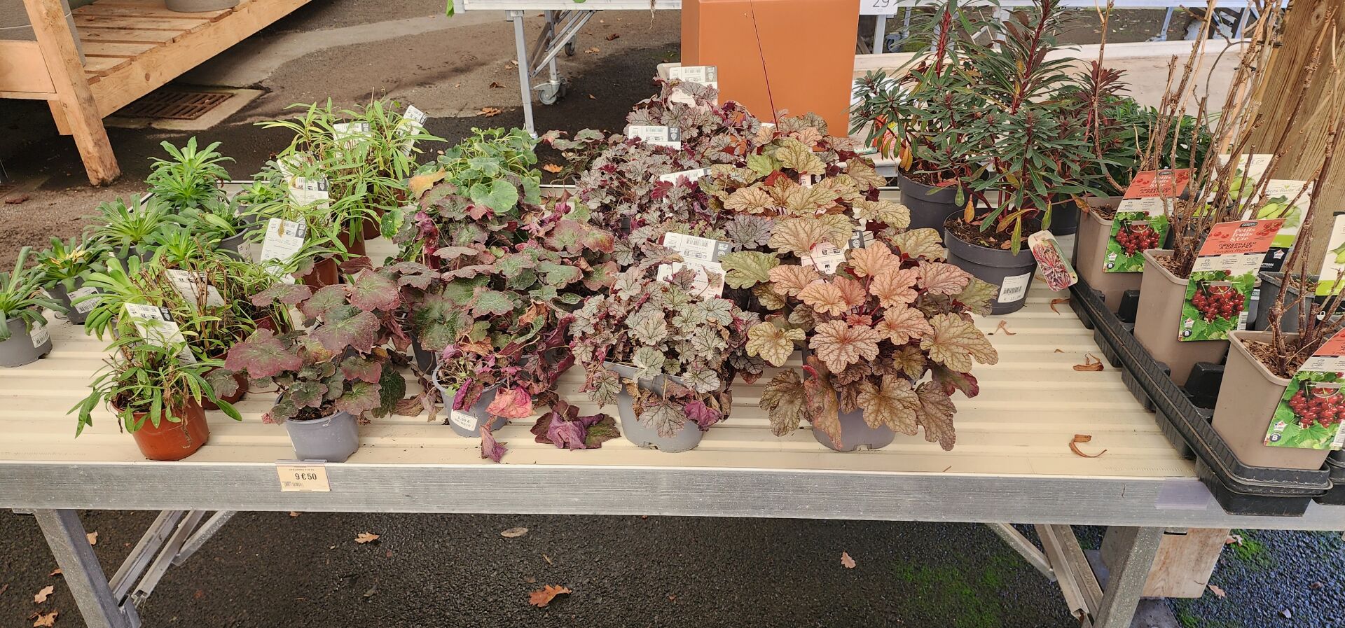 Sur 2 tables mobiles un lot d'environ 70 pots de différentes variétés dont: 4 pots de OEillet, 15 pots de Vergette, 17 pots de Sauge arbustive, 2 pots de Euphorbia Miner's, 17 pots de Heuchera,7 pots de Coreopsis, 10 pots de Lewisia sans les tables