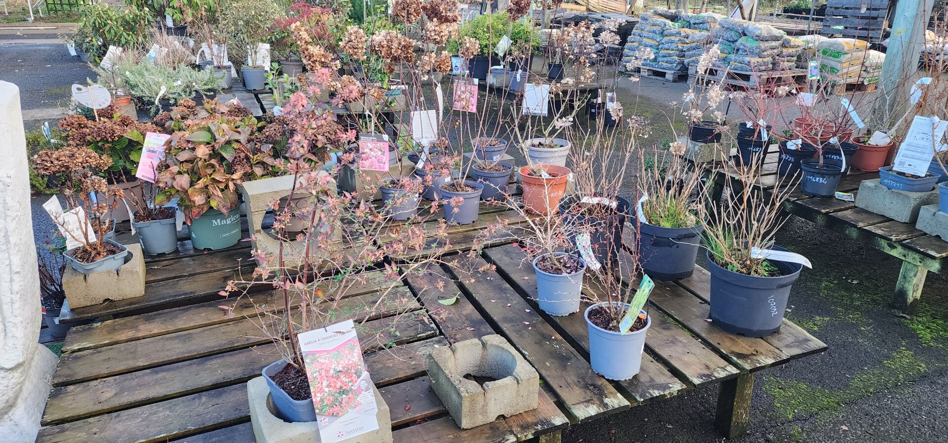 1 lot d'environ 50 pots de différentes variétés dont: Hortensia, Hydrangea, 5 pots de Forsythia, 4 pots de Cornus, 6 pots de Callicarpa etc…