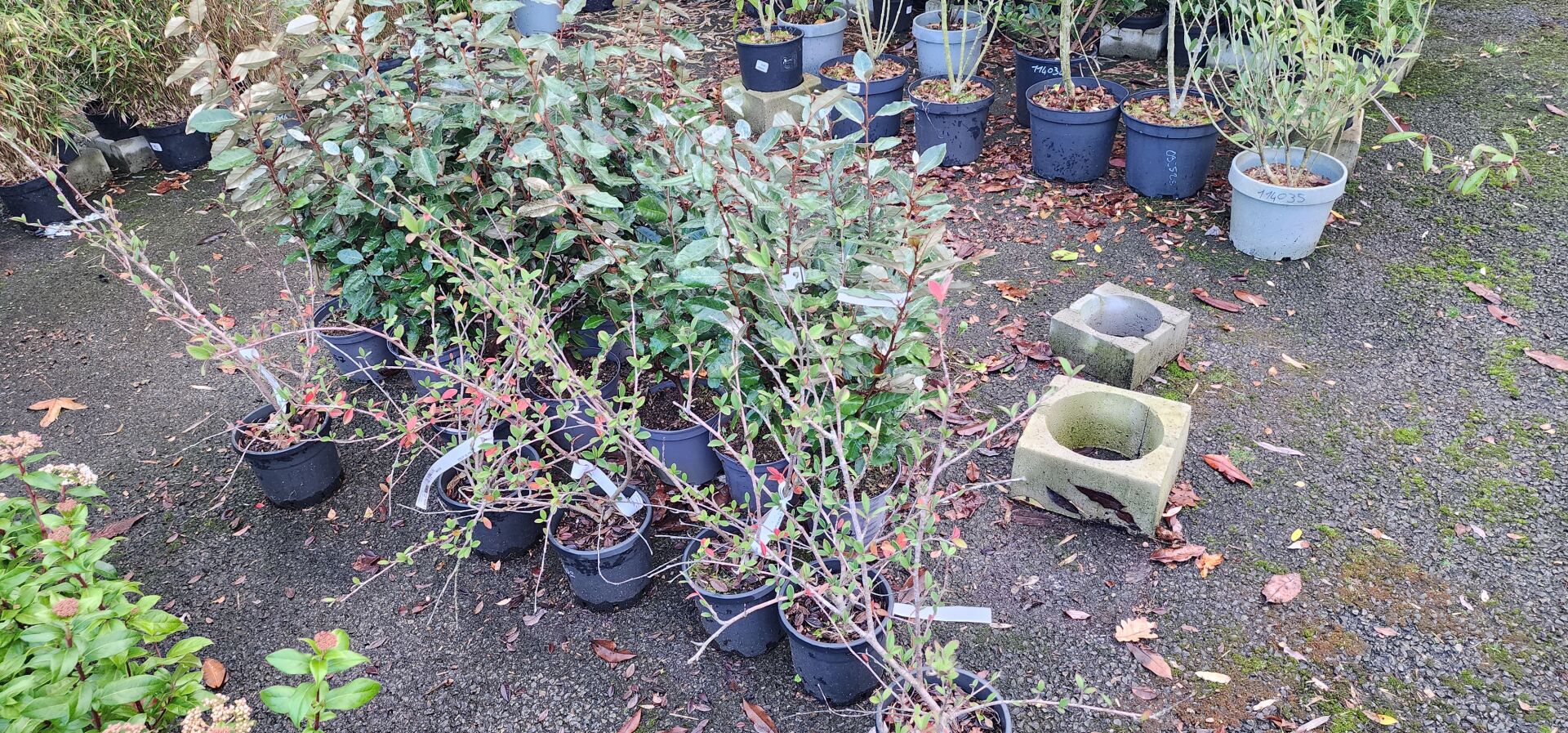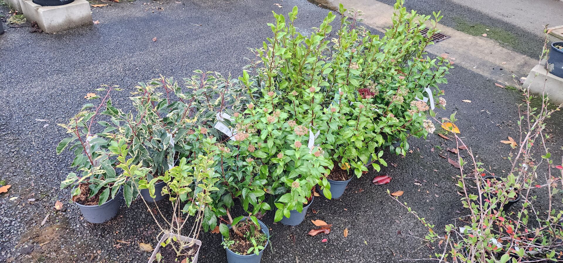 1 lot d'environ 35 pots de différentes variétés dont: Laurier, Cotoneaster Lacteus, Eleagnus