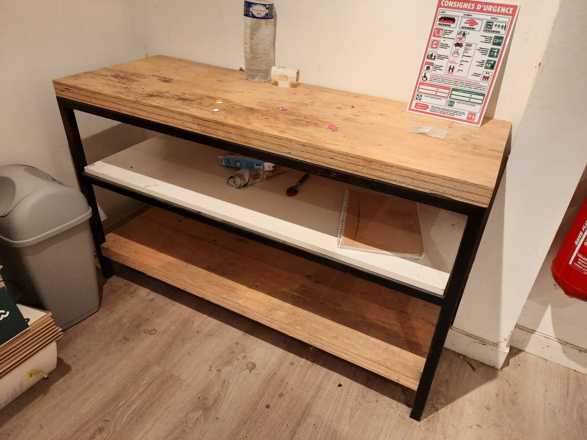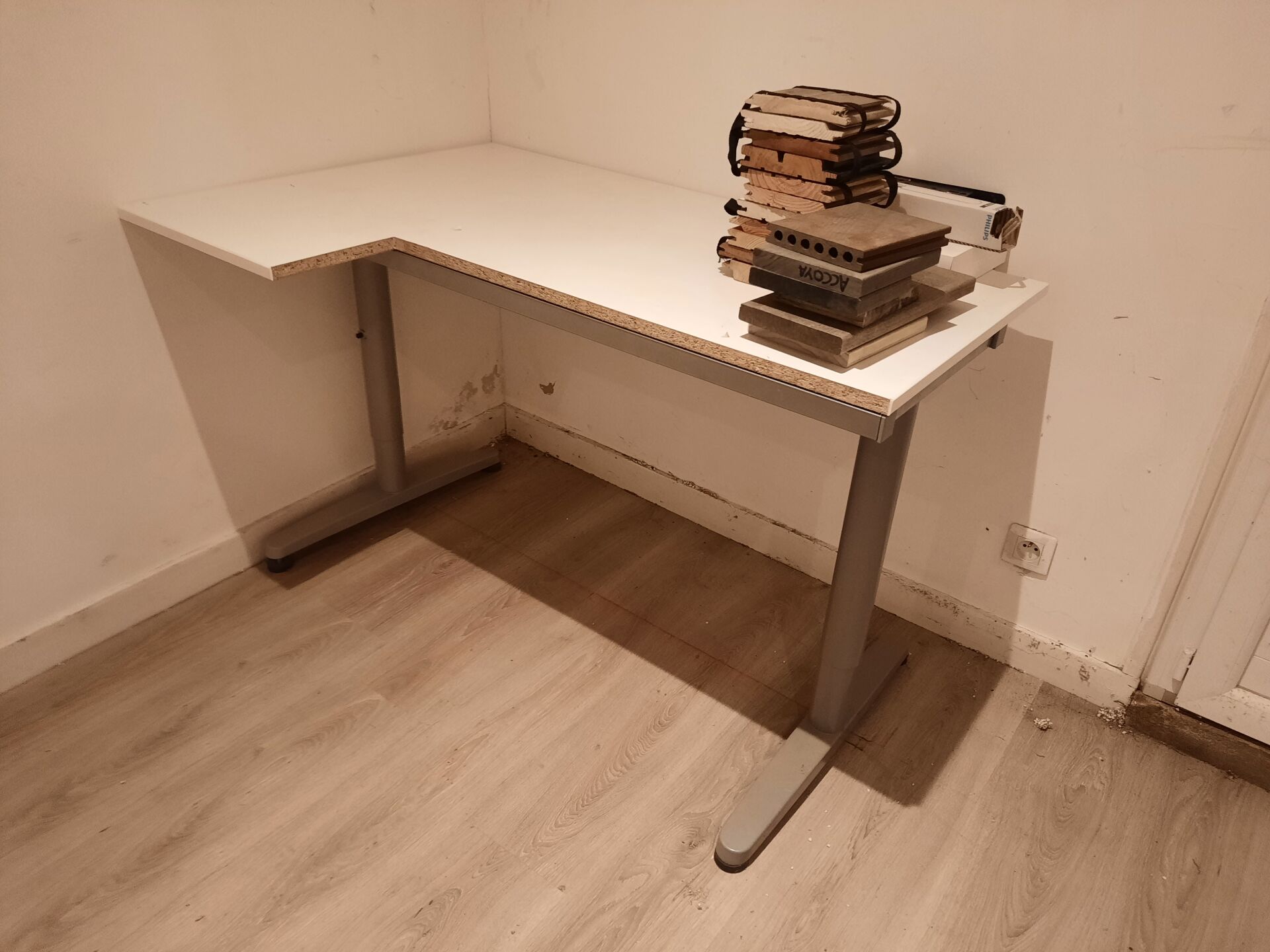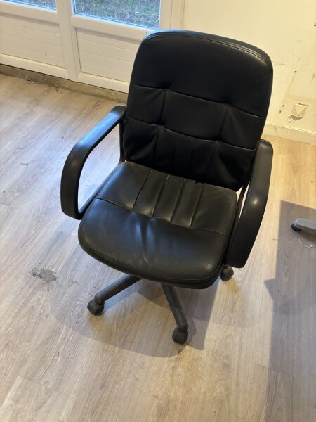3 tables en mélaminé blanc et métal laqué gris Fauteuil dactylo, assise en simili cuir noir Étagère en métal laqué noir et bois