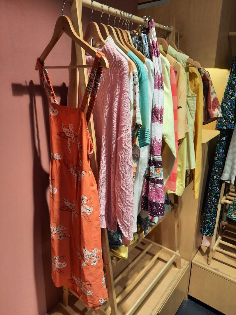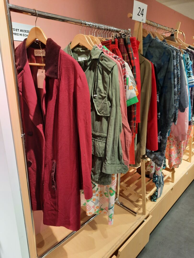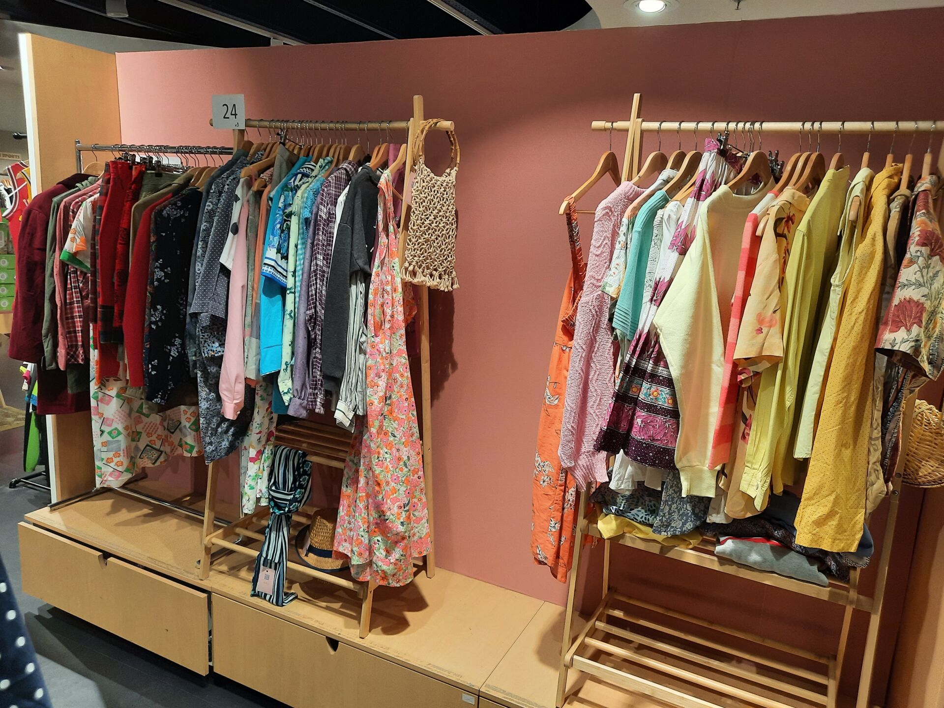 Ensemble d'articles de prêt à porter de seconde main composé d'environ , 70 jupes, pulles pantalons, chemisiers, vestes, robes, tailles et coloris divers