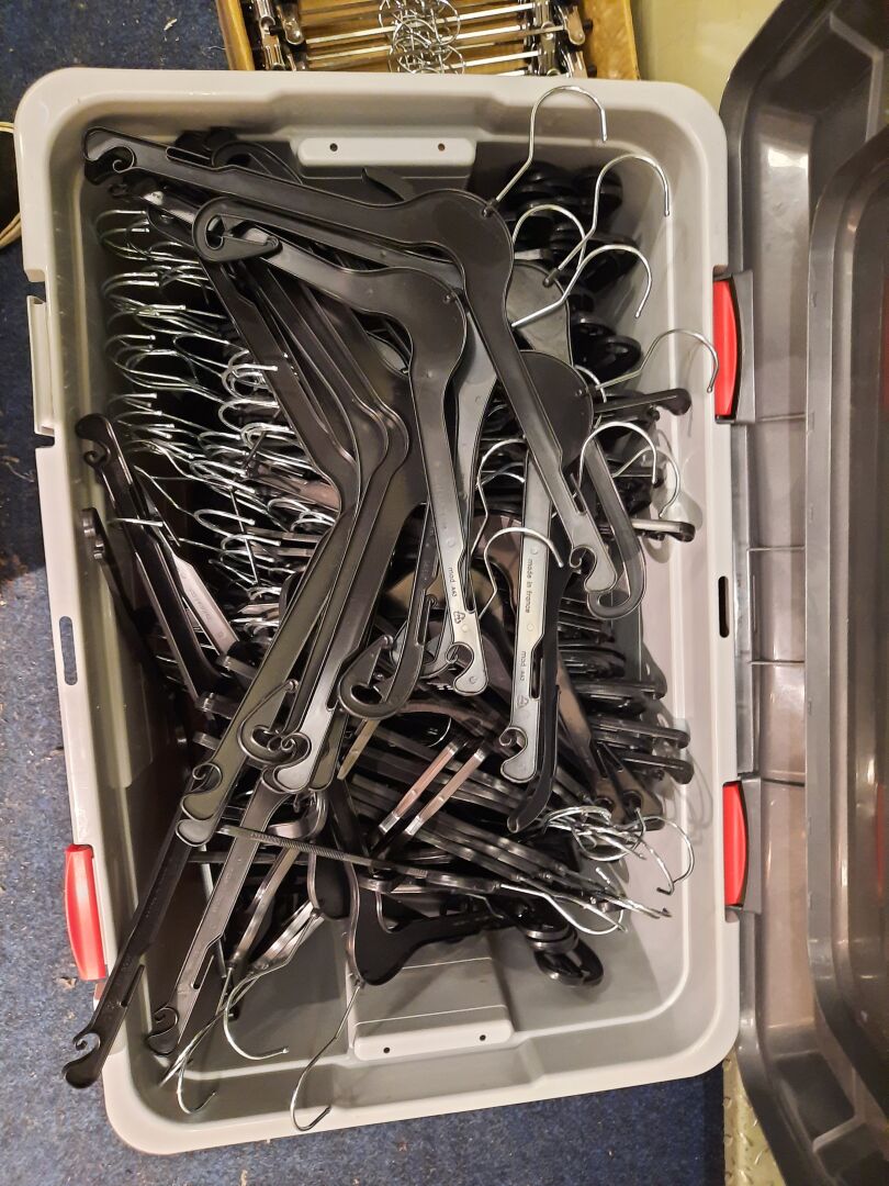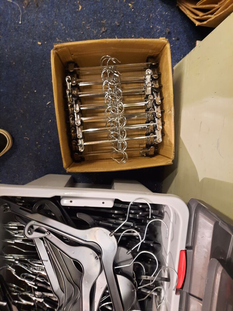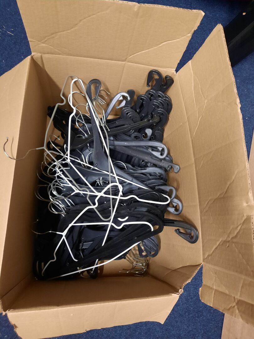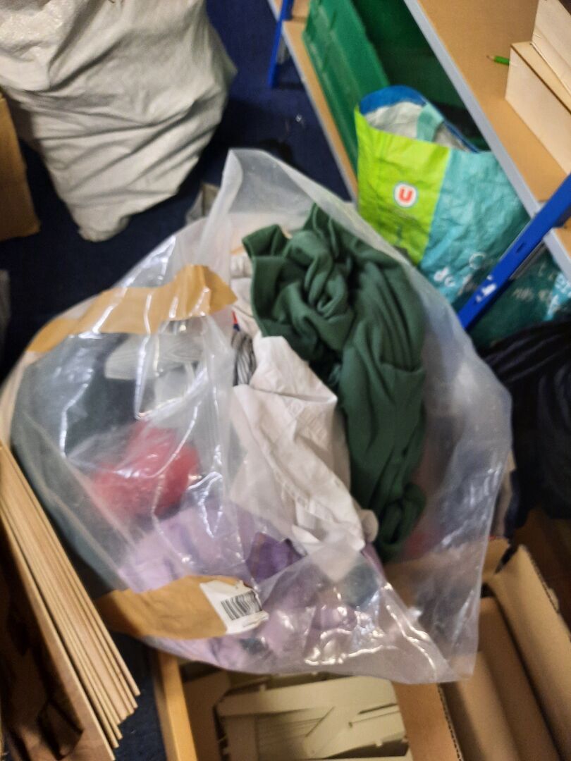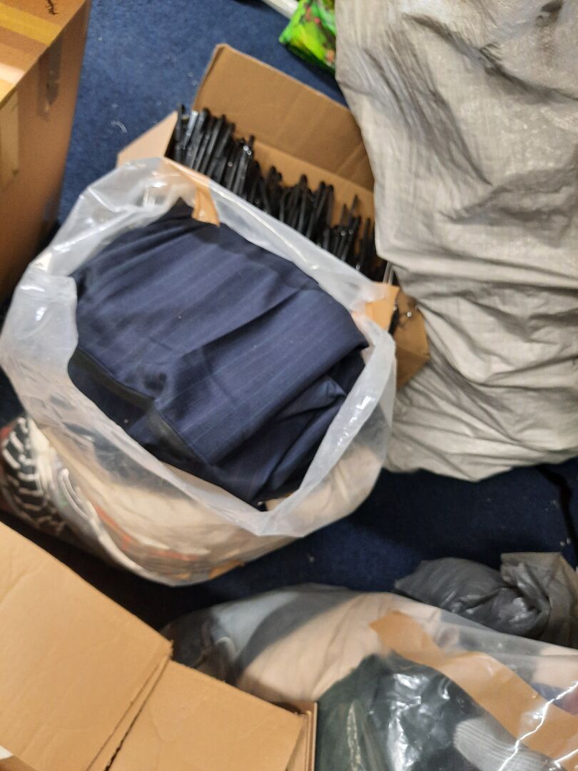 Dans la réserve, ensemble d'articles de prêt à porter de seconde main dans des sacs et cartons. On joint ensemble de cintres contenus dans la réserve
