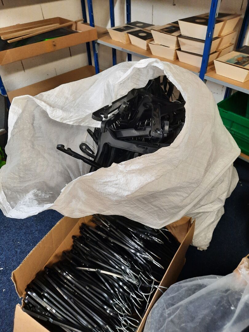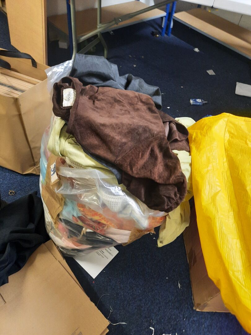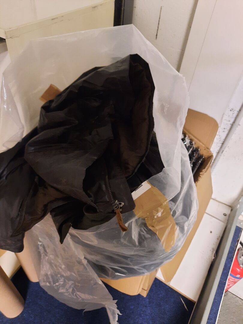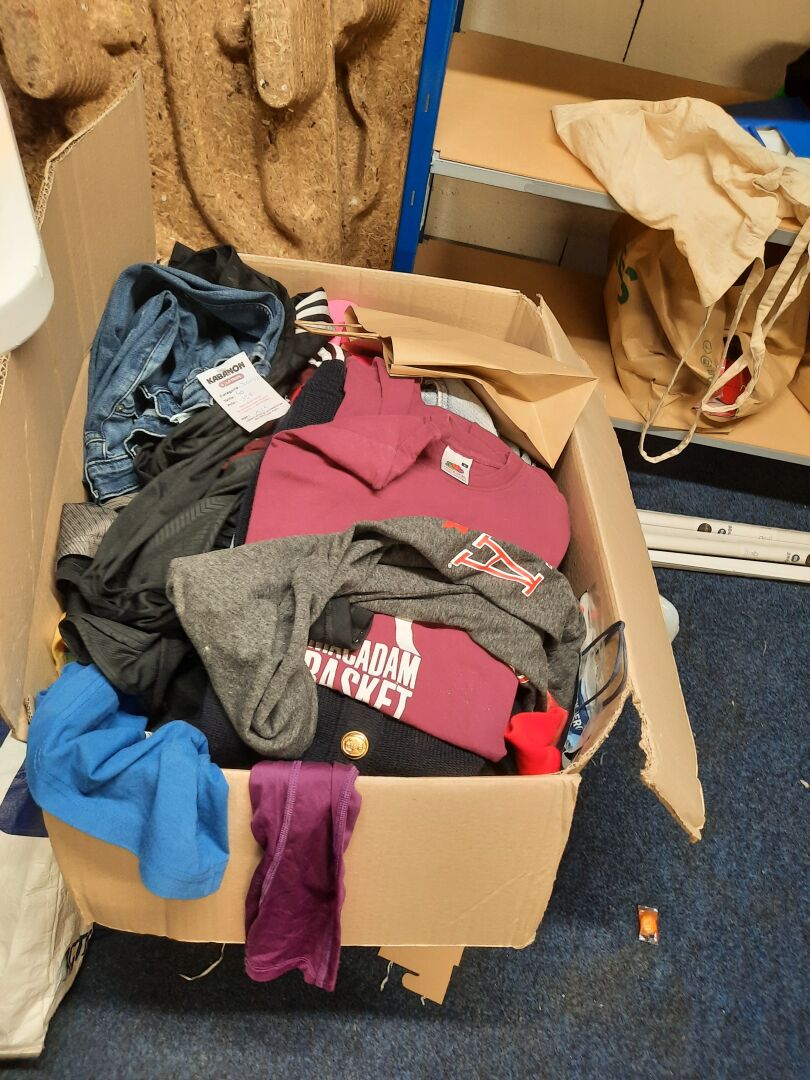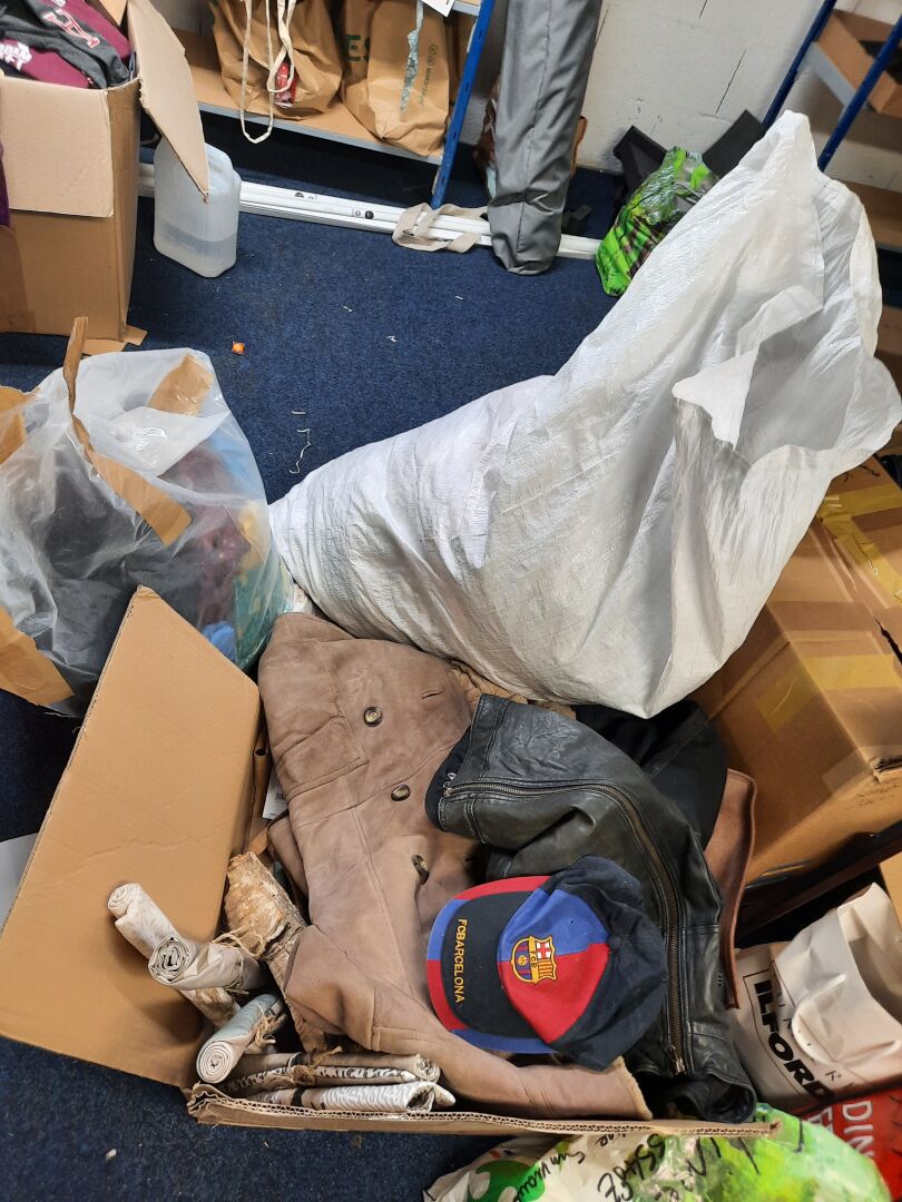 Dans la réserve, ensemble d'articles de prêt à porter de seconde main dans des sacs et cartons. On joint ensemble de cintres contenus dans la réserve