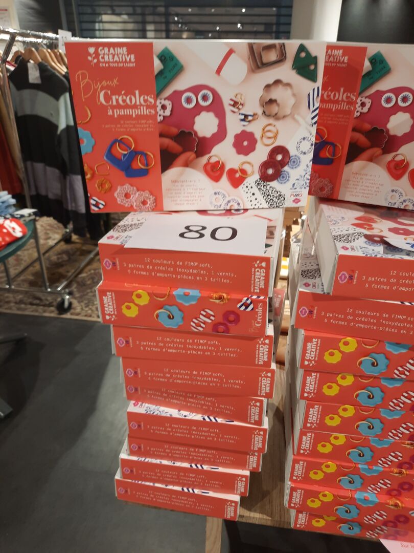 Ensemble de 10 kits créatifs "Bijoux créoles à pampilles" en pâte fimo (éd Graine créative), prix magasin total environ 380 €