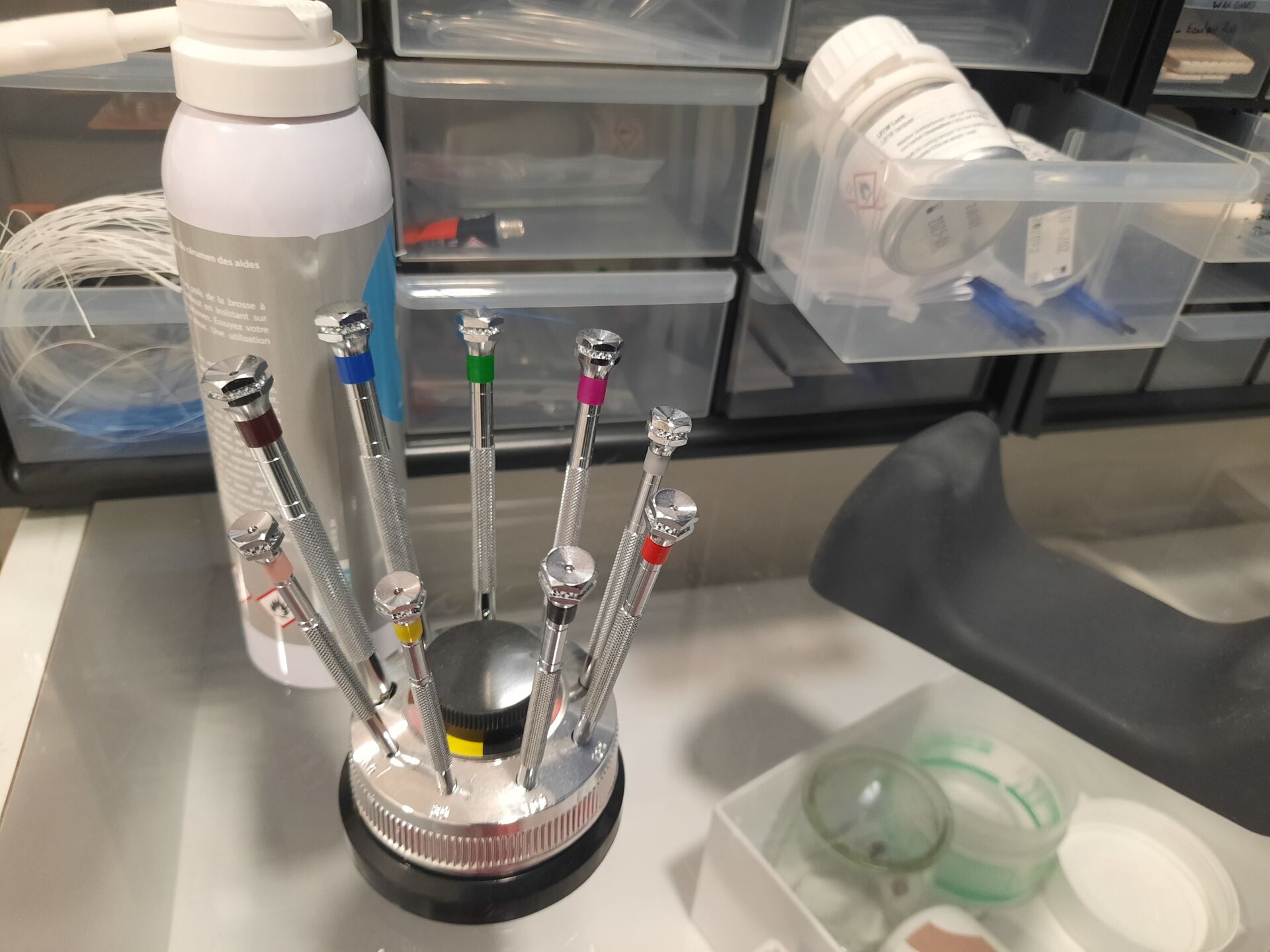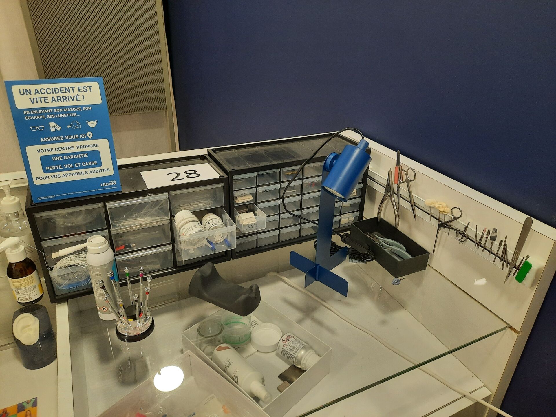 1 lampe de bureau métal bleu 1 tourniquet à tournevis, 1 lot de pinces et petits outillages, 2 organiseurs plastiques