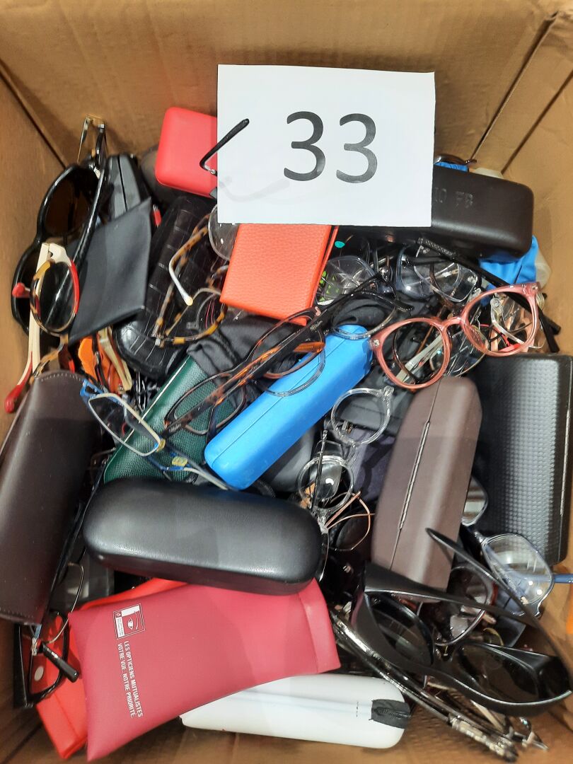 Petit stock de lunettes de vue, lunettes de soleil, boitier de lunettes On joint : Stock de pièces détachées pour montures