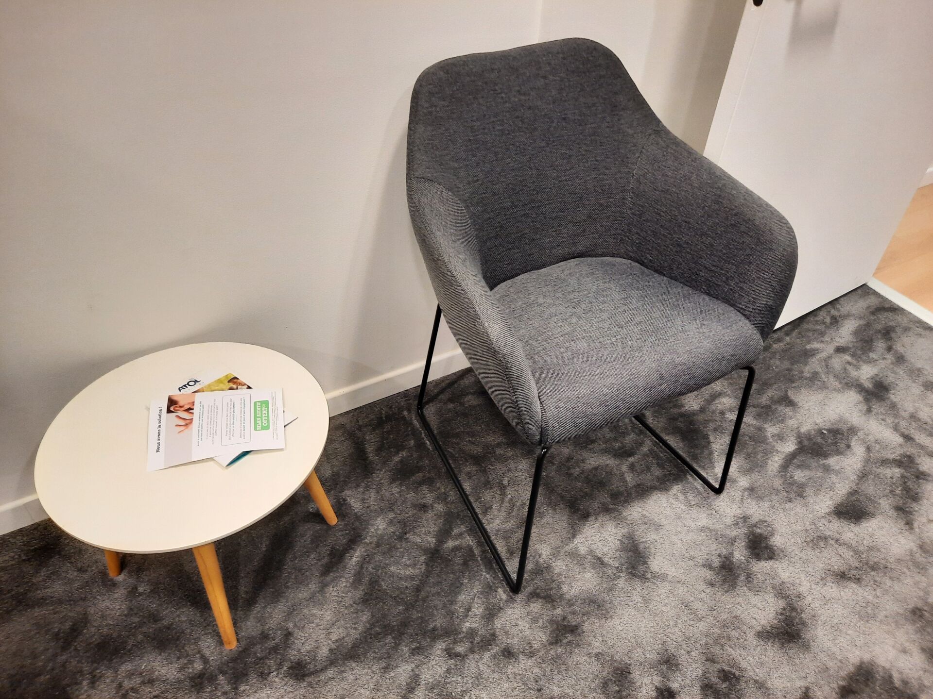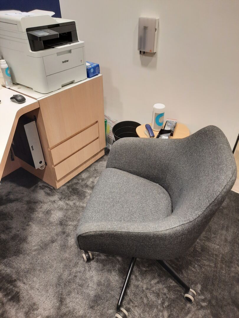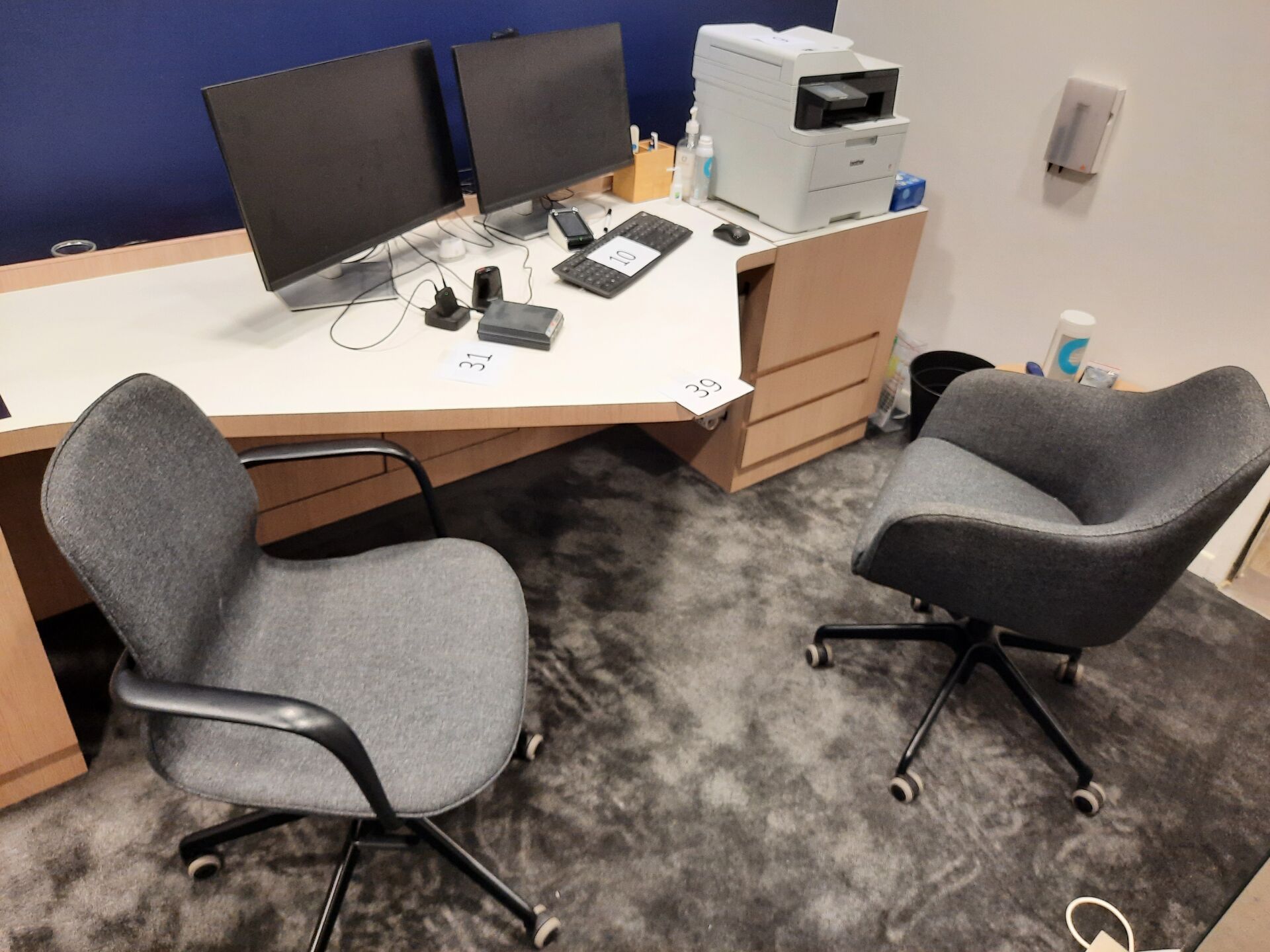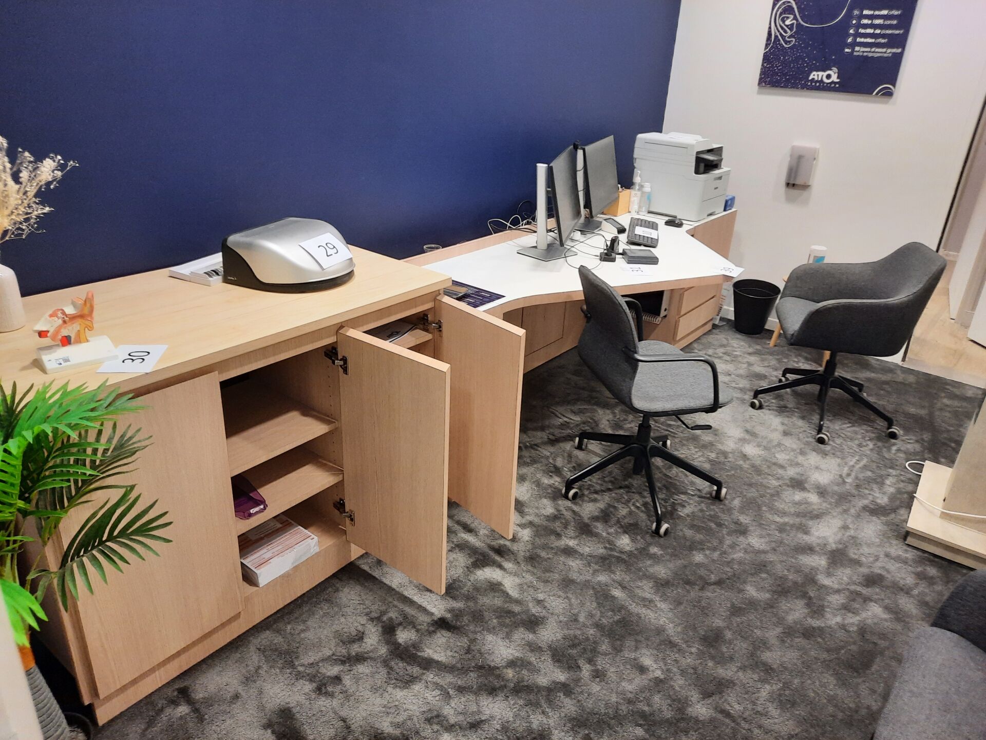 1 meuble bas 3 portes mélaminé bois, 1 bureau mélaminé blanc/bois, de forme libre 2 fauteuils tournants/roulants 2 tables basses, 1 fauteuil tissu gris piétement métal
