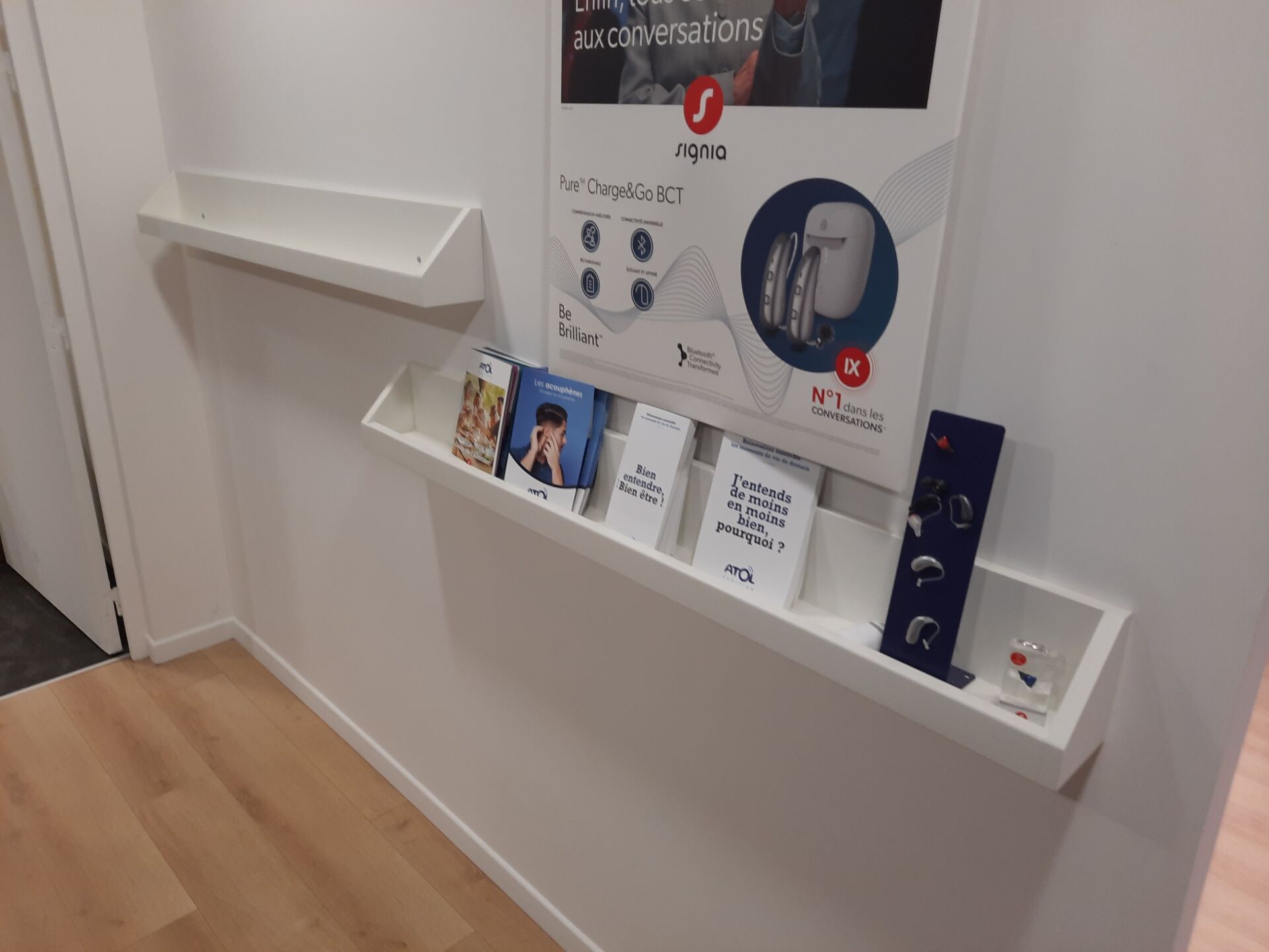 1 comptoir signé "ATOL AUDITION", 160x65 cm 2 étagères murales, 3 tabourets tournants 1 table mélaminé blanc A DEMONTER PROPREMENT SANS DOMMAGE A L IMMEUBLE