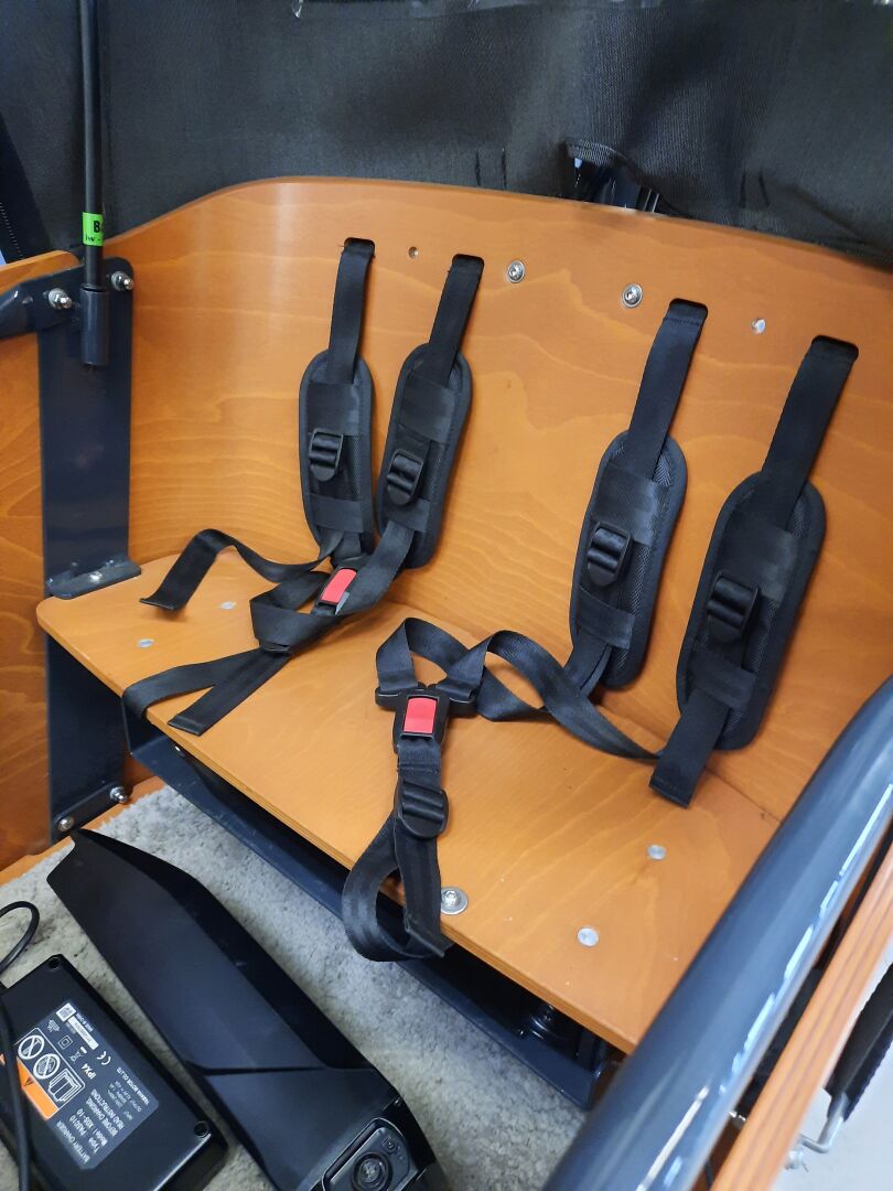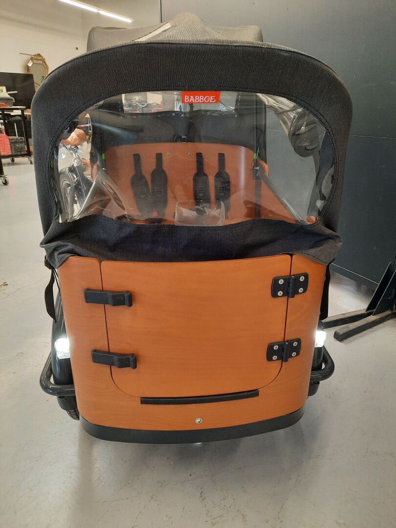 Vélo cargo électrique BABBOE modèle CURVE triporteur de 2023, caisse avec 1 banc et tente de protection de pluie. Long. : 215 cm - Larg. : 89 cm 2 batteries. Kilométrage : 363 kms Prix d'achat 5316.70€ TTC