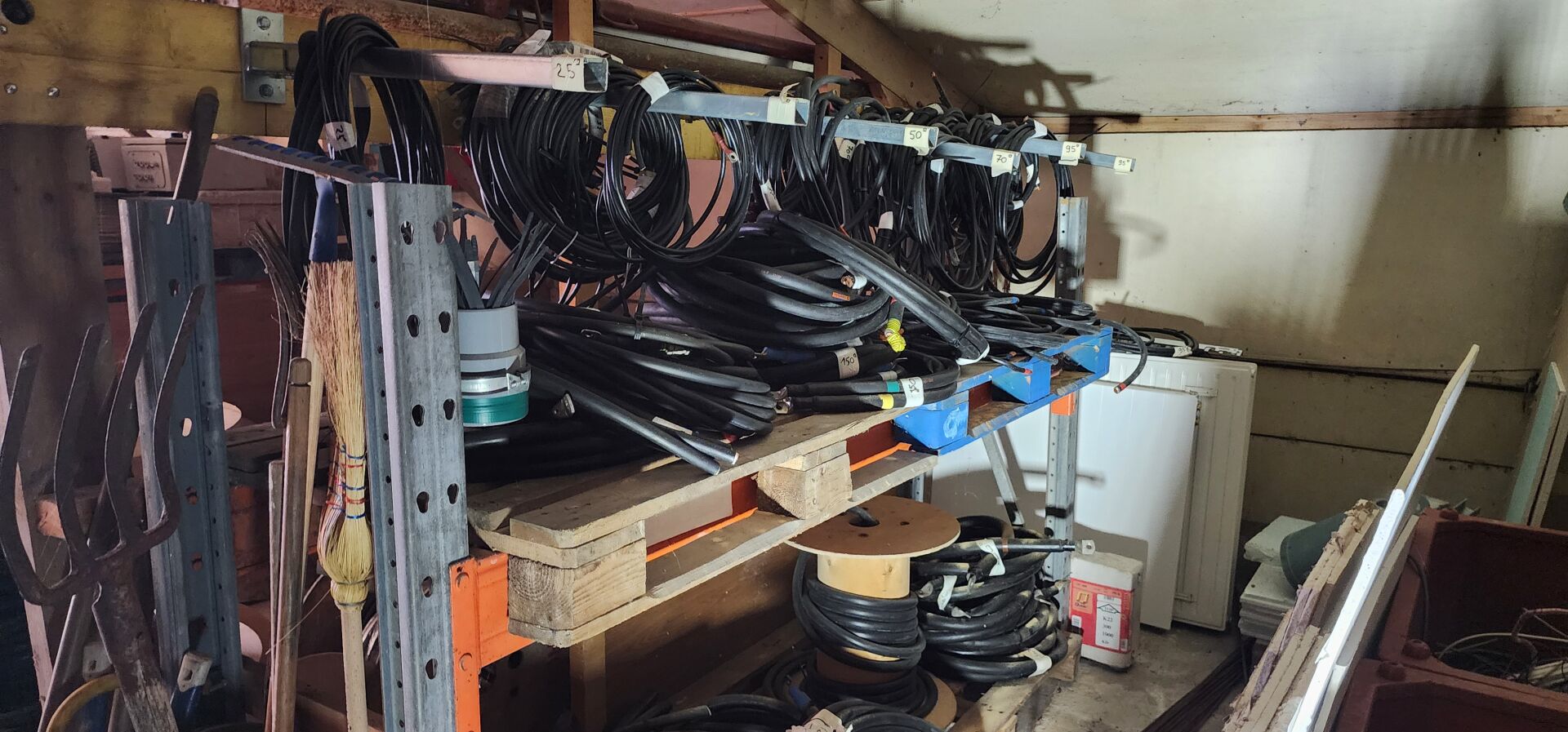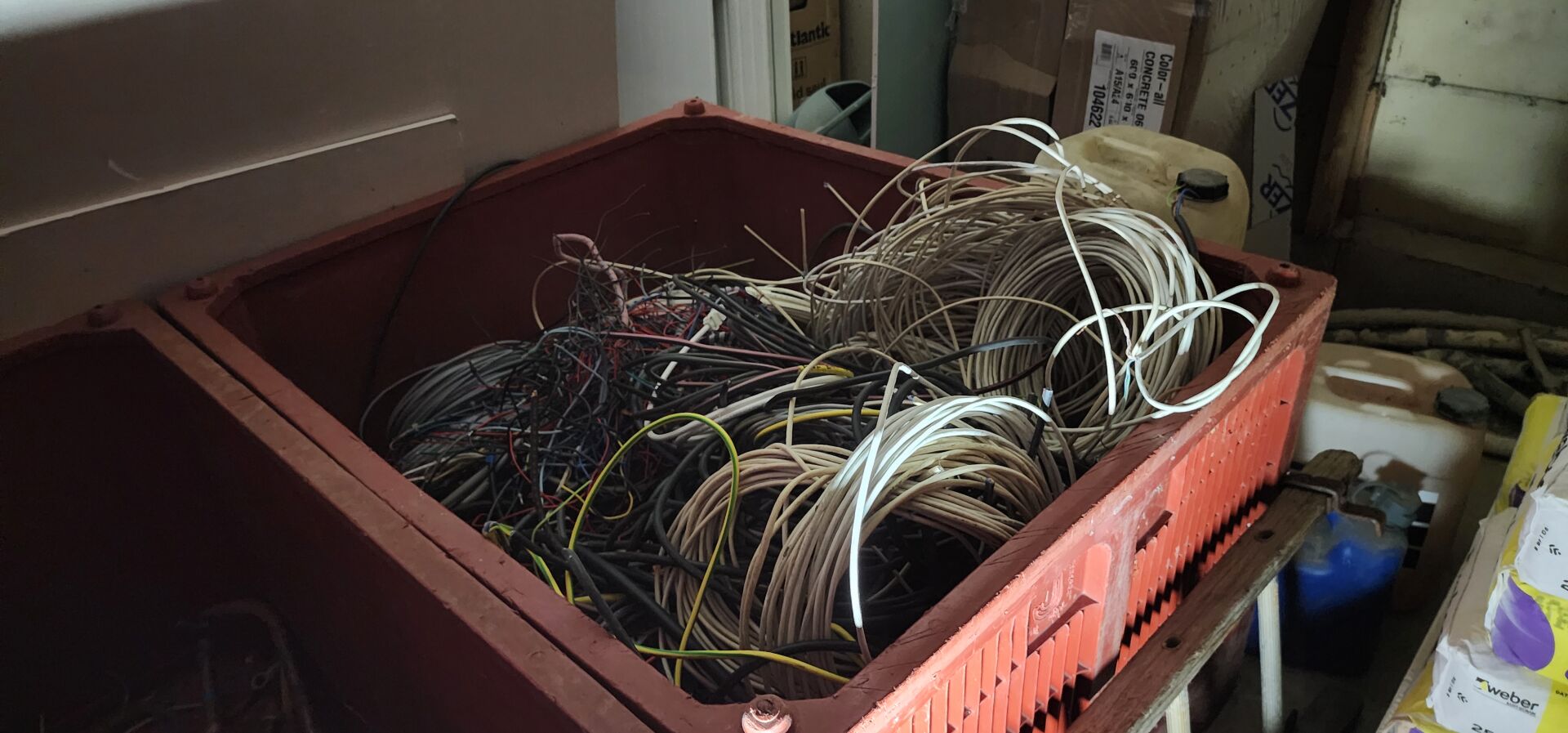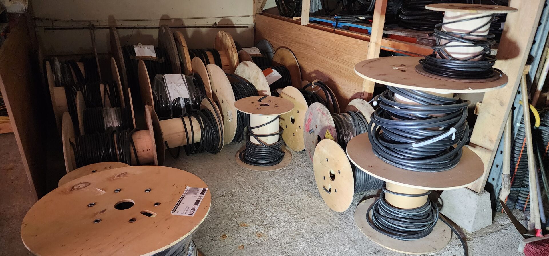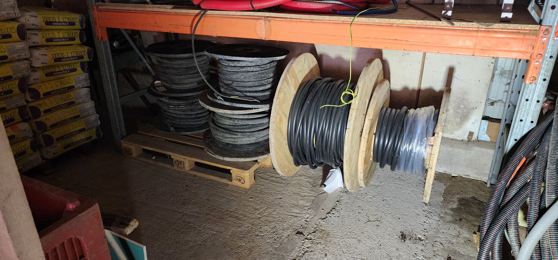 Environ 20 tourets entamés de câble électrique différentes sections + environ 30 couronnes de câble électrique + chutes de câbles dont 2 bacs rouges