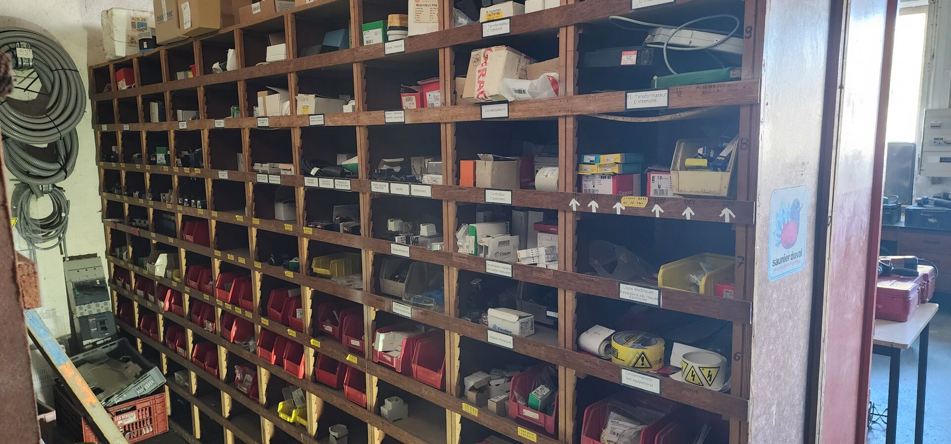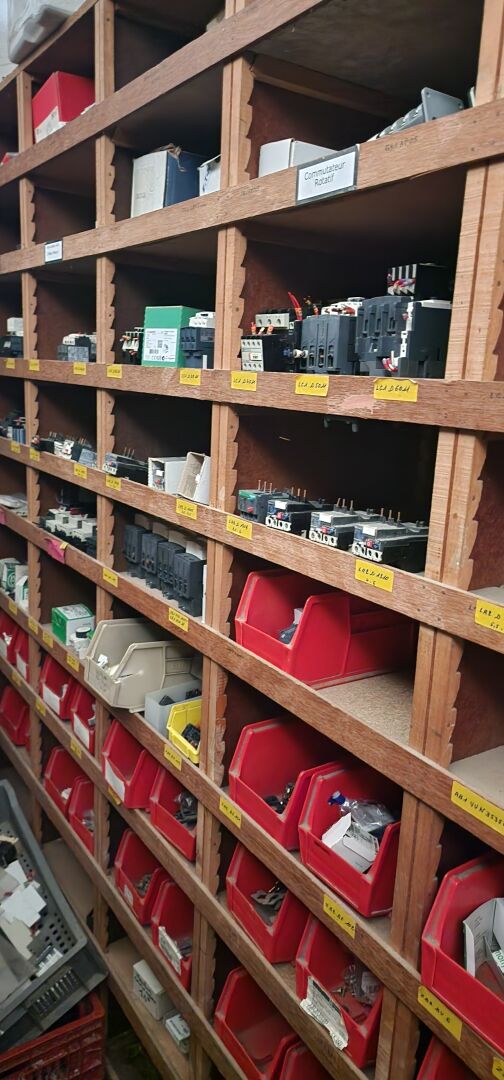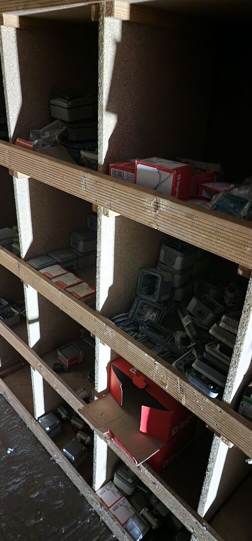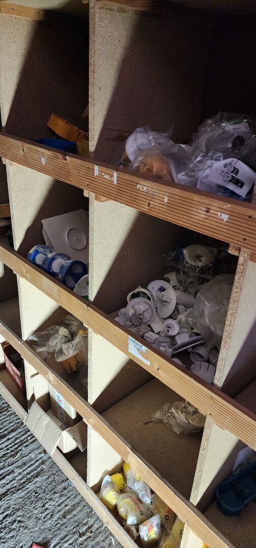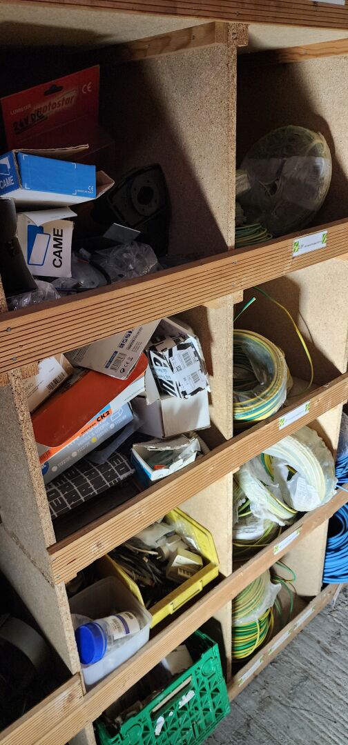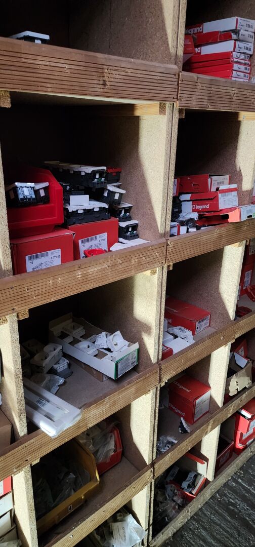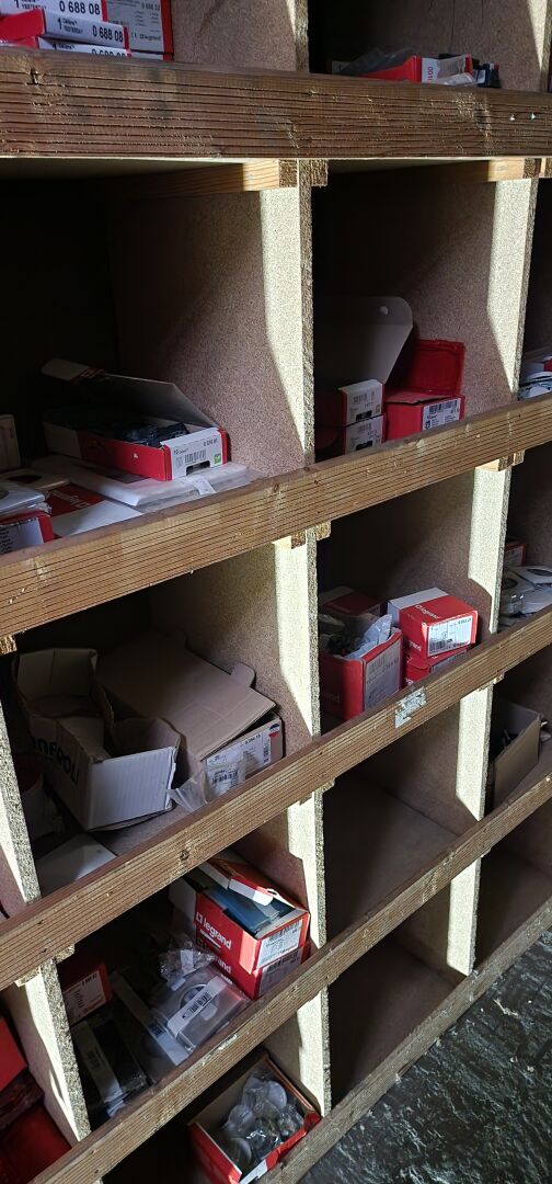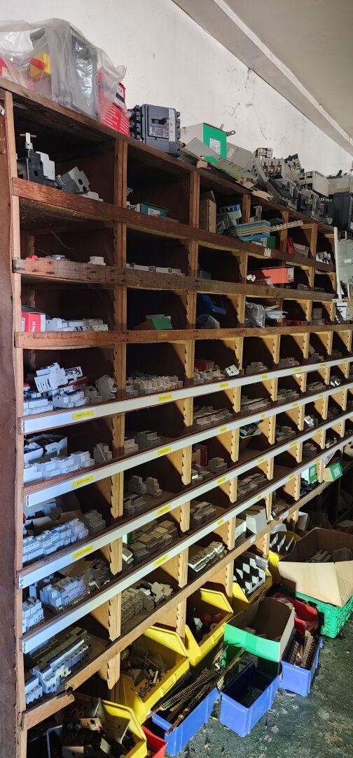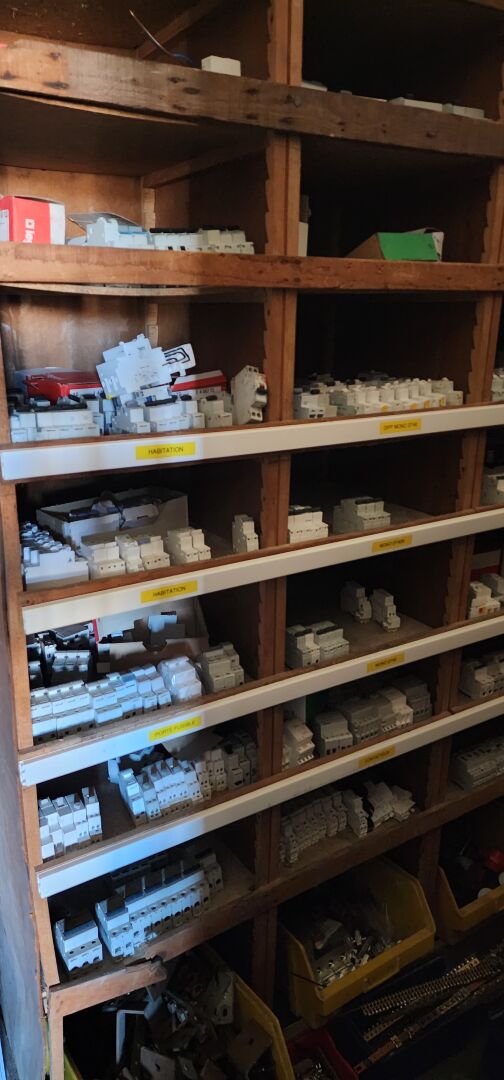 Le contenu de 9 étagères bois à cases comprenant : disjoncteurs et accessoires dont LEGRAND , SCHNEIDER etc..., porte-fusibles, rouleaux de fils électriques différents diamètres, fusibles différents ampérages, bornes, cosses pour cuivre, gaines thermorétractables, ampoules diverses dimensions et puissances, barrettes électriques, starters, blocs prises, raccords passe-câbles, boitiers de dérivation, prises électriques classiques et triphasées, douilles, lot de quincaillerie diverse dont chevilles, vis etc... notamment LEGRAND et SCHNEIDE