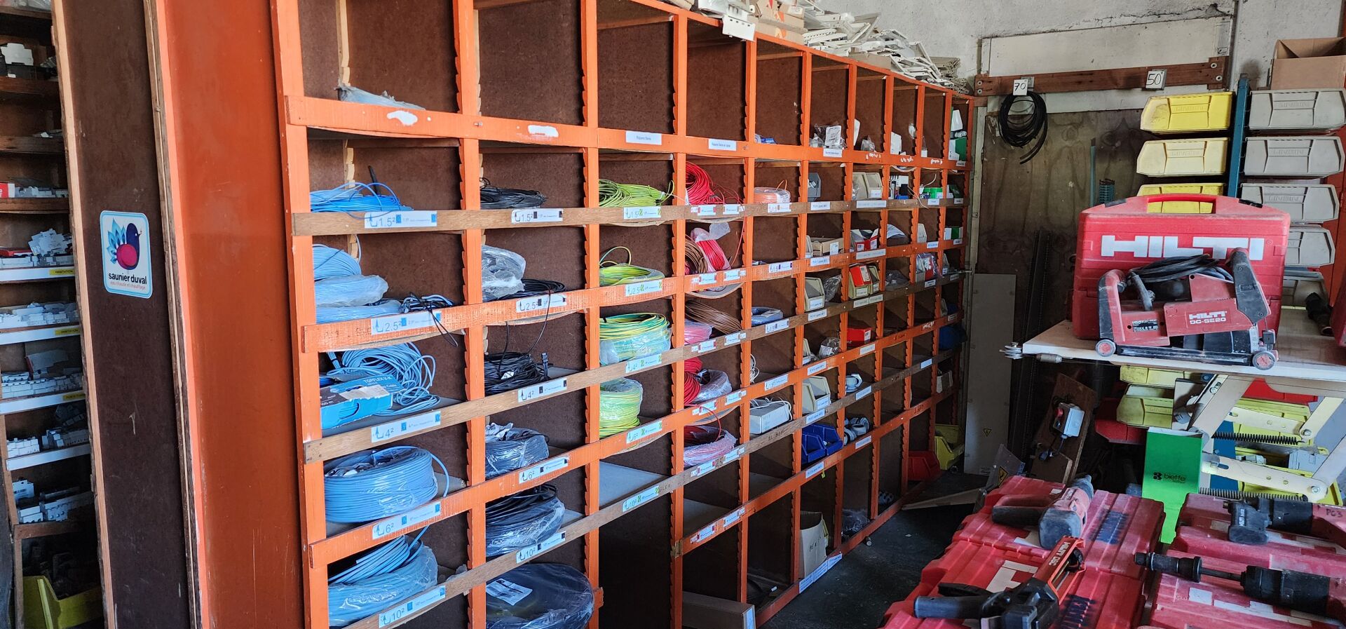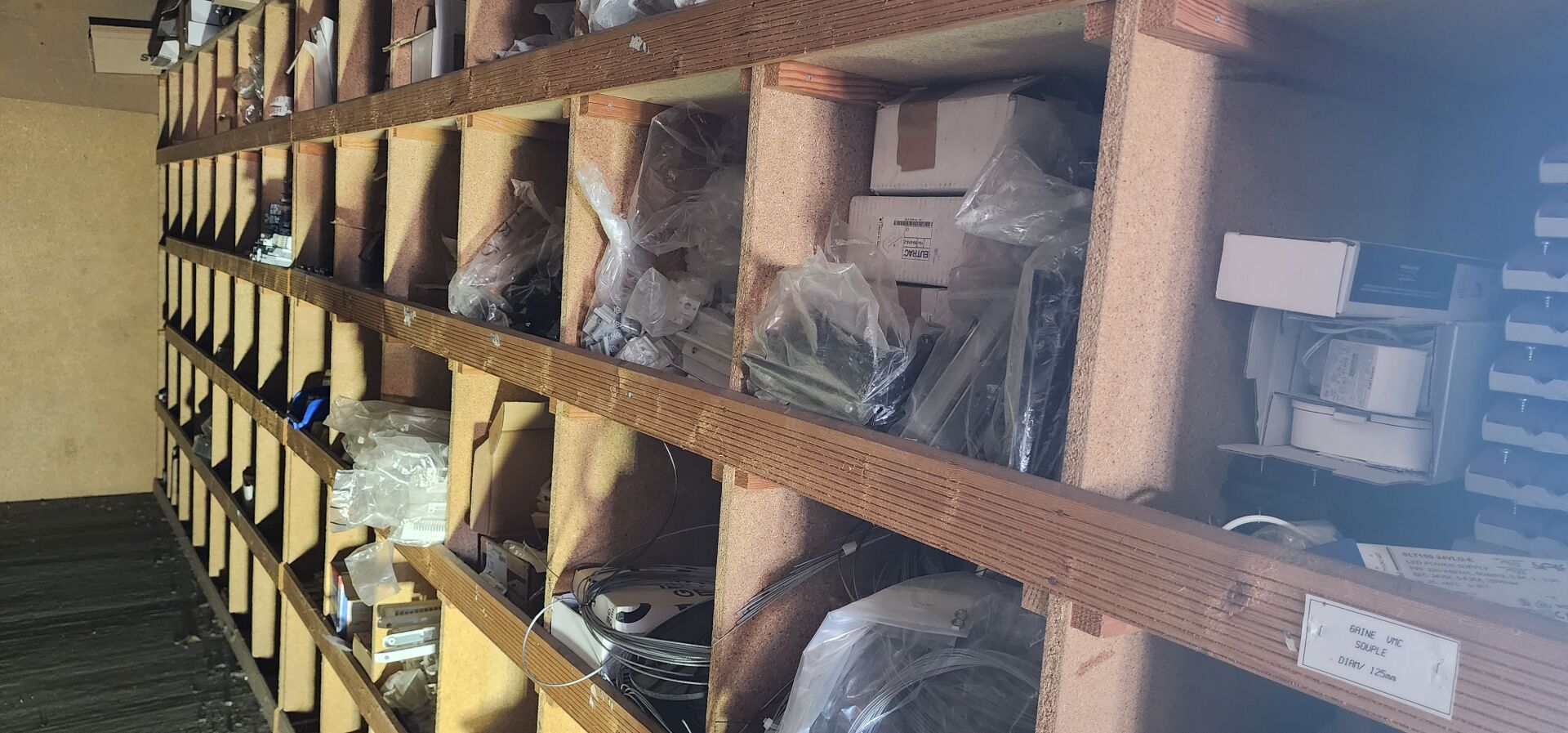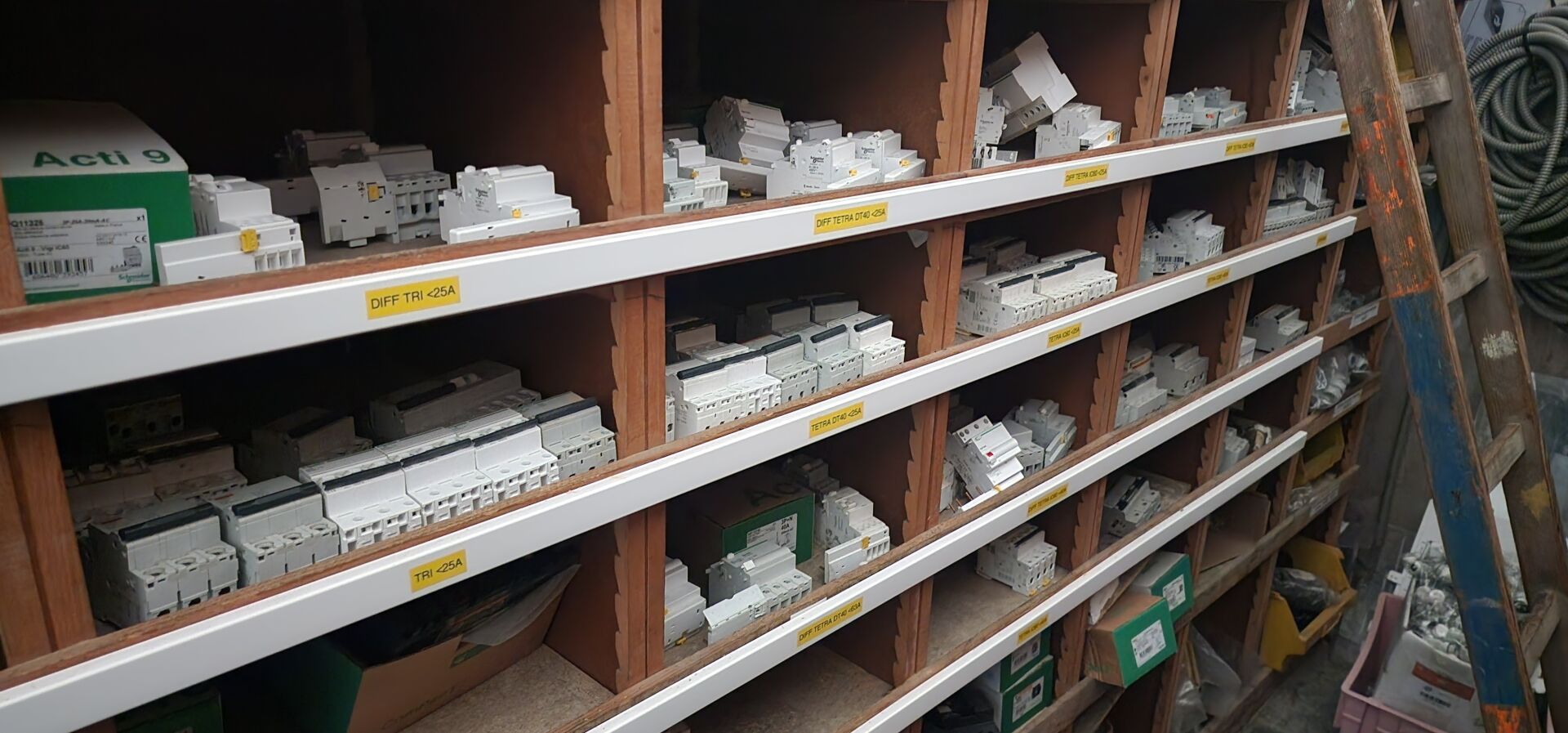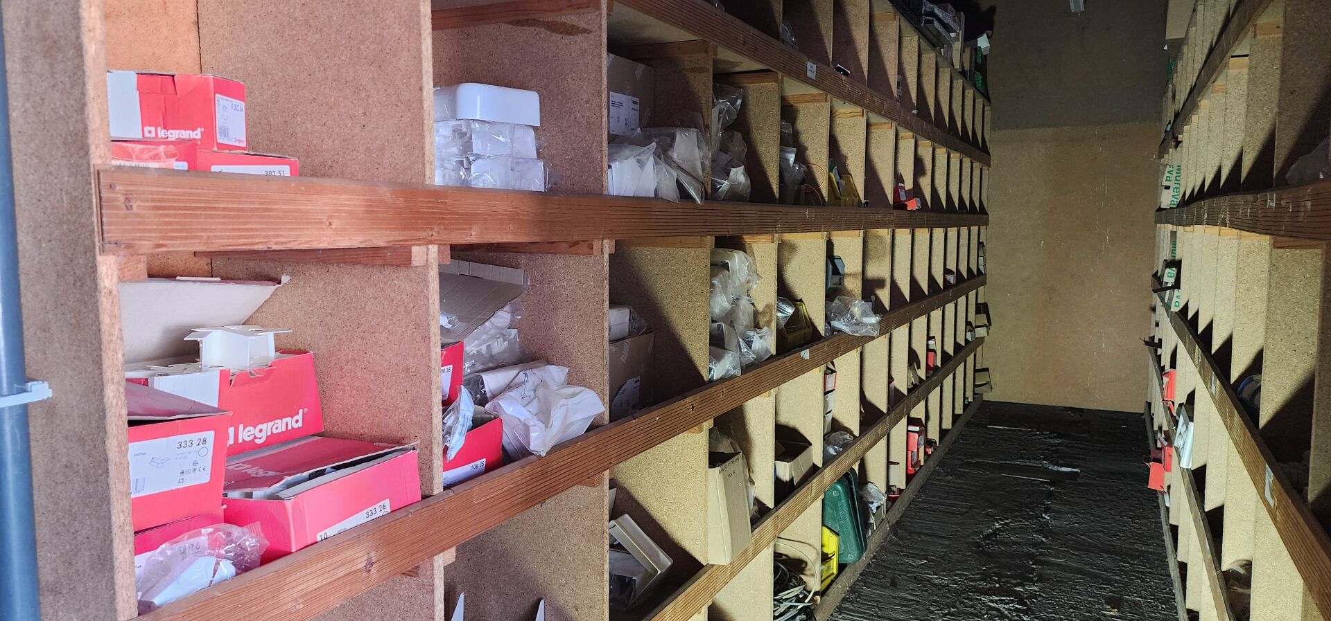 Le contenu de 9 étagères bois à cases comprenant : disjoncteurs et accessoires dont LEGRAND , SCHNEIDER etc..., porte-fusibles, rouleaux de fils électriques différents diamètres, fusibles différents ampérages, bornes, cosses pour cuivre, gaines thermorétractables, ampoules diverses dimensions et puissances, barrettes électriques, starters, blocs prises, raccords passe-câbles, boitiers de dérivation, prises électriques classiques et triphasées, douilles, lot de quincaillerie diverse dont chevilles, vis etc... notamment LEGRAND et SCHNEIDE
