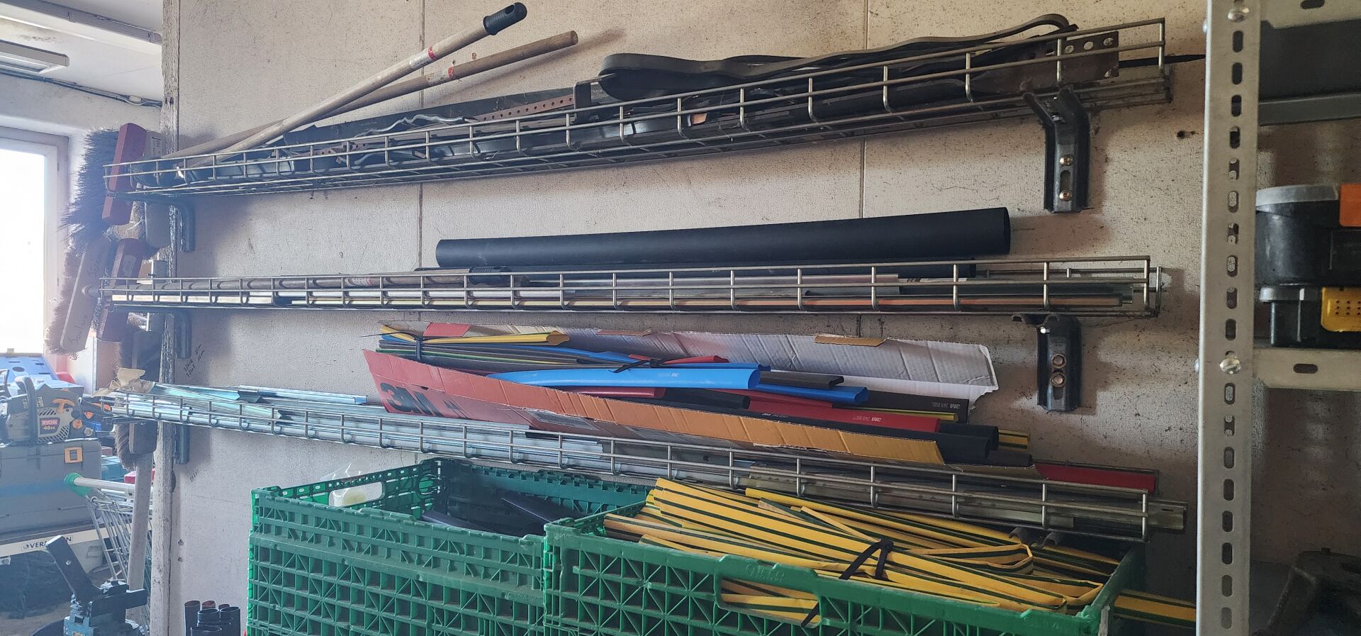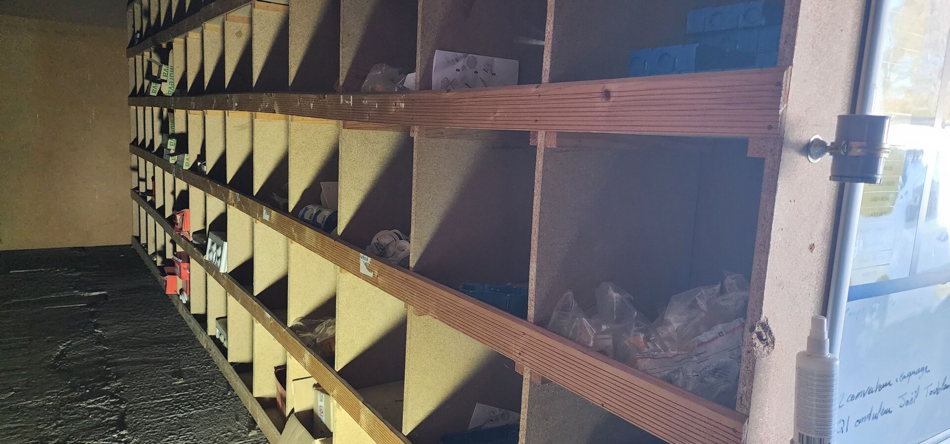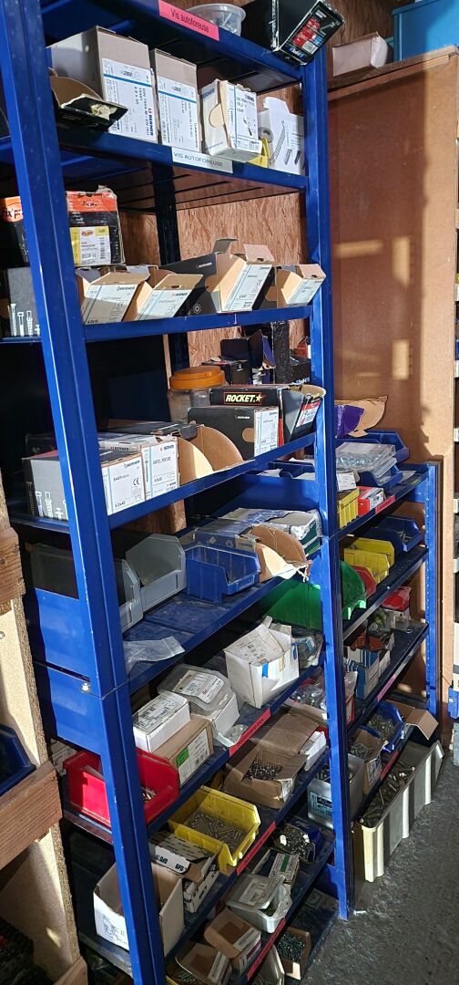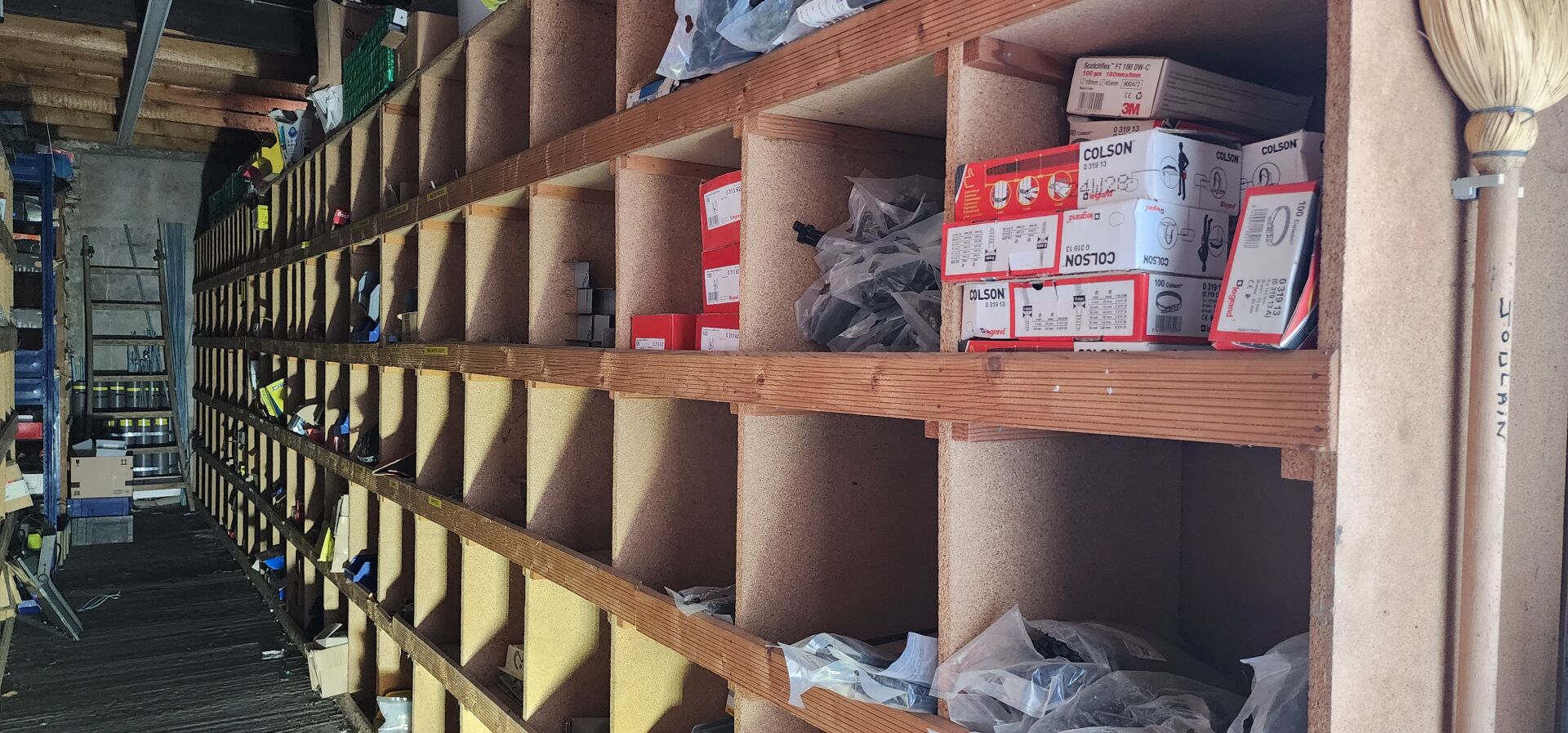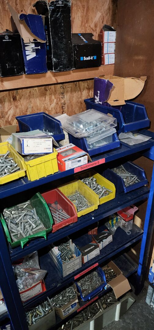 Le contenu de 9 étagères bois à cases comprenant : disjoncteurs et accessoires dont LEGRAND , SCHNEIDER etc..., porte-fusibles, rouleaux de fils électriques différents diamètres, fusibles différents ampérages, bornes, cosses pour cuivre, gaines thermorétractables, ampoules diverses dimensions et puissances, barrettes électriques, starters, blocs prises, raccords passe-câbles, boitiers de dérivation, prises électriques classiques et triphasées, douilles, lot de quincaillerie diverse dont chevilles, vis etc... notamment LEGRAND et SCHNEIDE