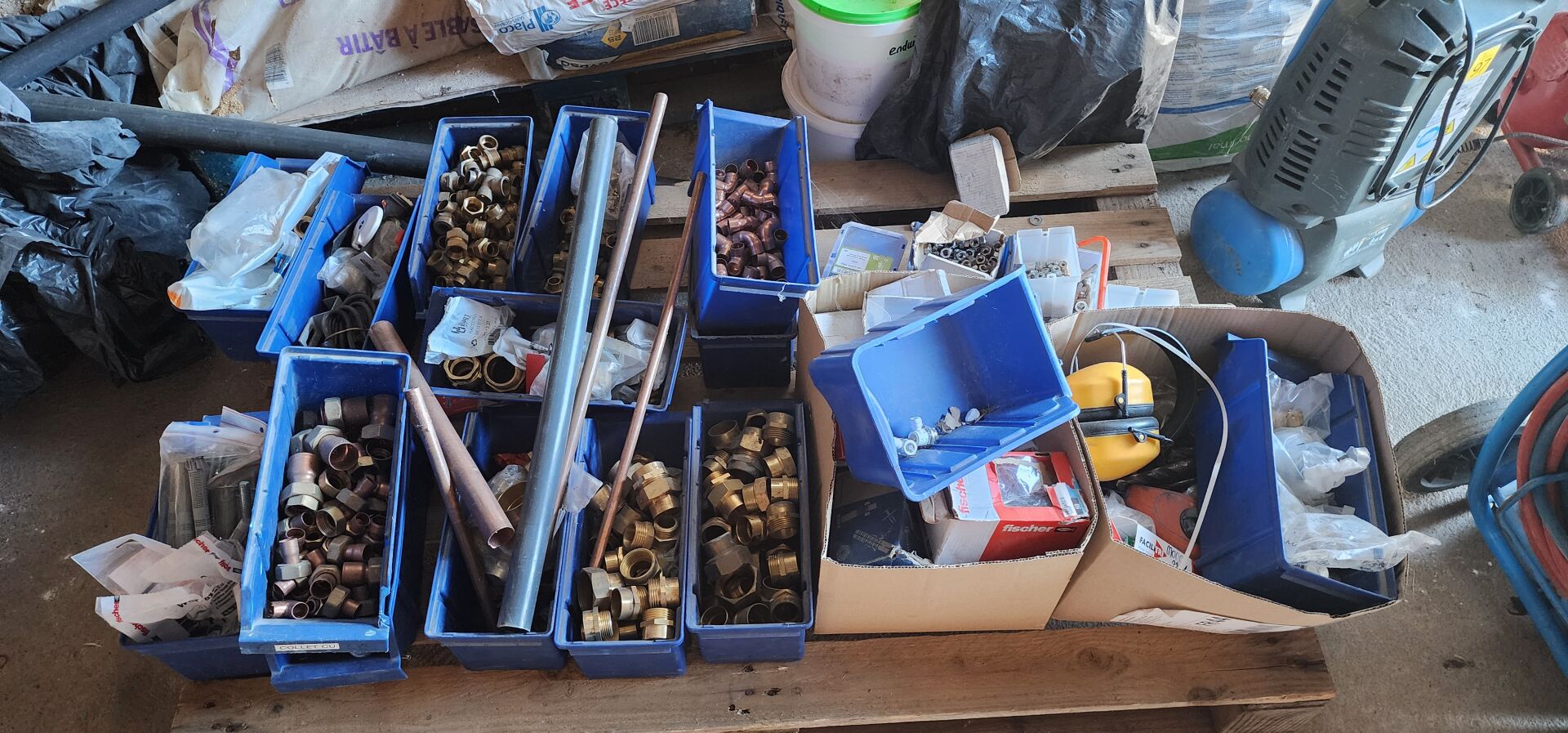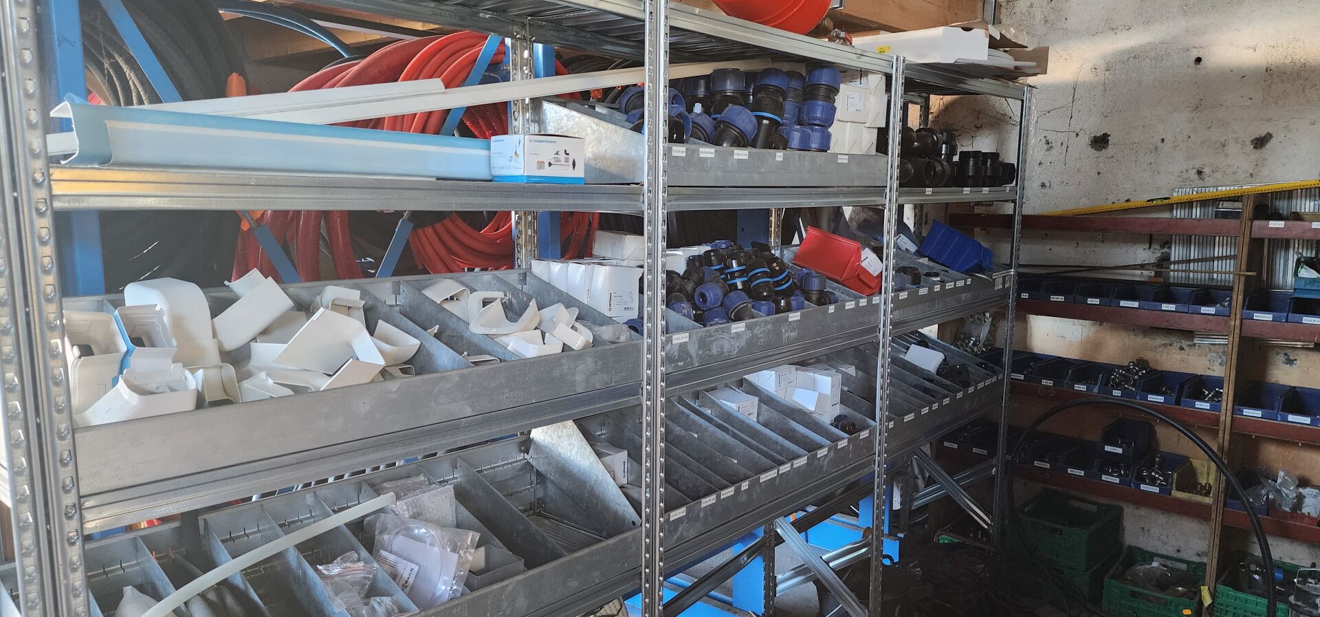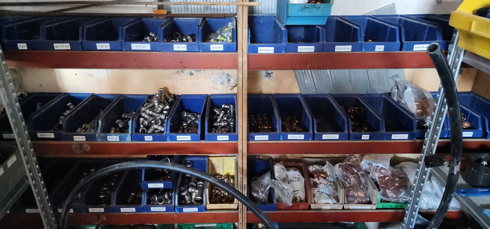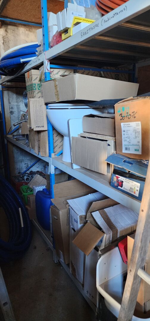 Dans un dépôt : le contenu des étagères comprenant accessoires et raccords pour plombier-chauffagiste, dont raccords laiton ou cuivre (manchons, bouchons, coudes, vannes) , raccords PVC NICOLL et raccords PVC haute pression, accessoires sanitaires, 1 bloc WC, 3 éviers, tubes cuivre, cuivre gainé, gaines etc...