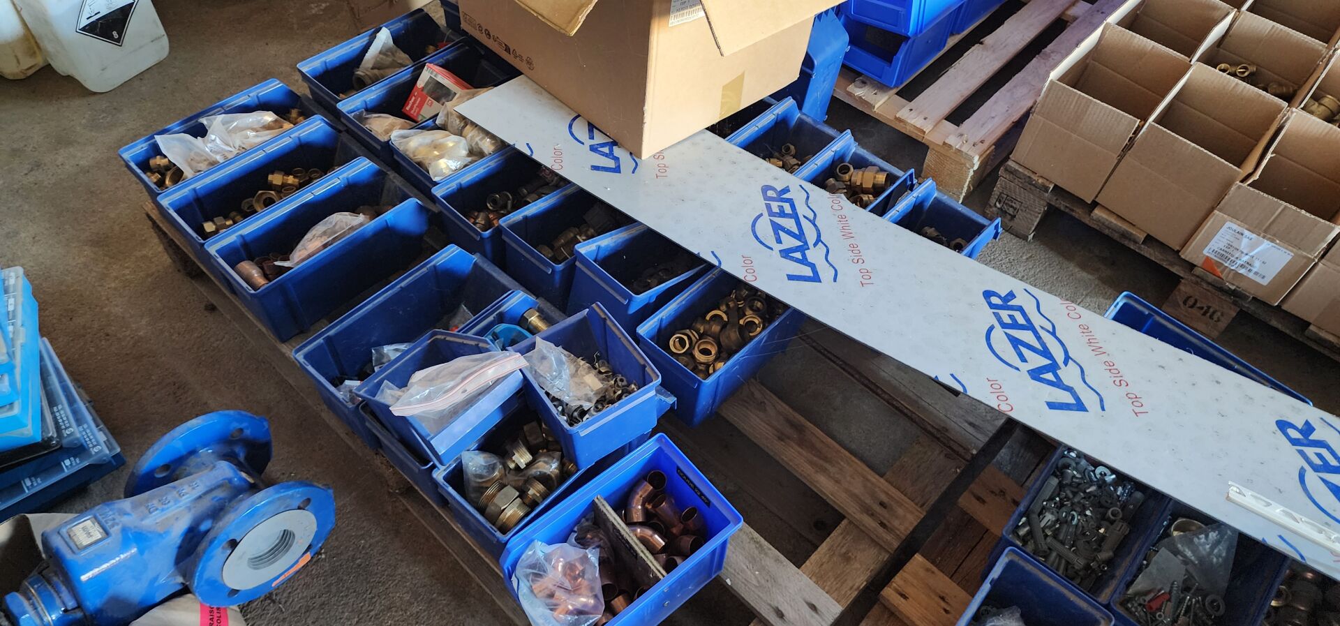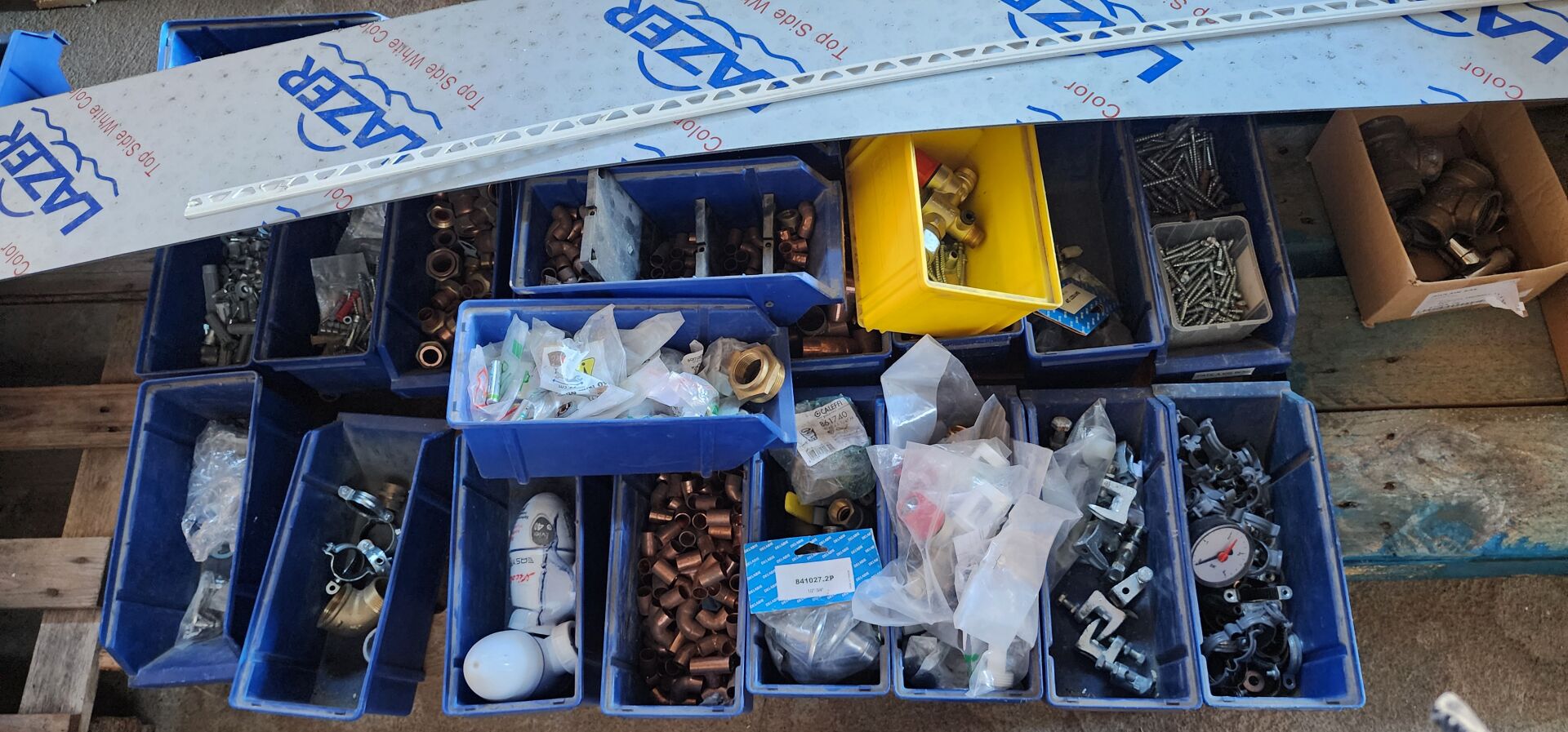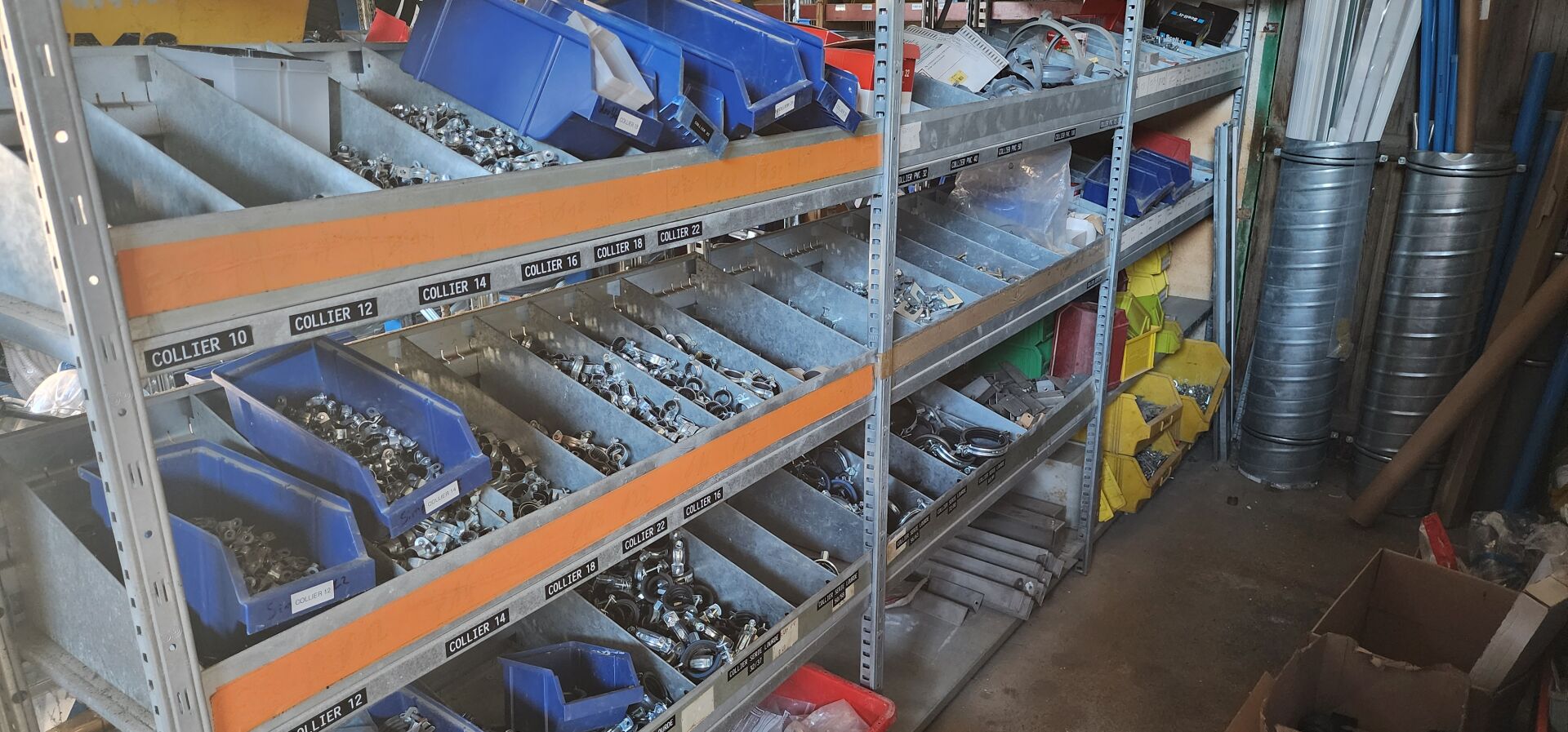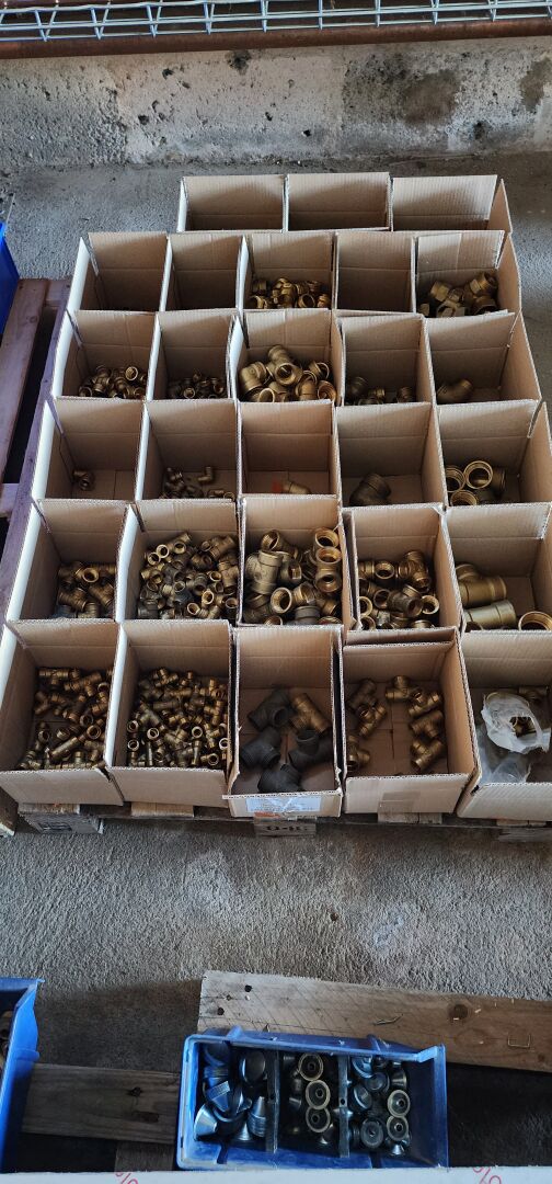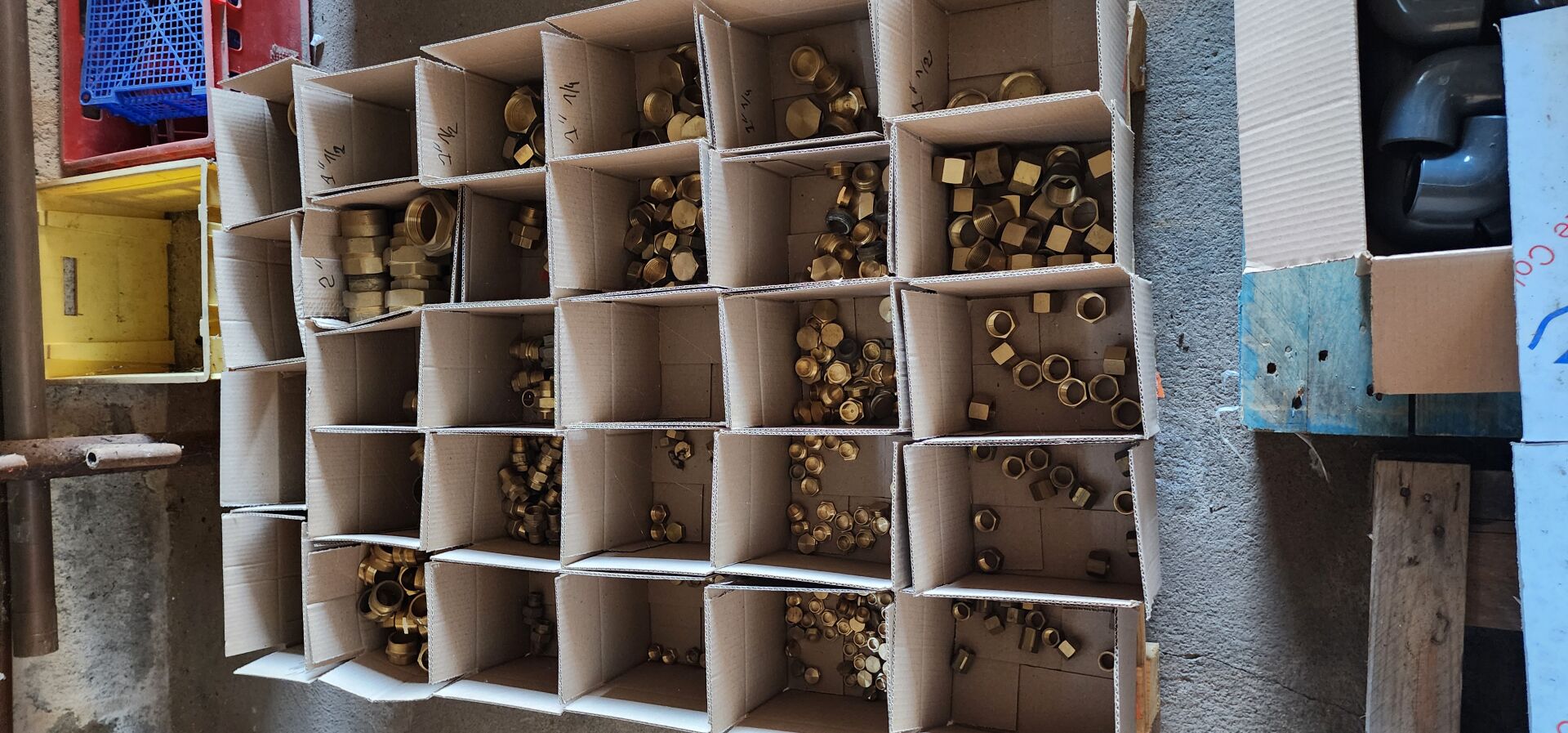 Dans un dépôt : le contenu des étagères comprenant accessoires et raccords pour plombier-chauffagiste, dont raccords laiton ou cuivre (manchons, bouchons, coudes, vannes) , raccords PVC NICOLL et raccords PVC haute pression, accessoires sanitaires, 1 bloc WC, 3 éviers, tubes cuivre, cuivre gainé, gaines etc...
