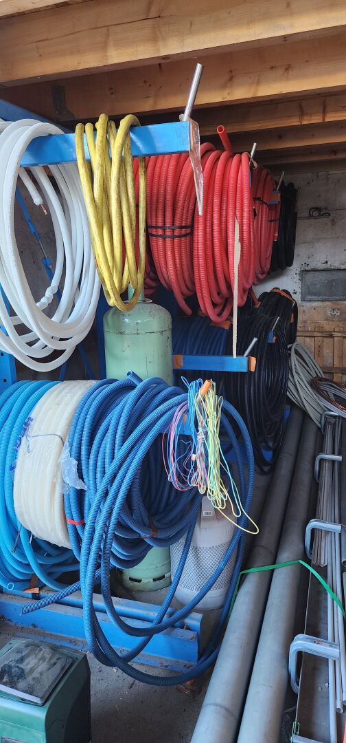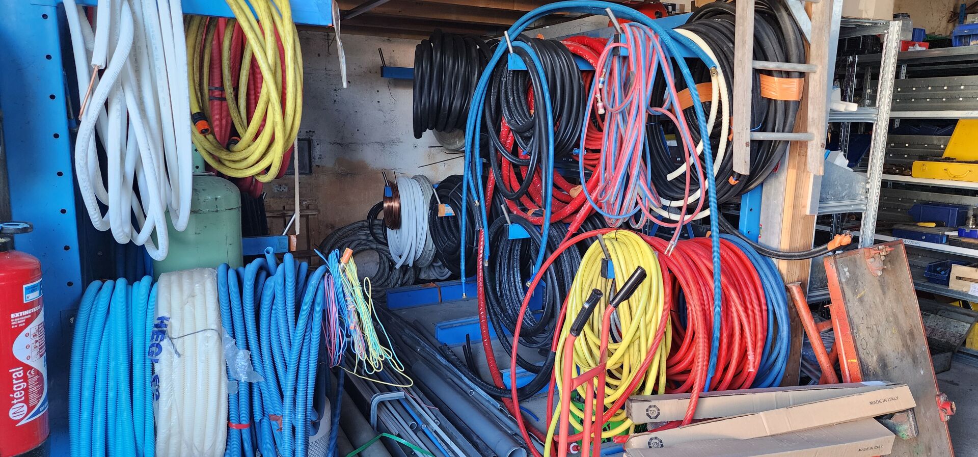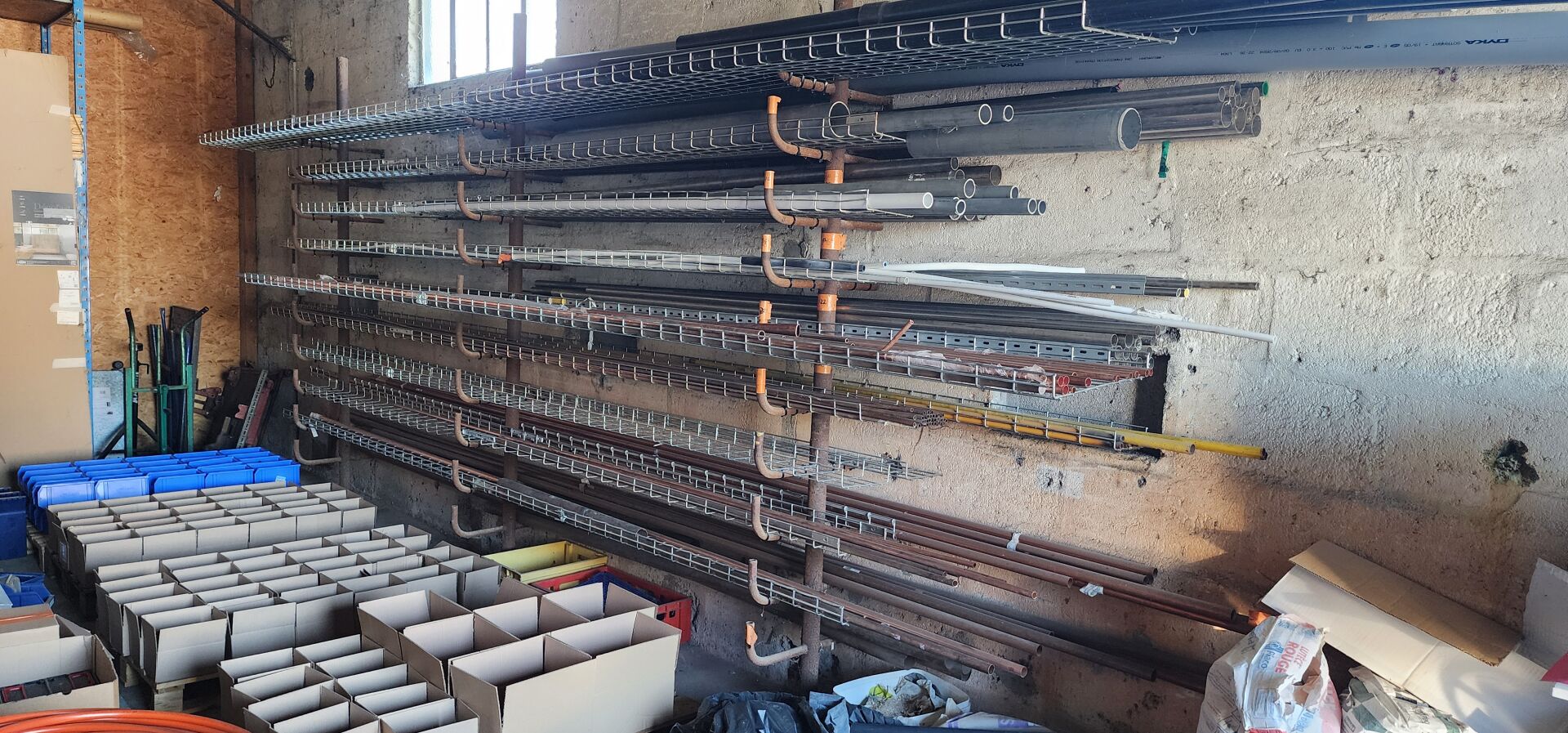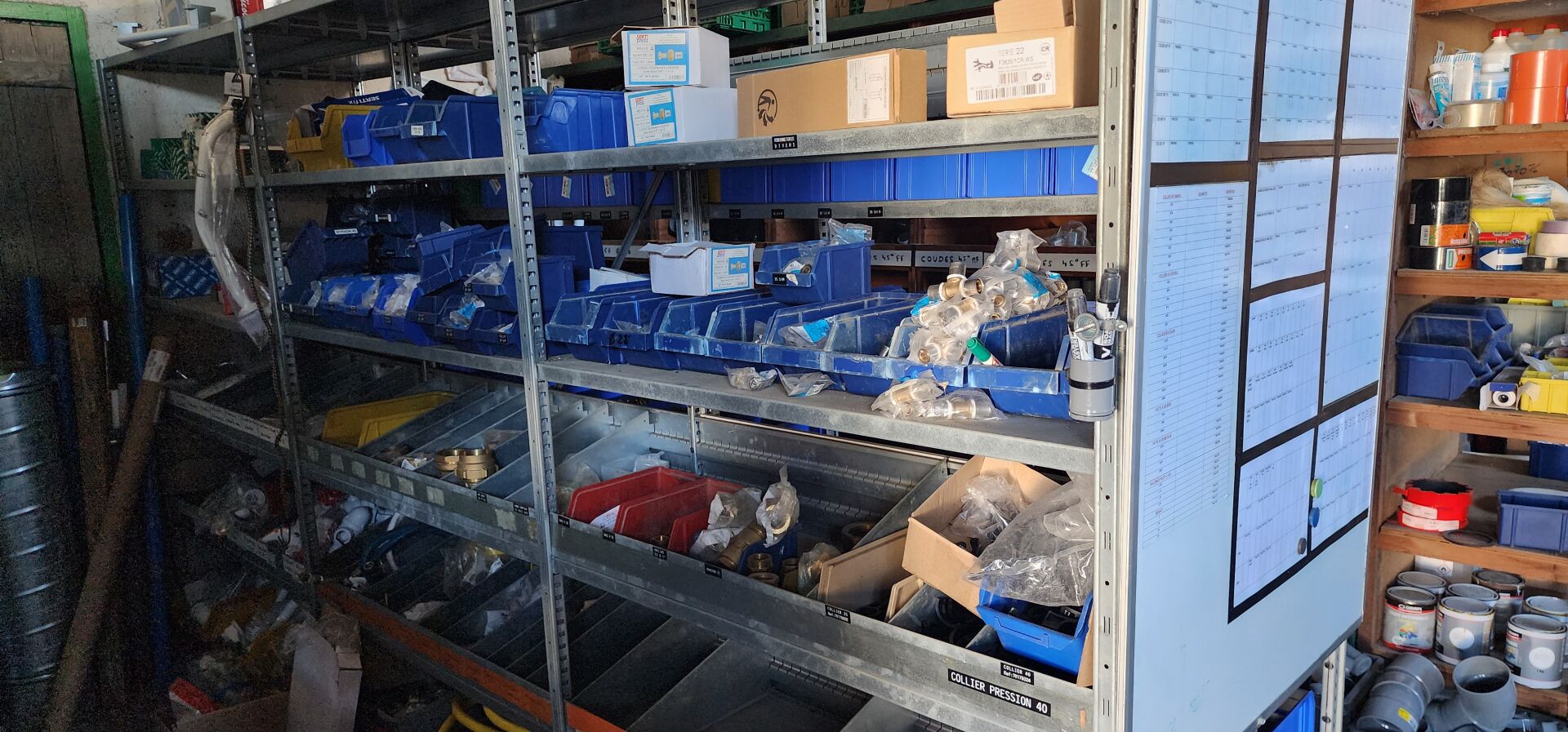 Dans un dépôt : le contenu des étagères comprenant accessoires et raccords pour plombier-chauffagiste, dont raccords laiton ou cuivre (manchons, bouchons, coudes, vannes) , raccords PVC NICOLL et raccords PVC haute pression, accessoires sanitaires, 1 bloc WC, 3 éviers, tubes cuivre, cuivre gainé, gaines etc...
